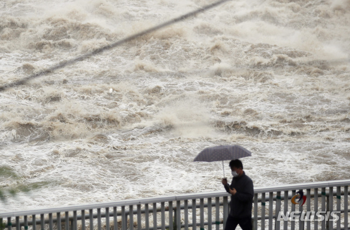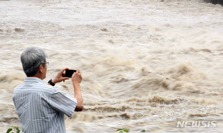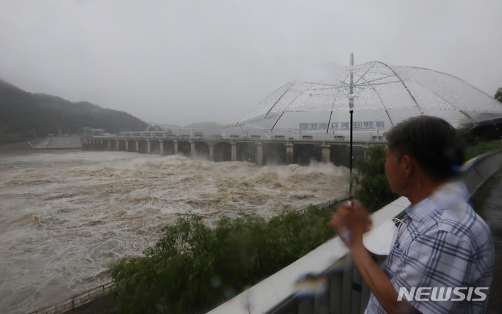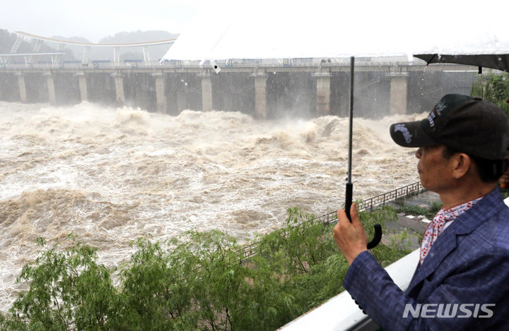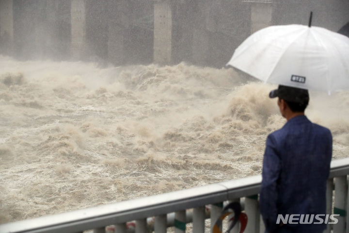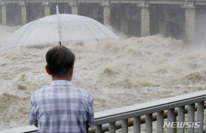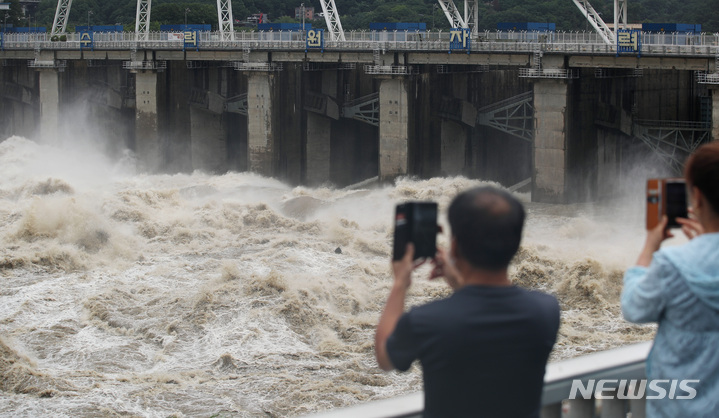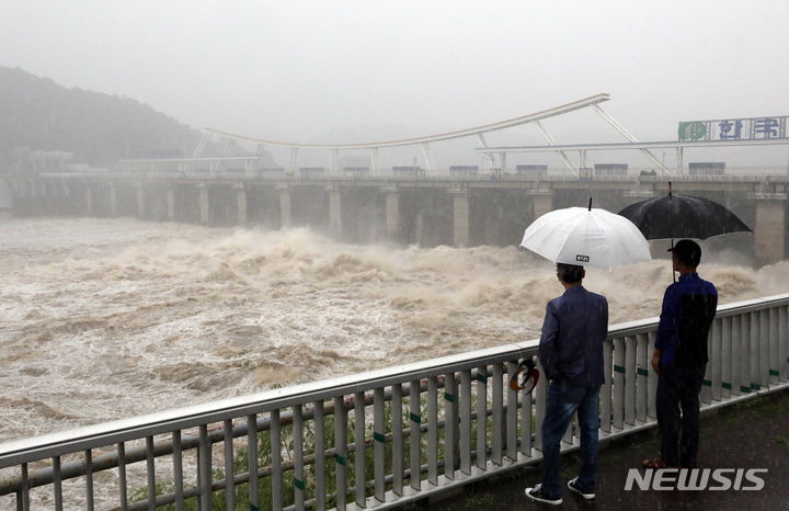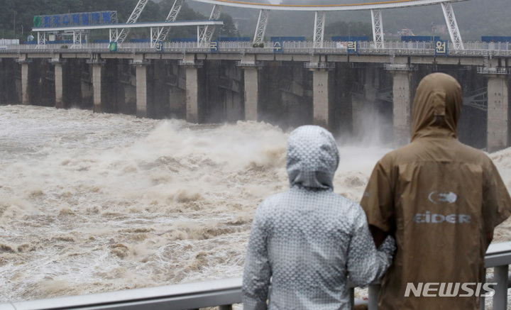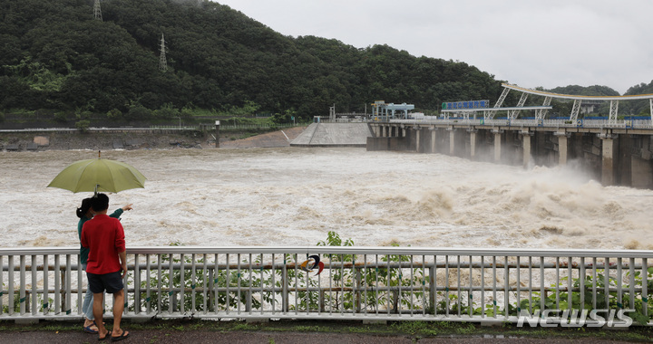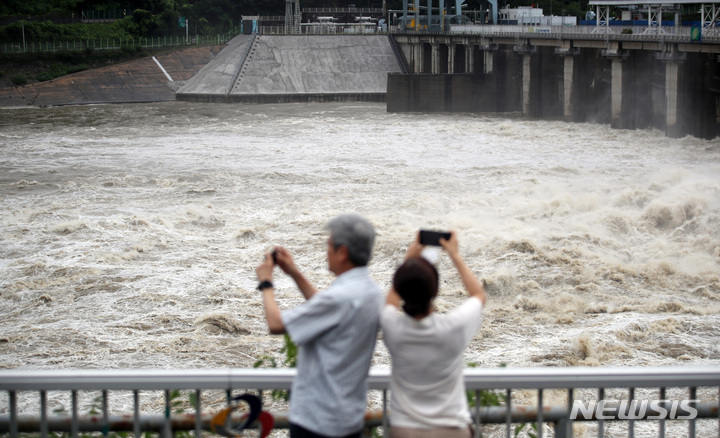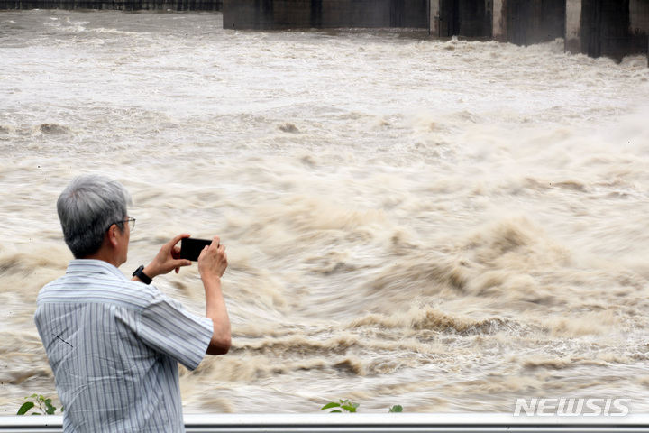 ソウルなど首都圏地域に大雨警報が発表された30日、京畿道河南市の八堂ダム付近では、市民が集中豪雨により放流中のダムを眺めていた。