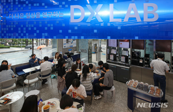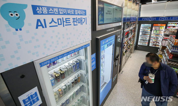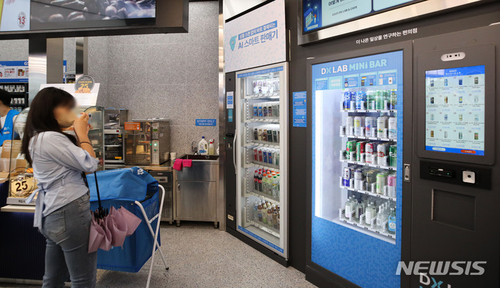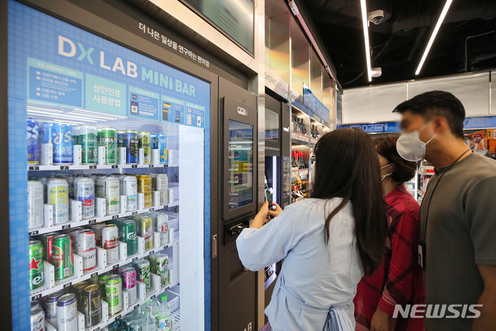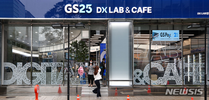 GS25が、小売流通事業に情報通信技術を適用した「リテールテック」コンビニ「DX LAB」店をオープンさせた。DX LAB店には、顔面認識決済ソリューションや人工知能(AI)店舗異常検知システム、無人運営店防犯ソリューション、映像認識デジタルサイネージ、デジタルメディアウォール、酒類無人販売機など、19の技術が用いられている。写真は30日午後、ソウル市江南区のGS25 DX LAB店の様子。