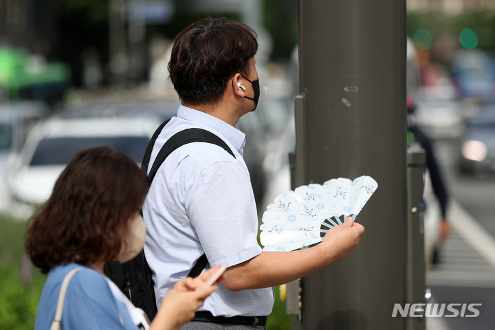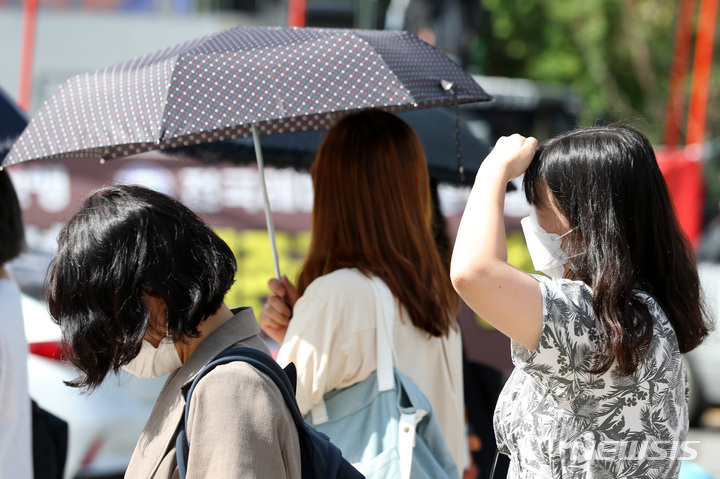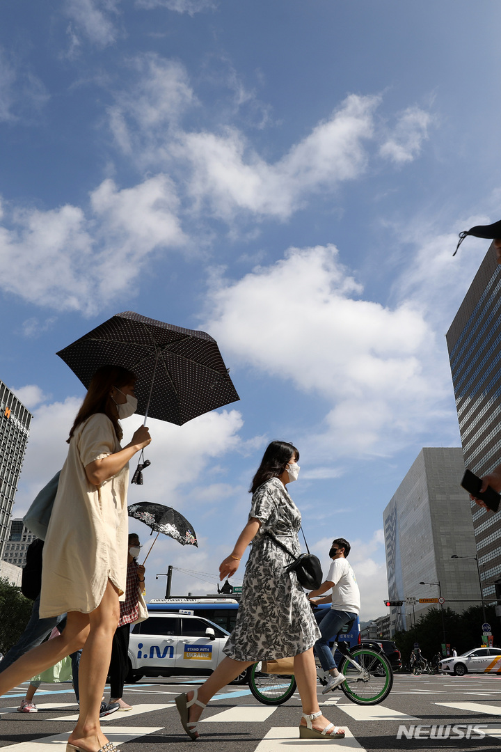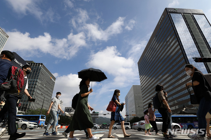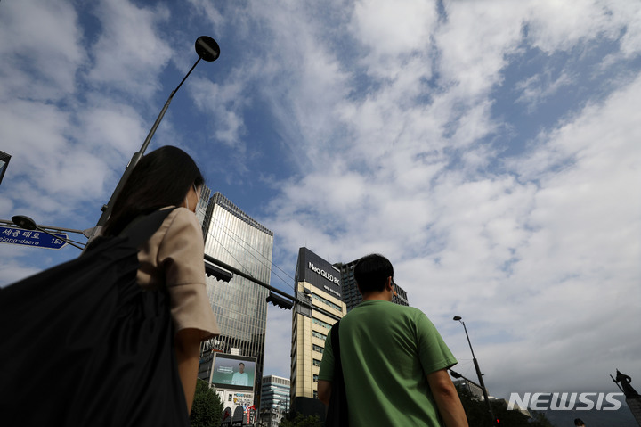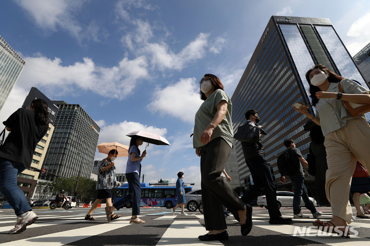 晴天となった1日午前、ソウル市鍾路区の世宗大路付近を通勤する市民たち。