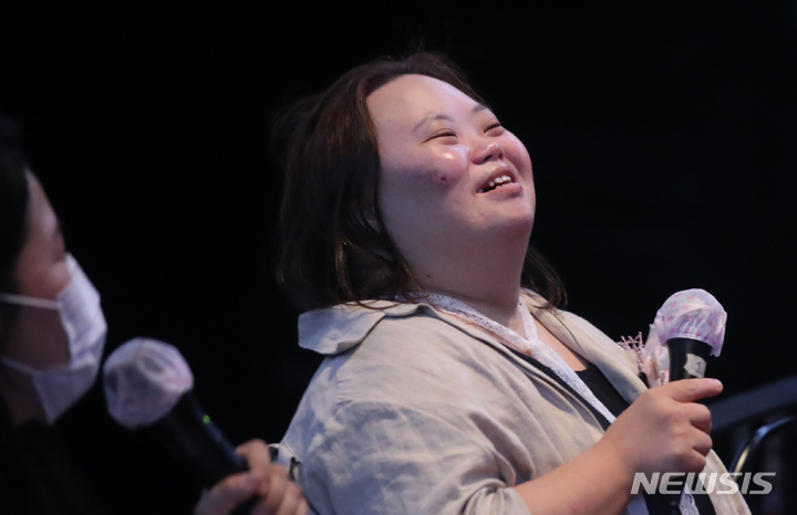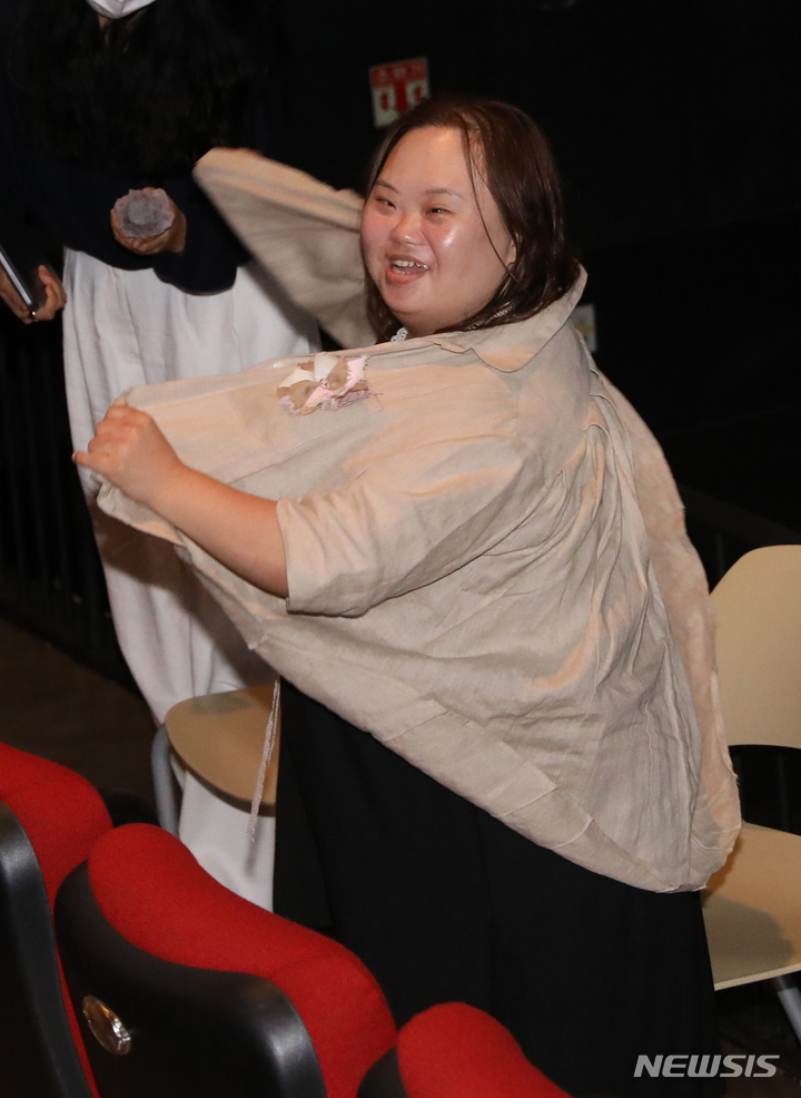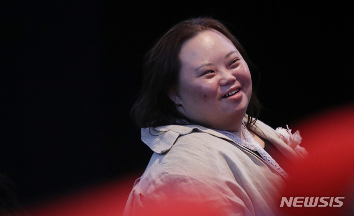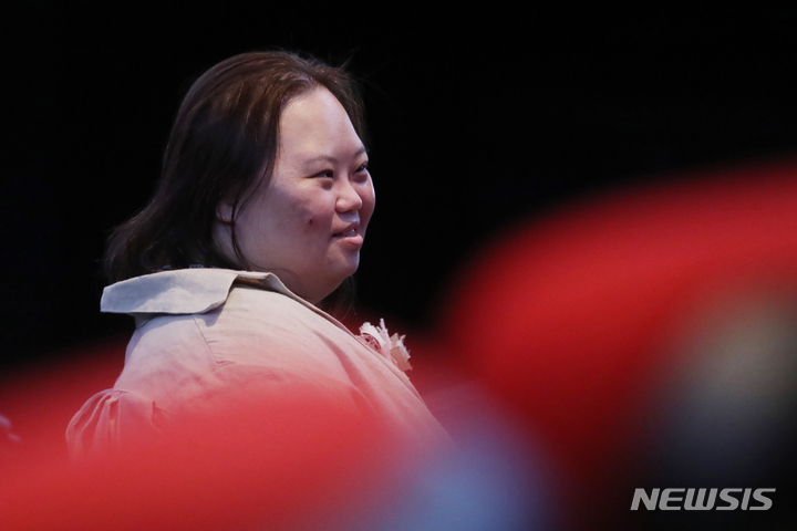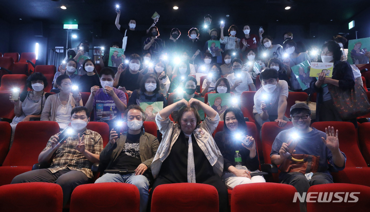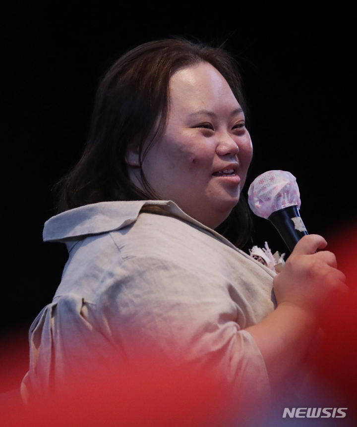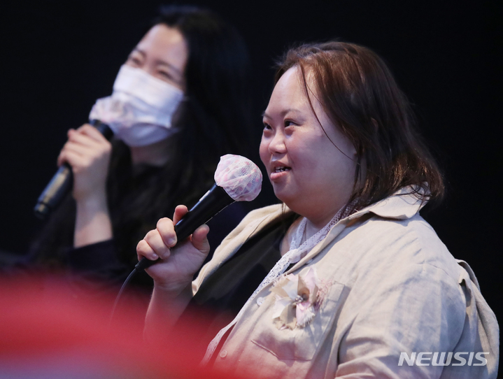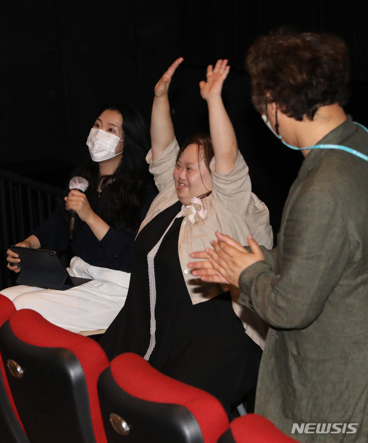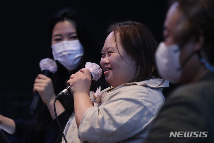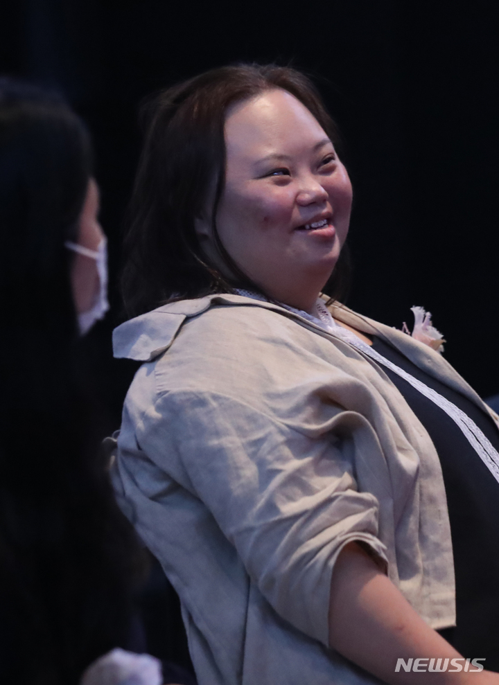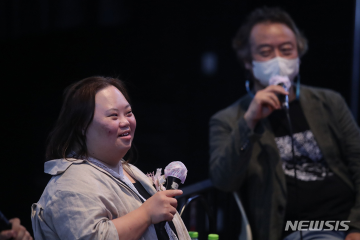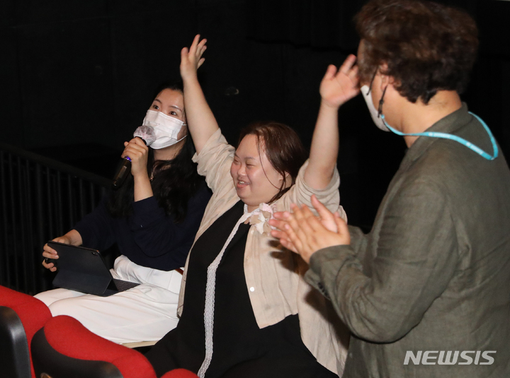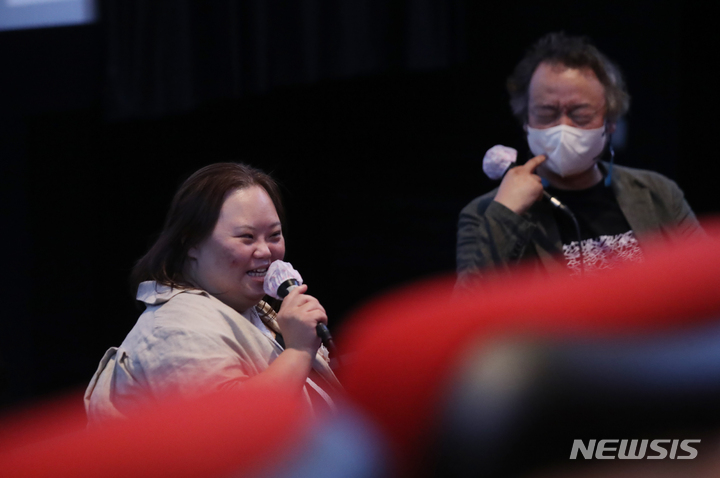 ドキュメンタリー映画『君の顔』(ソ・ドンイル監督)の観客との対話イベントが開かれた1日午後、梨花女子大内にあるミニシアター「アートハウス・モモ」(ソウル市西大門区)で、観客からの質問に答える脚本家チョン・ウンヘの様子。脚本家チョン・ウンヘは最近、『私たちのブルース』でヨンウク(ハン・ジミン)の姉ヨンヒ役を熱演した。