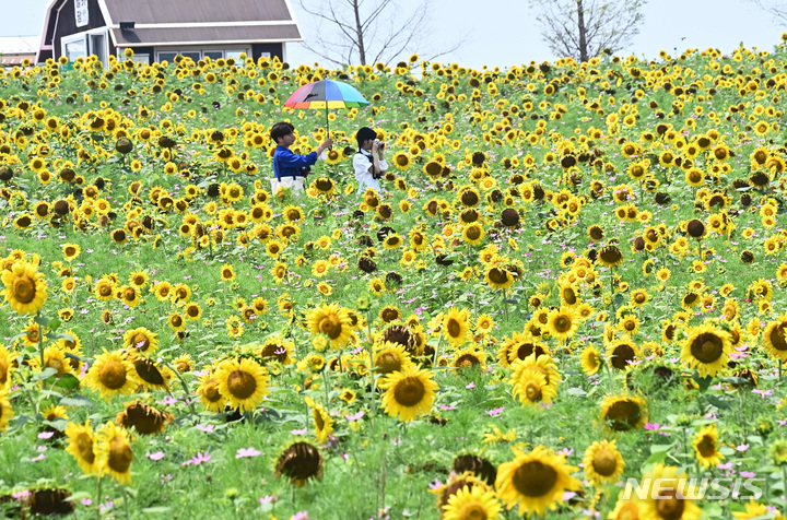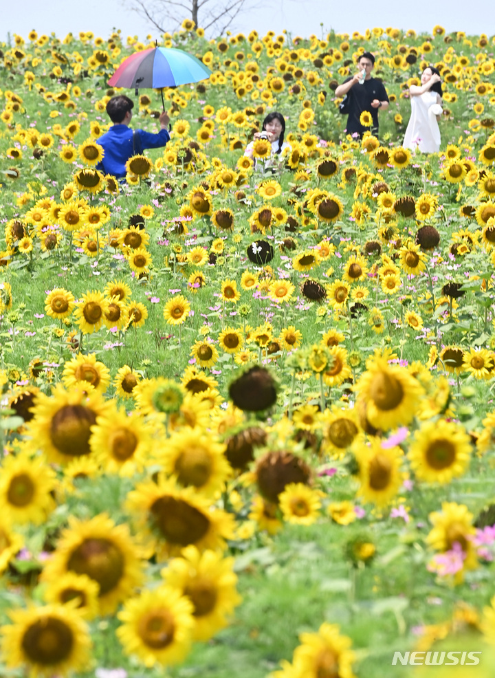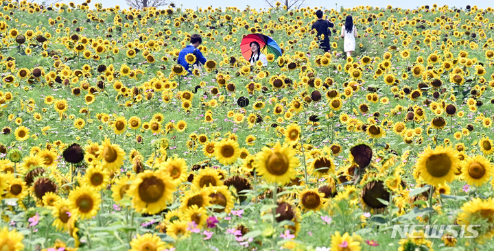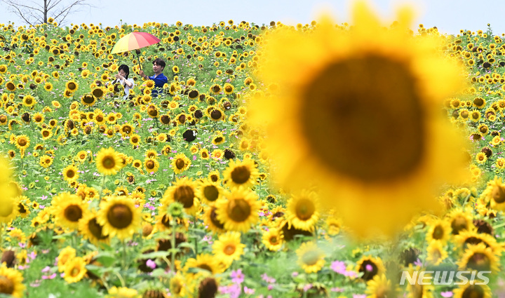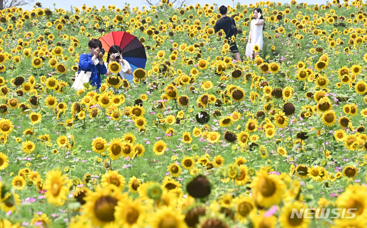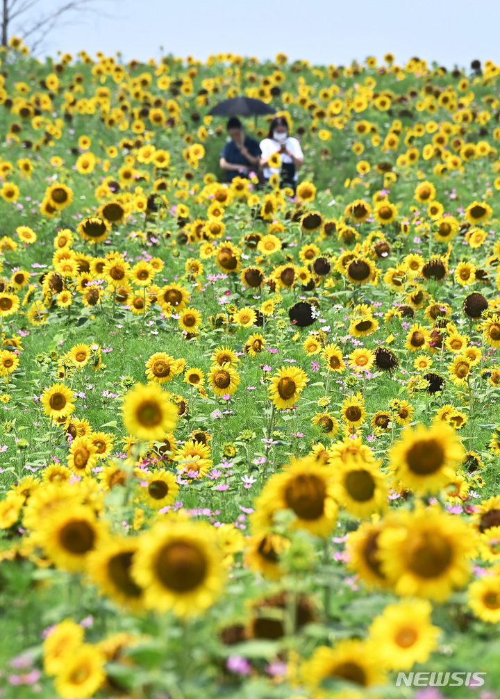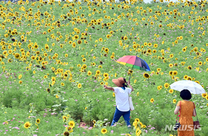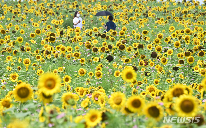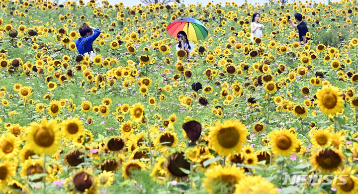 【NEWSIS】梅雨の合間に日が差した3日、京畿道安城市内の「安城ファームランド」を訪れ、満開のヒマワリ畑を歩く人々。