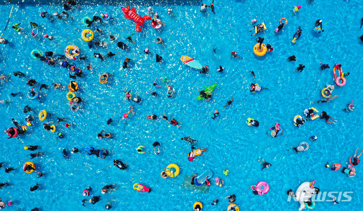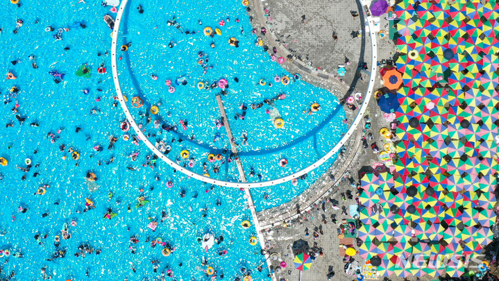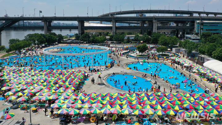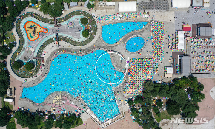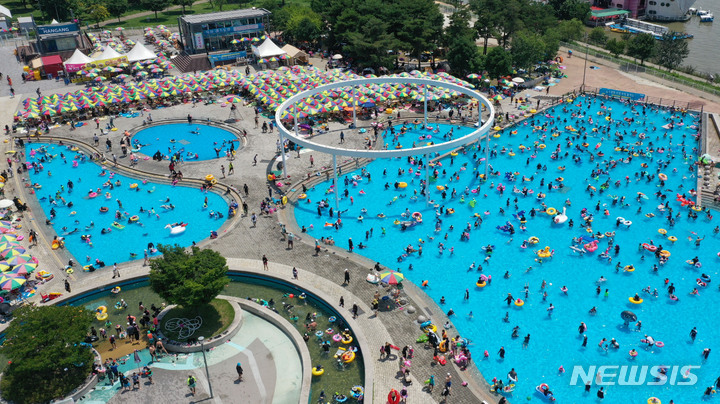 【NEWSIS】ソウル市をはじめ全国各地に猛暑注意報が発令された3日午後、ソウル市広津区内のトゥクソム漢江公園プール。暑さをしのごうと水遊びに来た人々でにぎわっていた。