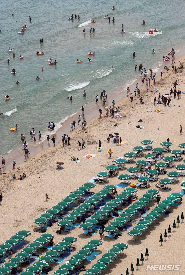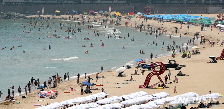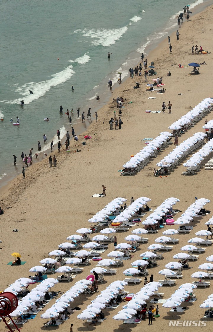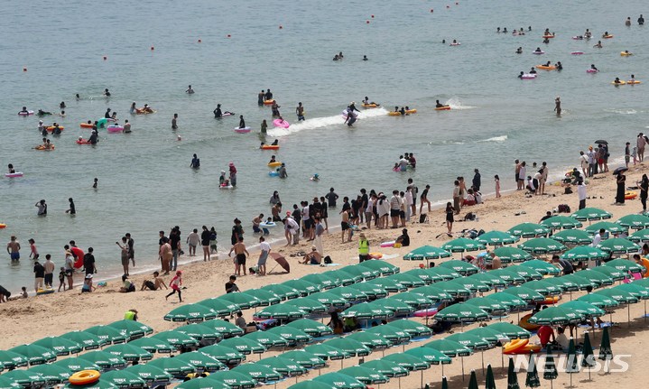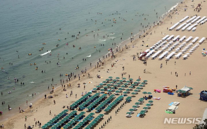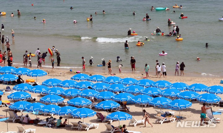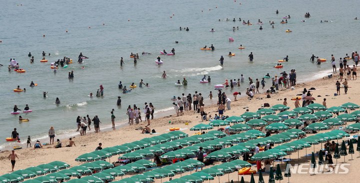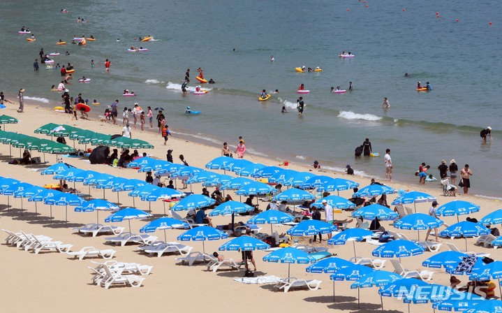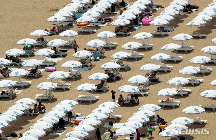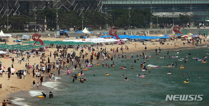 【NEWSIS】釜山市内の七つの海水浴場で海開きが行われて初めての日曜日だった3日、海雲台海水浴場を訪れた海水浴客たち。