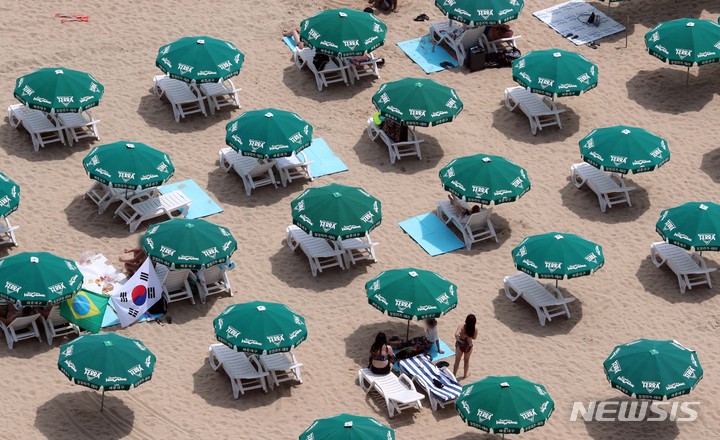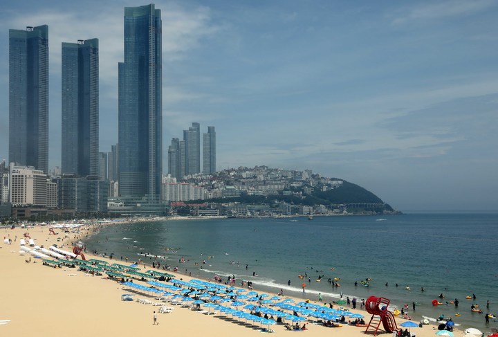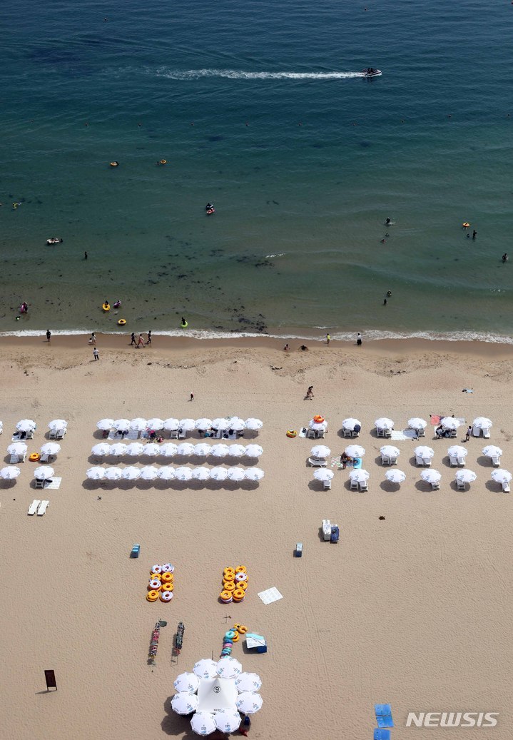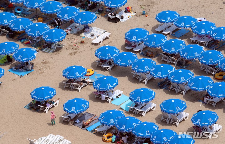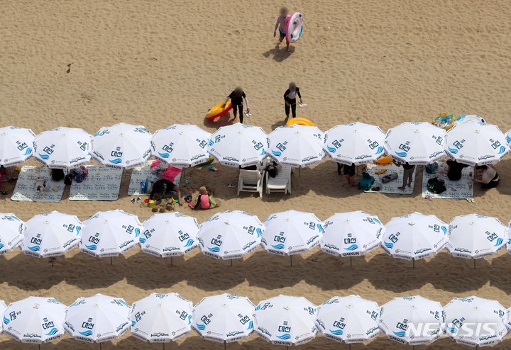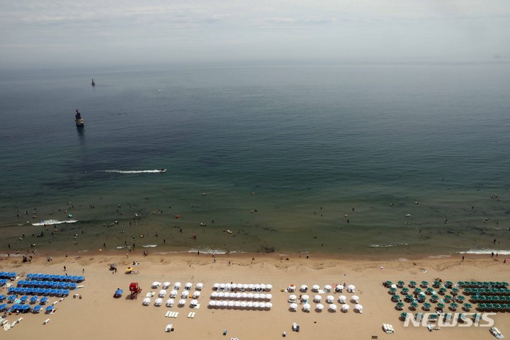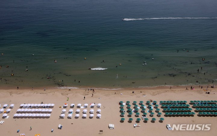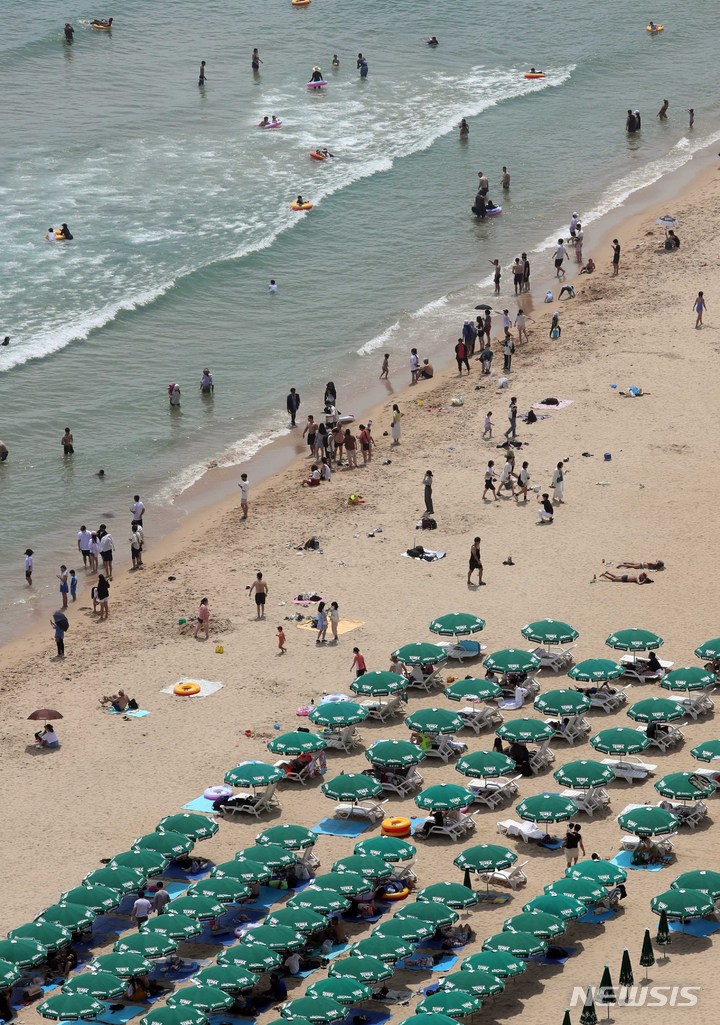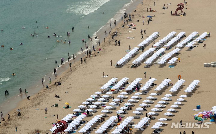 【NEWSIS】釜山市内の七つの海水浴場で海開きが行われて初めての日曜日だった3日、海雲台海水浴場を訪れた海水浴客たち。