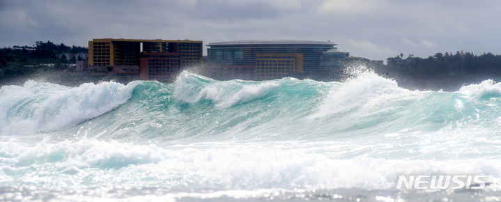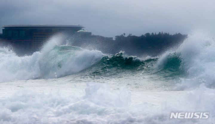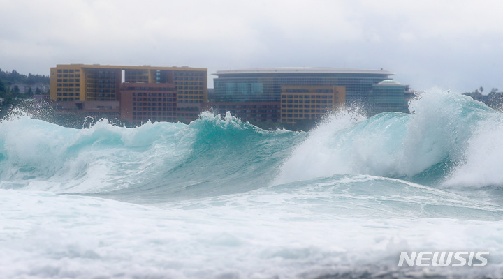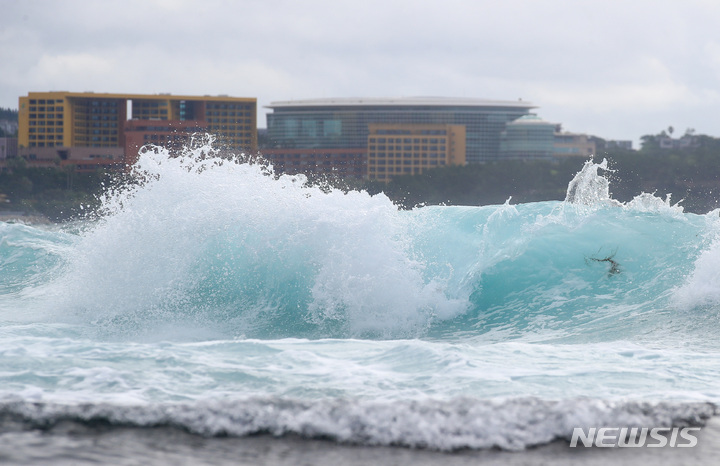 台風4号の影響によりくもった天気の4日午前、済州道西帰浦市猊来洞沖には荒波が押し寄せていた。気象庁によると、済州道南部の沖合には台風注意報が発表されたという。
