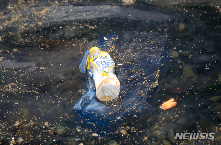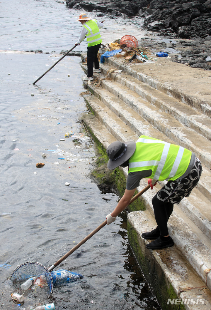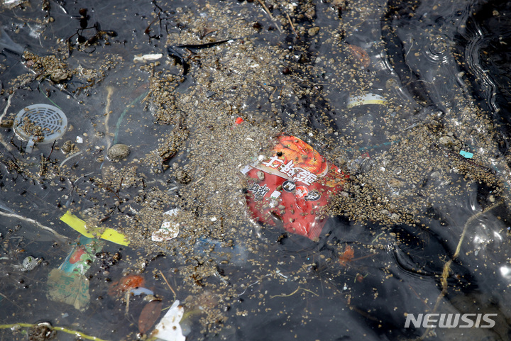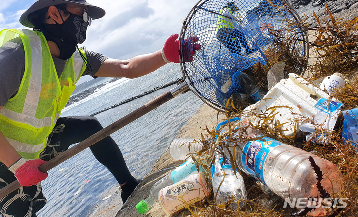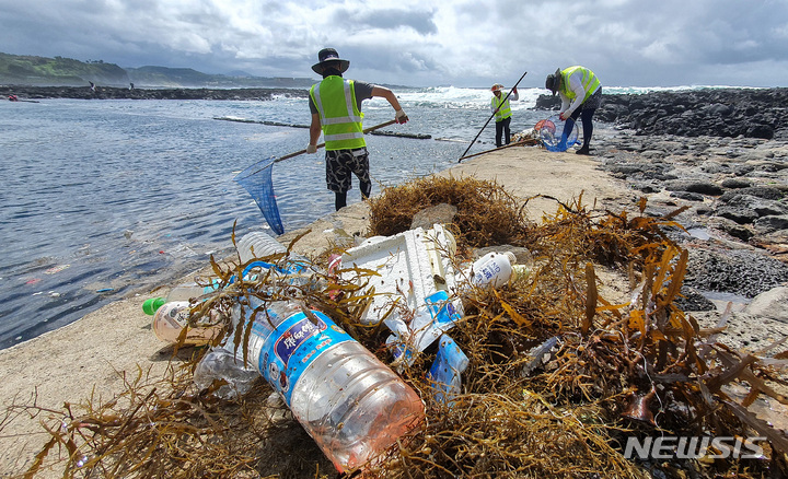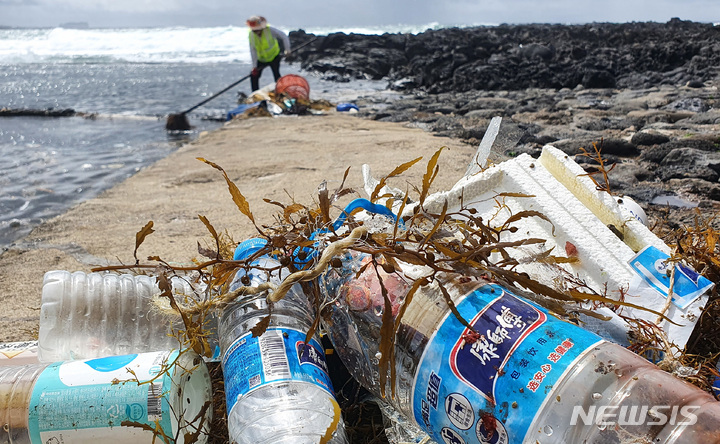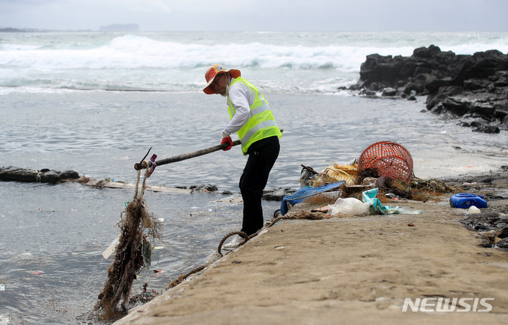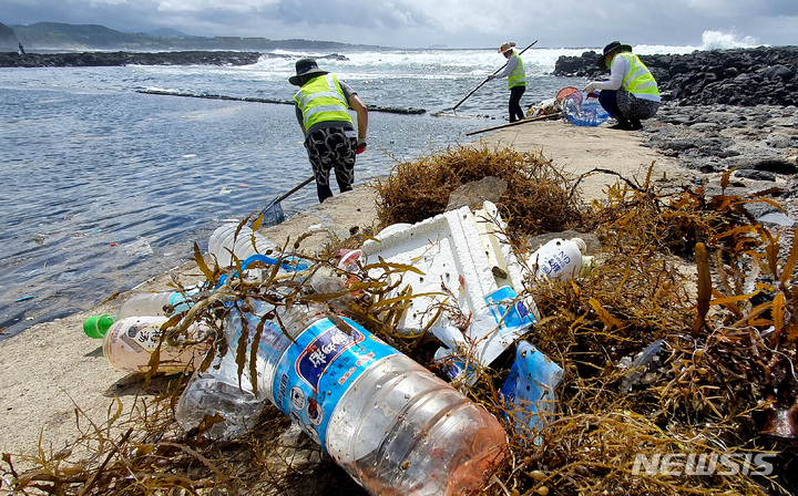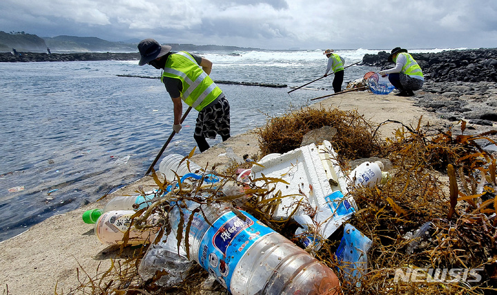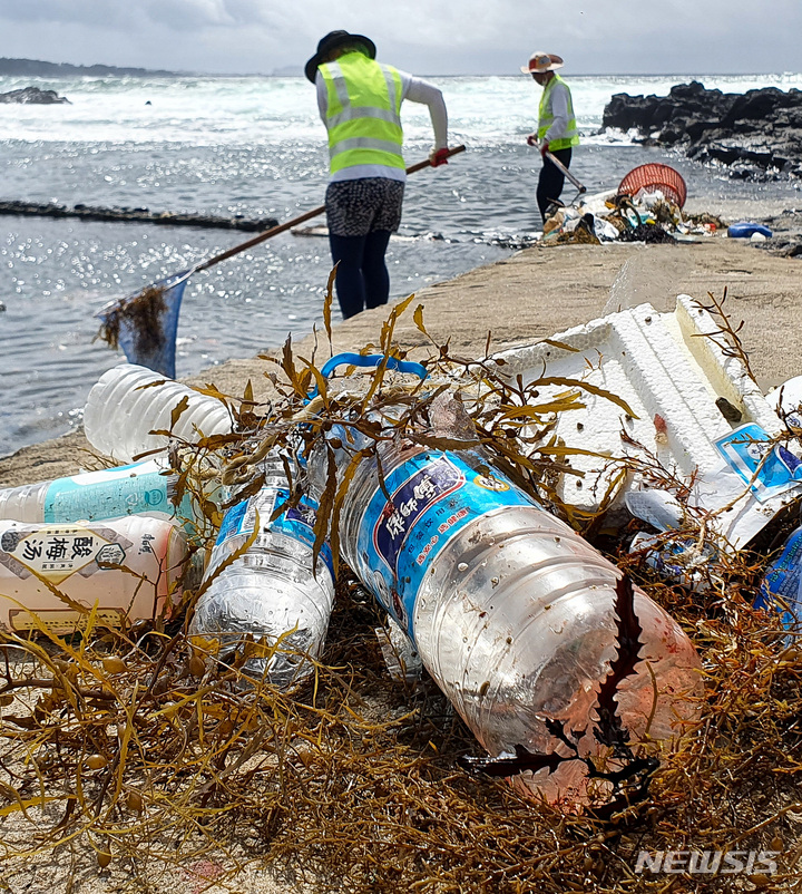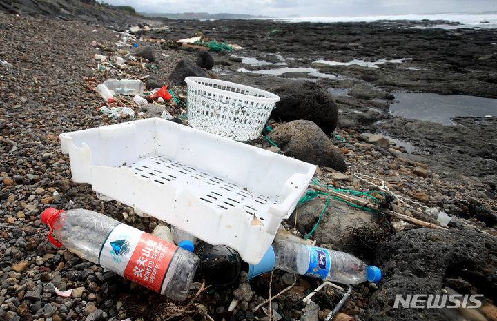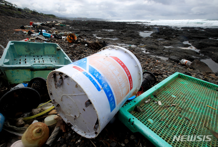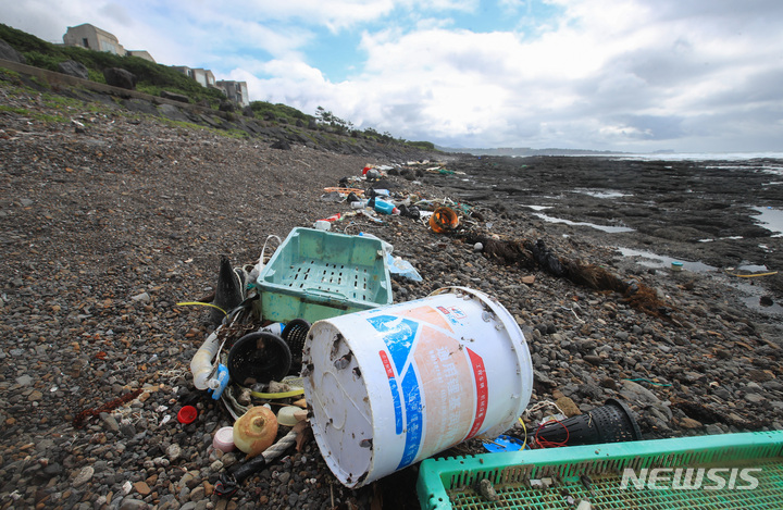 台風4号(アジア名:アイレー)の間接的影響で高い波が発生している4日午前、済州島西帰浦市猊来洞付近の海岸には、中国から流れ着いた海洋ゴミが散らばっていた。