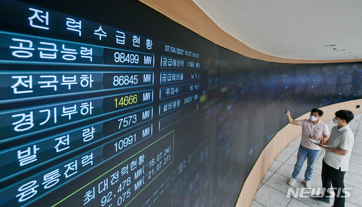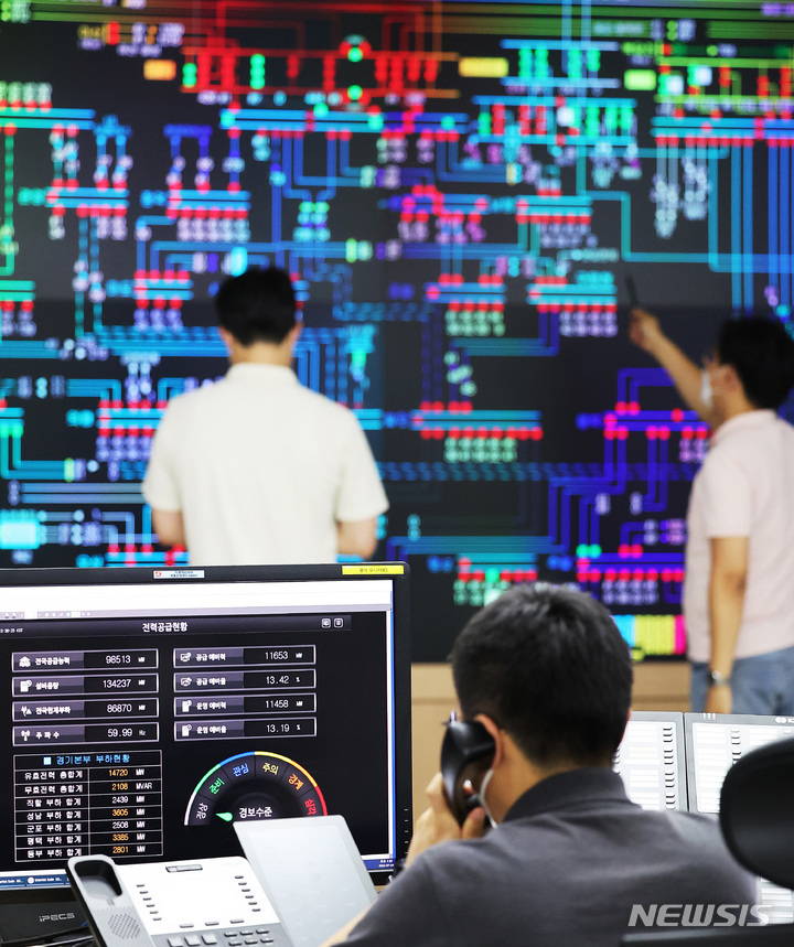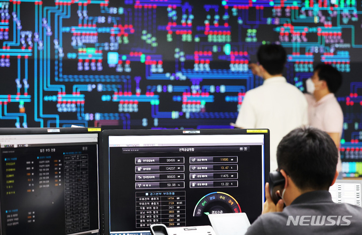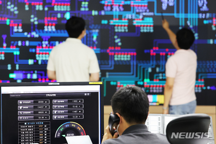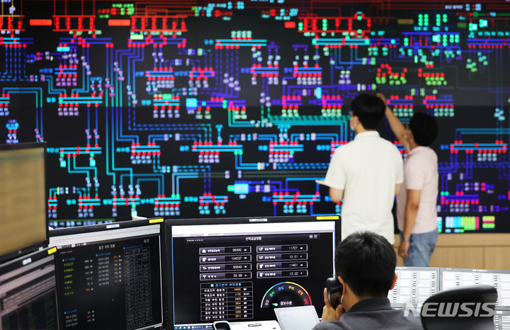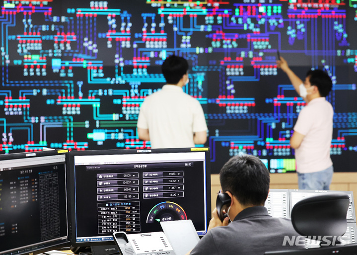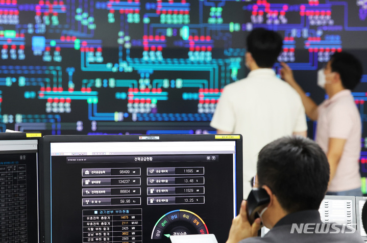 連日の猛暑で電力需要が増加している4日午後、京畿道水原市霊通区の韓国電力公社京畿地域本部電力管理処系統運営センターで、関係者らが電力需給現況を点検しているところ。
