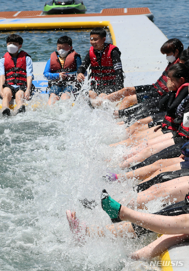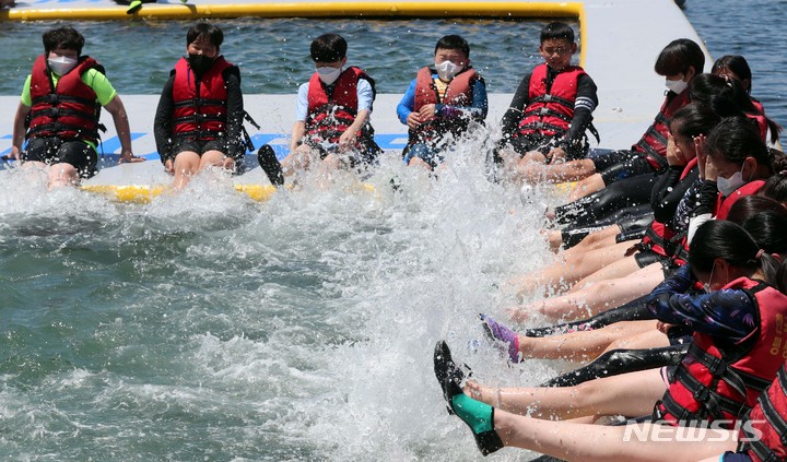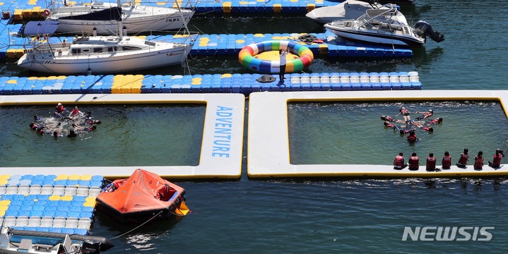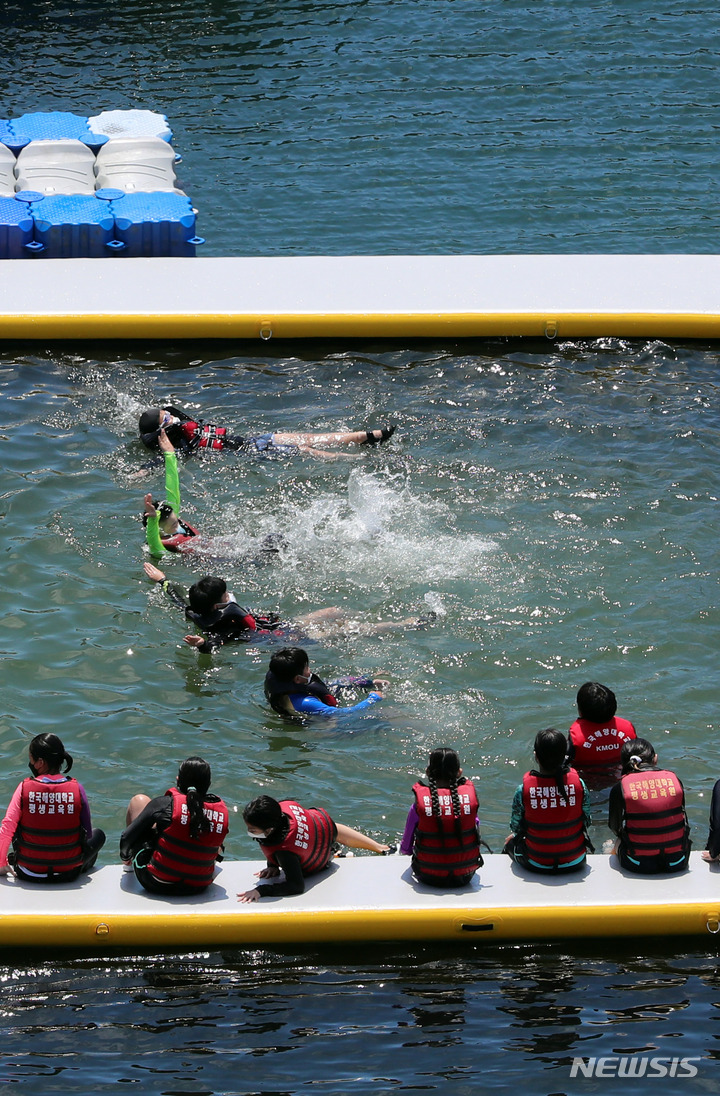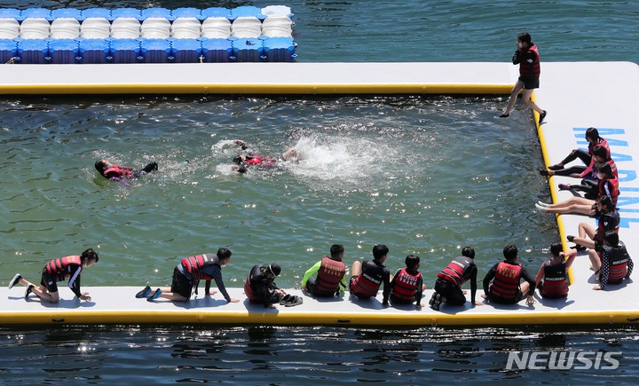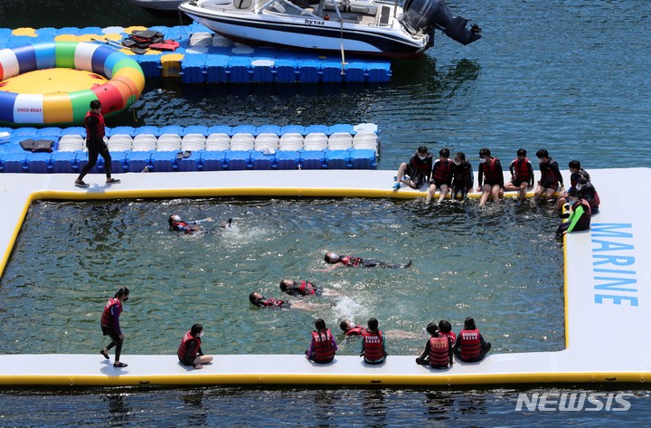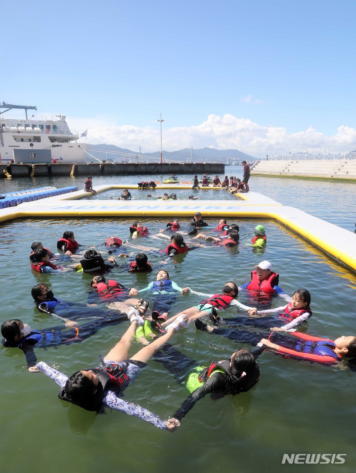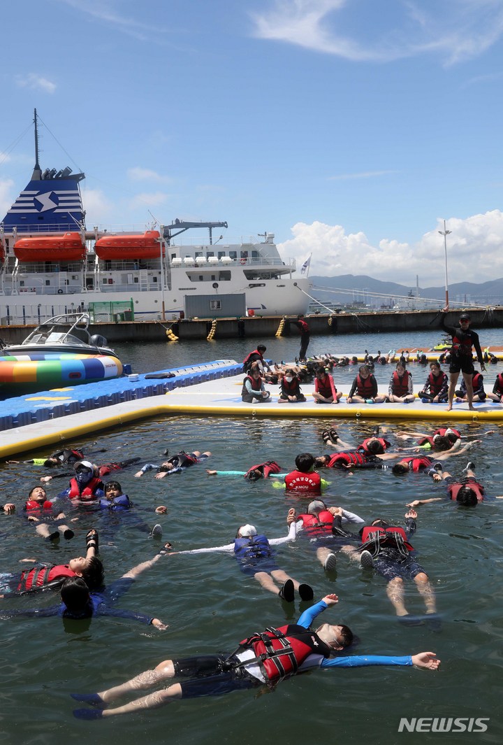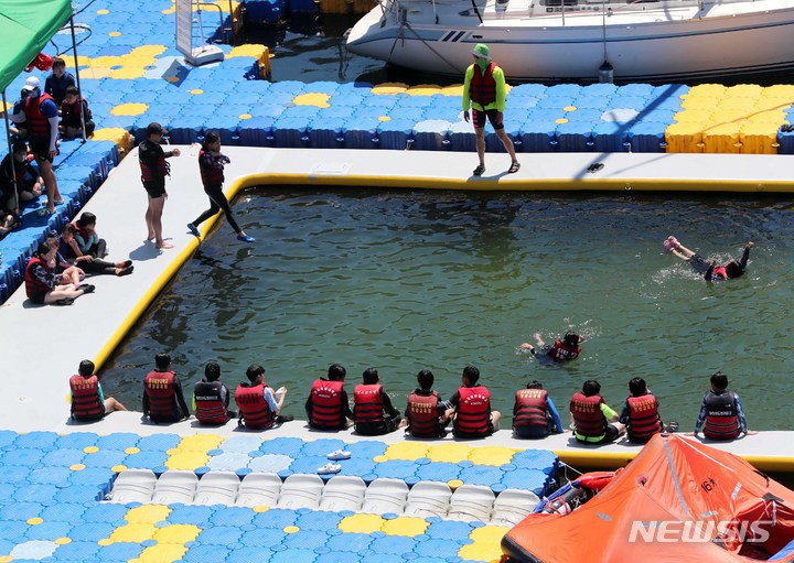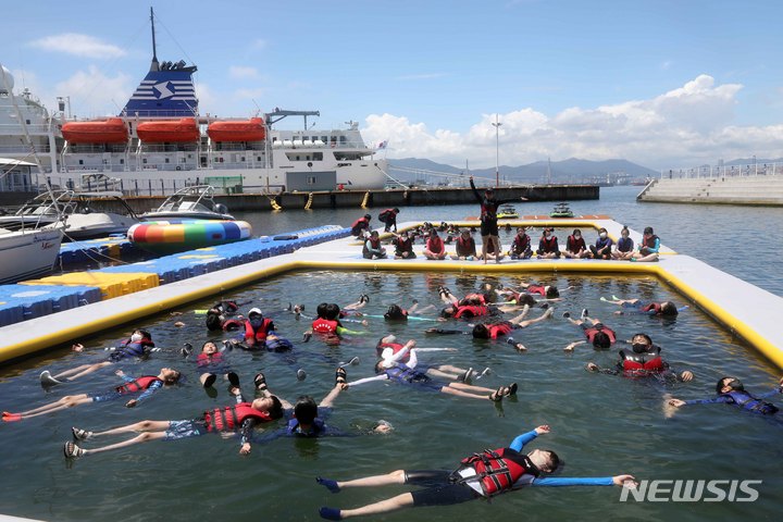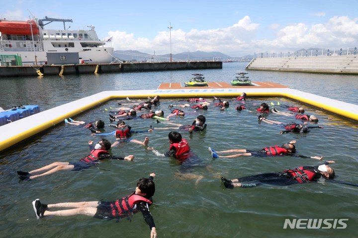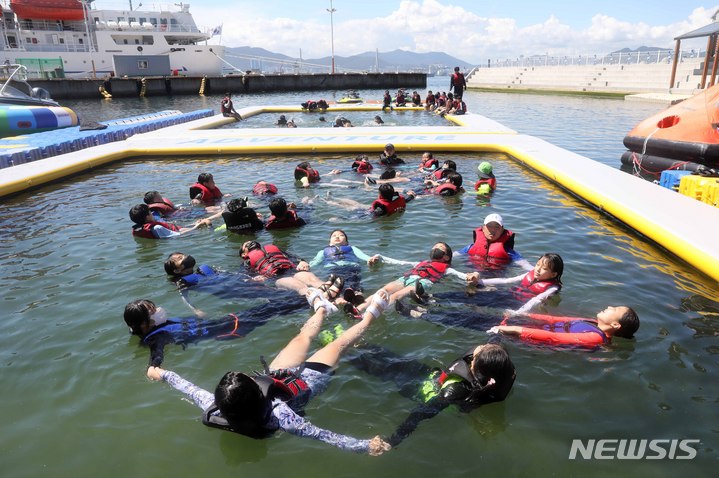 猛暑注意報が発令中の4日、韓国海洋大学(釜山市影島区)で開かれた「2022年 海の初等生存水泳」に参加した児童が生存水泳講習を受けているところ。韓国海洋大学生涯教育院は今月21日まで、地域の小学校8校の児童およそ470人を対象に、海での生存水泳講習を試験的に実施する。