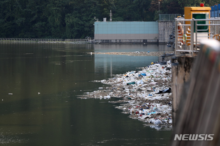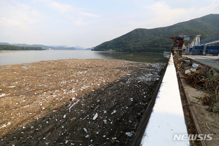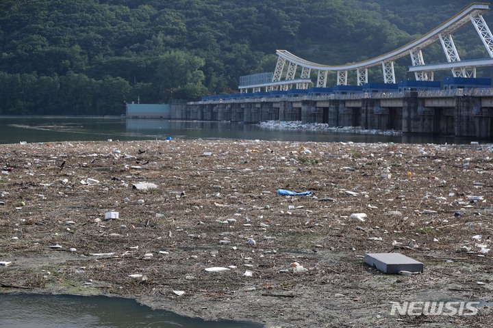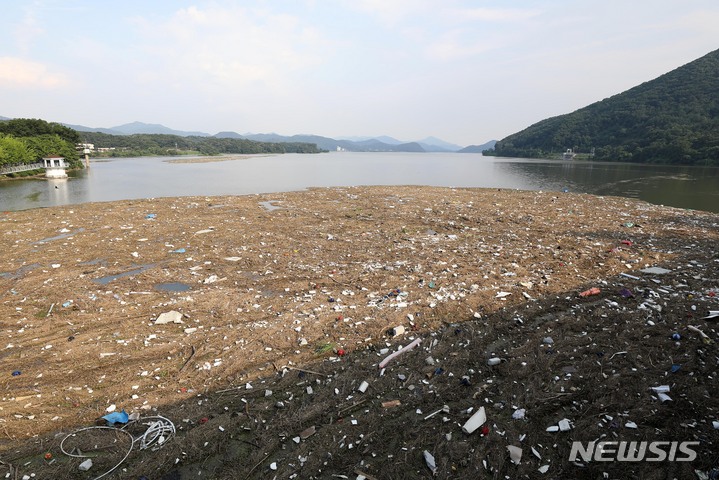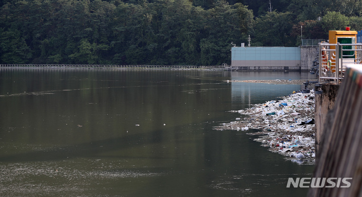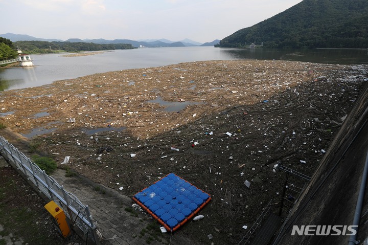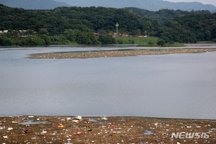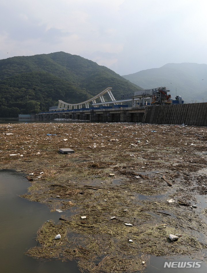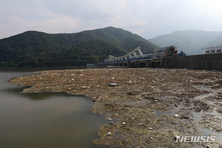 【NEWSIS】4日午後、京畿道河南市内の八堂ダムには、梅雨の大雨などで流れ込んだ流木などがたまっていた。