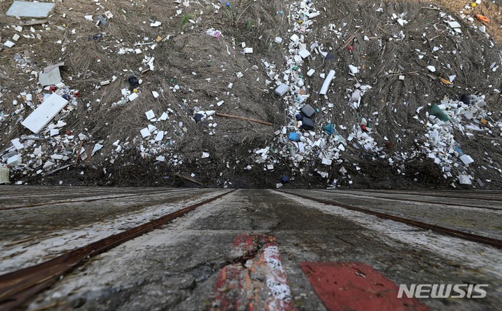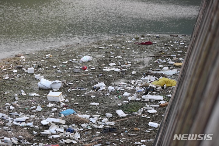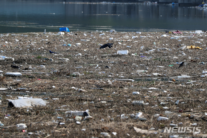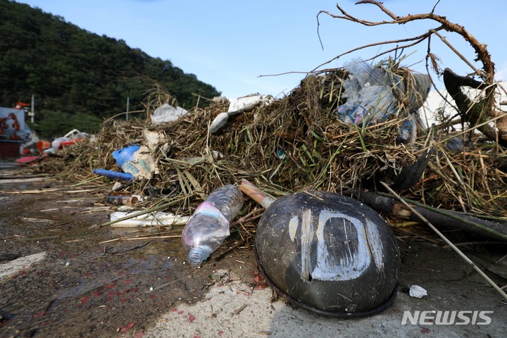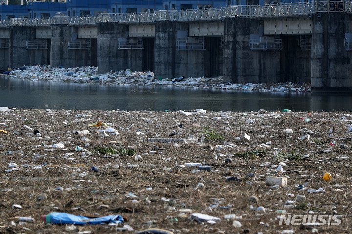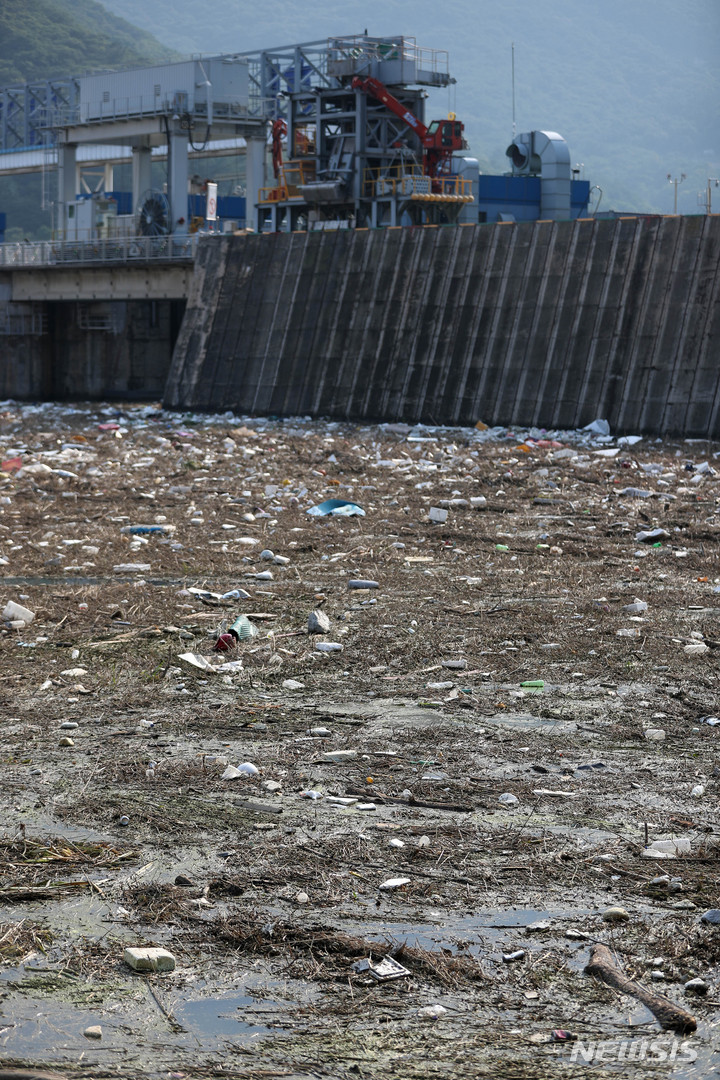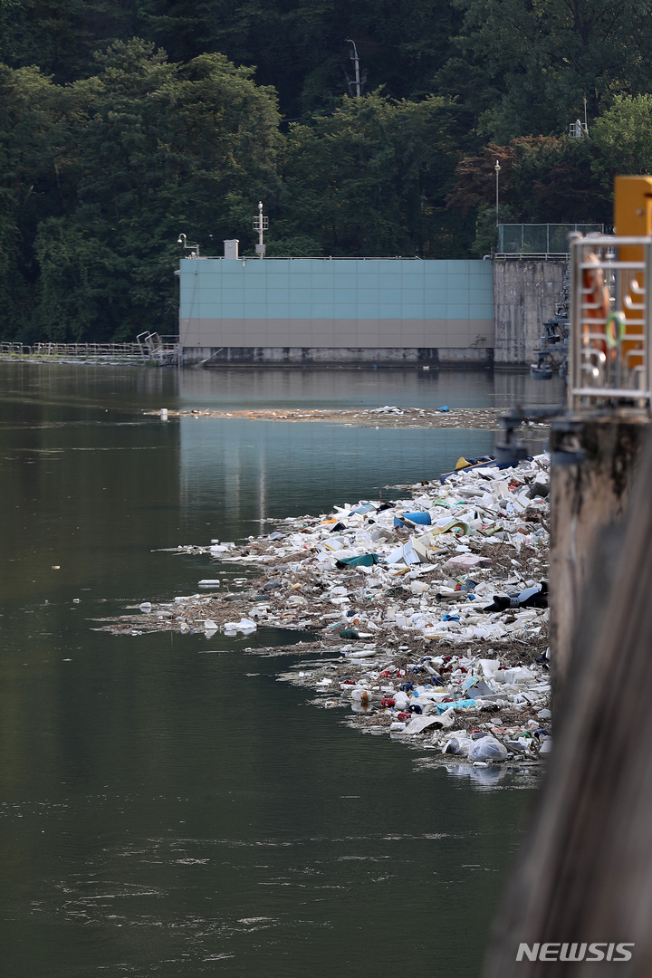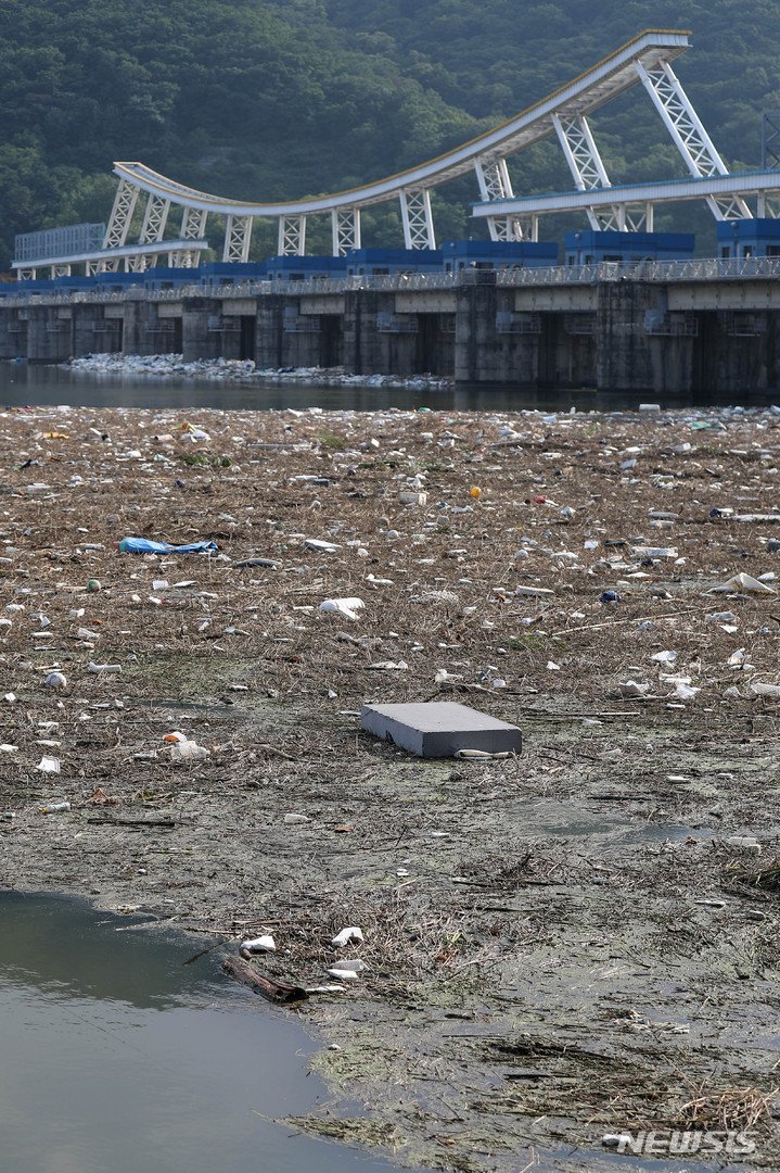 【NEWSIS】4日午後、京畿道河南市内の八堂ダムには、梅雨の大雨などで流れ込んだ流木などがたまっていた。