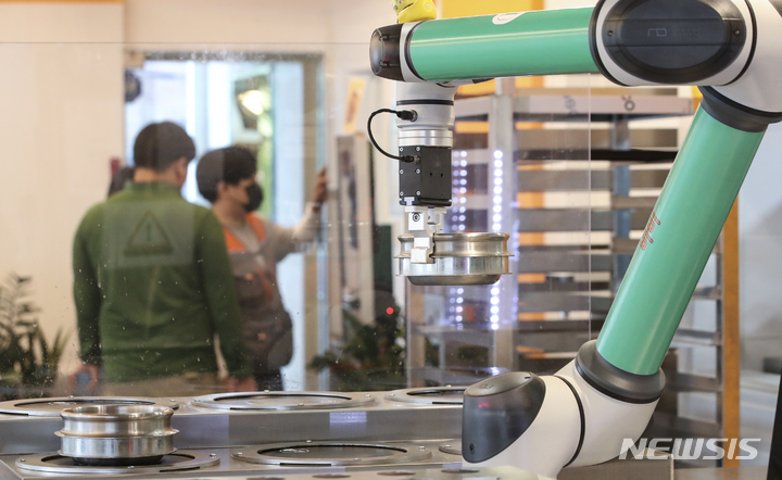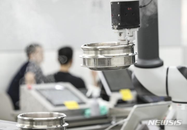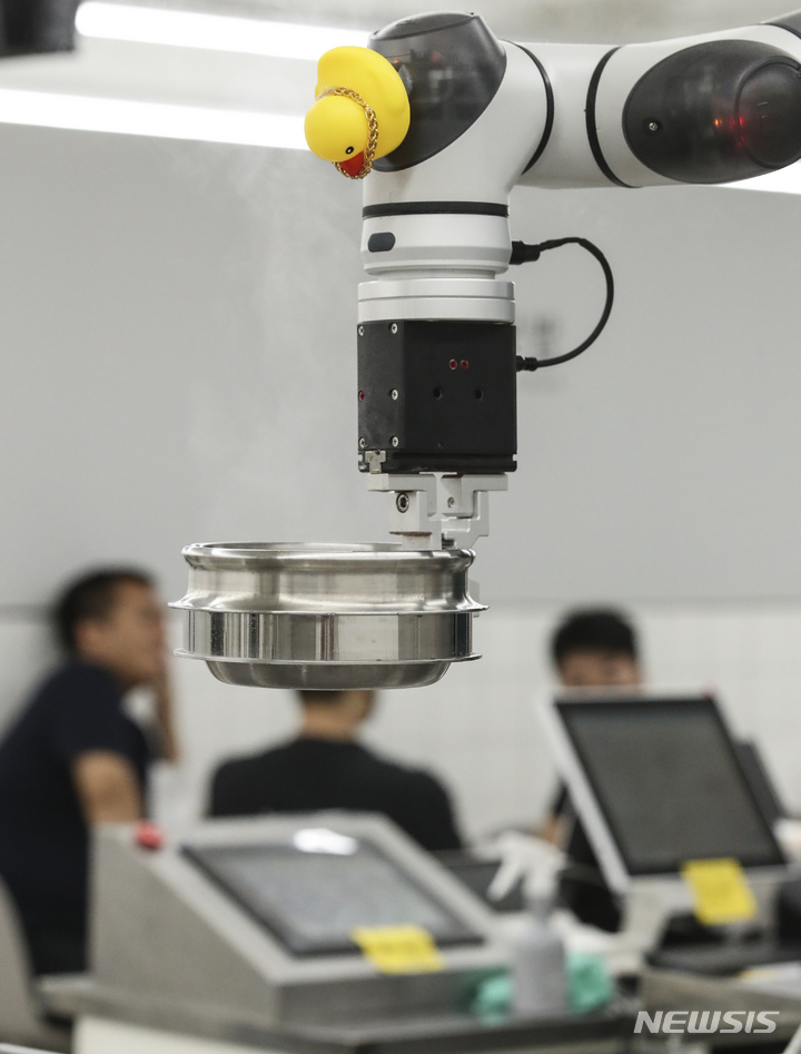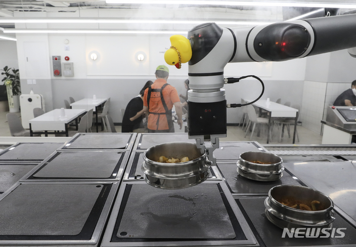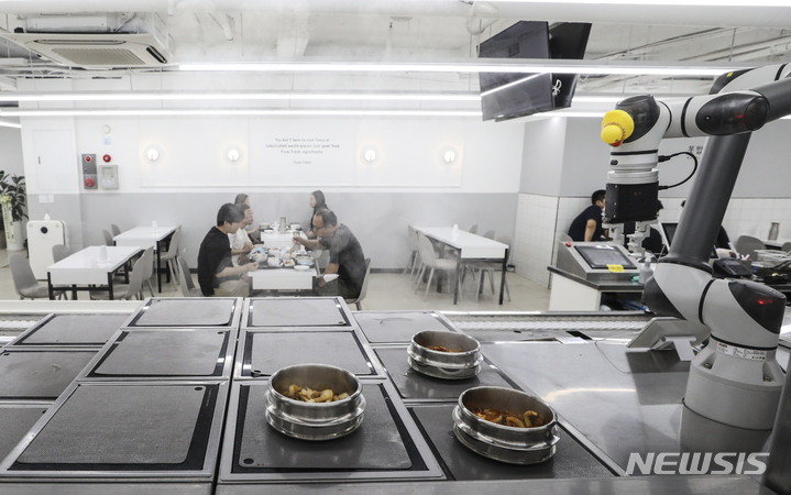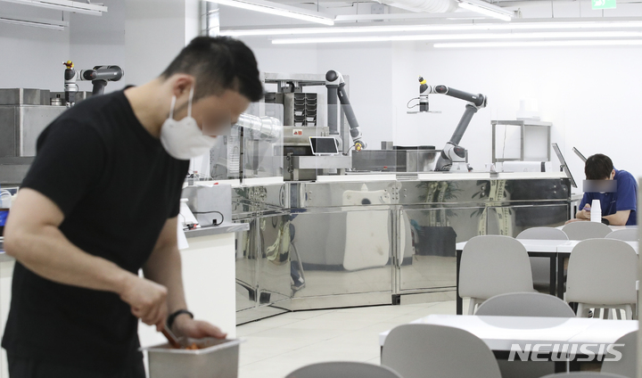 新型コロナ問題以降、人件費を減らすため無人サービスが増えている。写真は8日午後、ソウル市内のある無人ロボット韓食堂で食事をしている市民の様子。