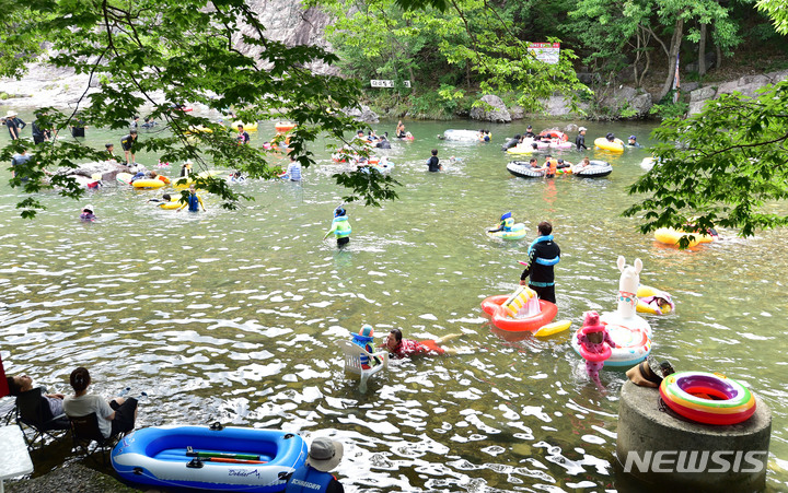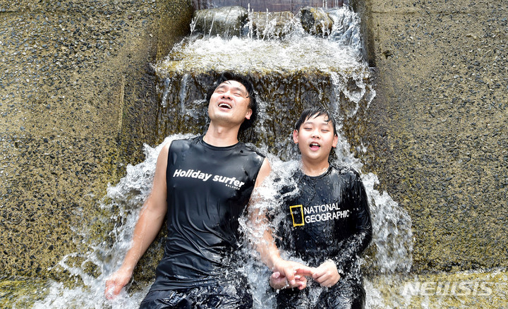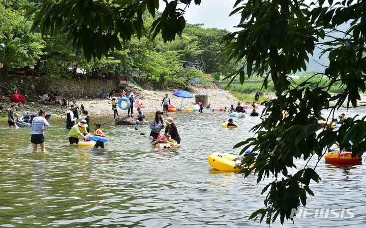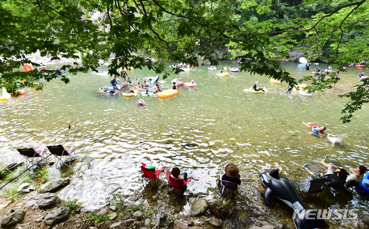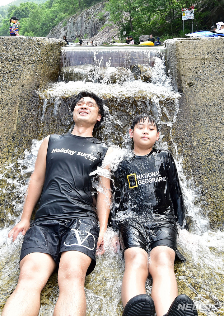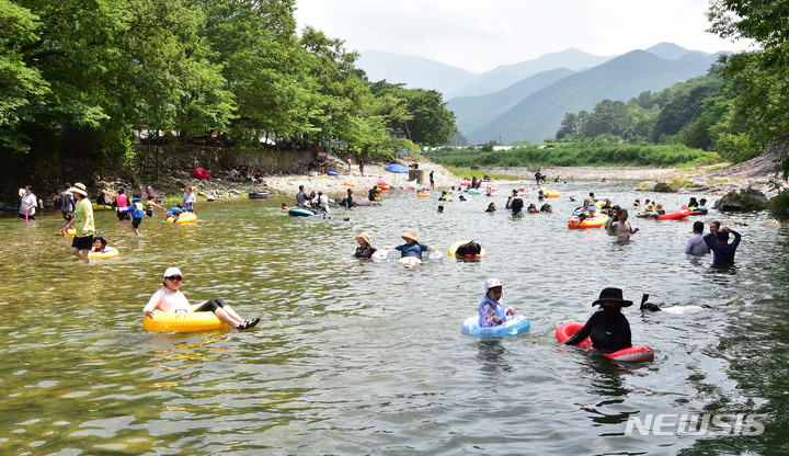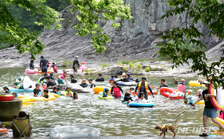 【NEWSIS】猛暑が連日続いている10日午後、涼を求めて慶尚北道清道郡の雲門寺に近い渓谷を訪れた人々。水遊びをして暑さをしのいでいた。