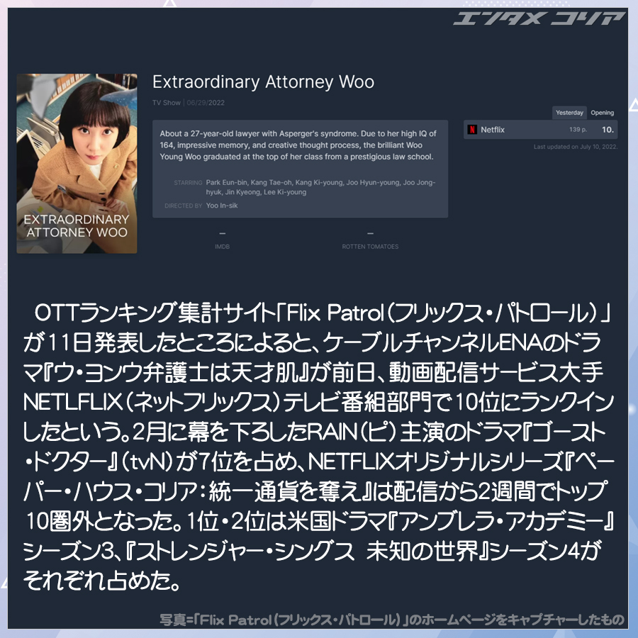 優パク・ウンビン主演のドラマ『ウ・ヨンウ弁護士は天才肌』が世界的に人気を集めている。 OTTランキング集計サイト「Flix Patrol(フリックス・パトロール)」が11日発表したところによると、ケーブルチャンネルENAのドラマ『ウ・ヨンウ弁護士は天才肌』が前日、動画配信サービス大手NETLFLIX(ネットフリックス)テレビ番組部門で10位にランクインしたという。2月に幕を...