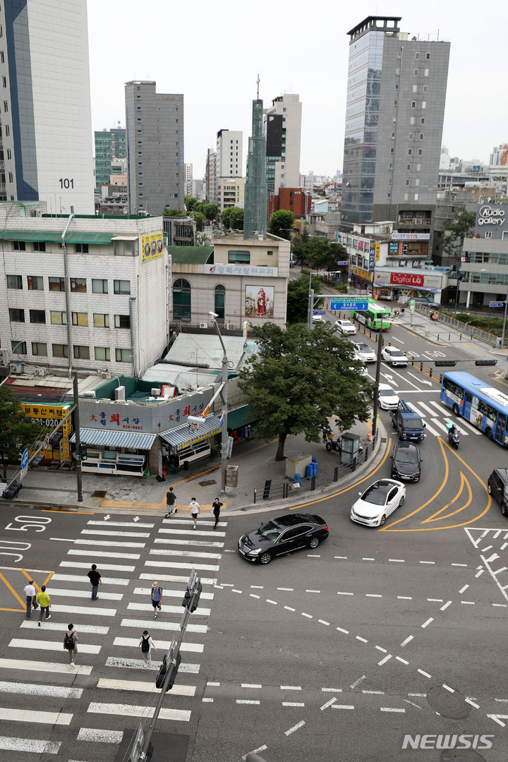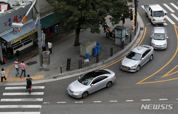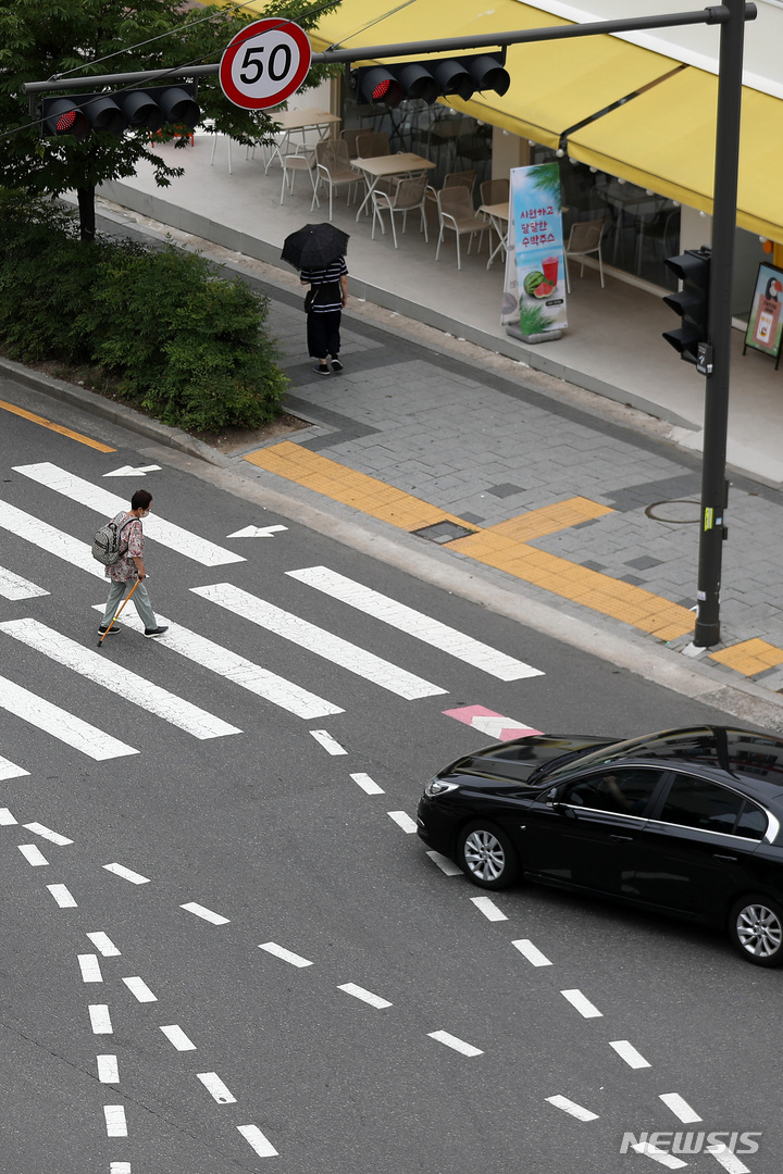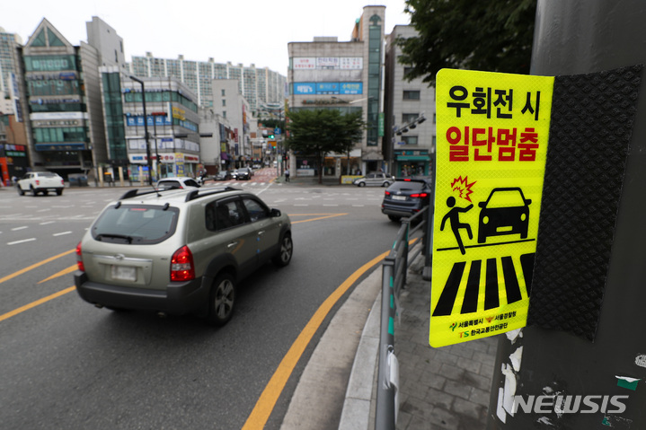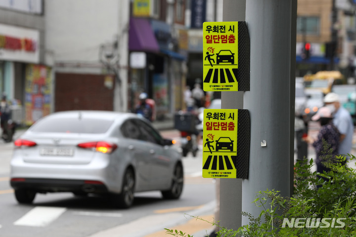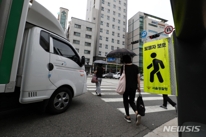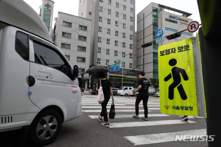 横断歩道前一時停止義務を拡大するなど、歩行者保護義務を強化した改正道路交通法の施行初日となる12日午後、ソウル市内の横断歩道前には「歩行者保護」の案内が取り付けられていた。