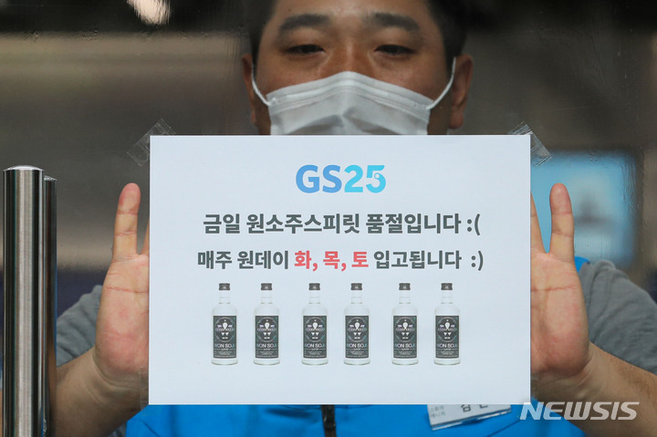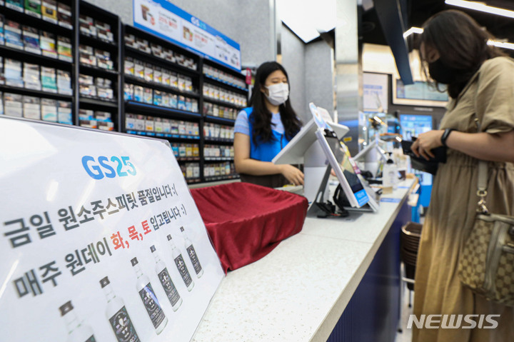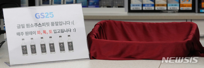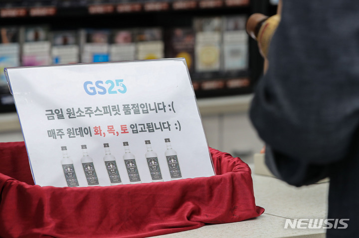 12日午後、ソウル市江南区のコンビニ「GS25」に陳列された「WON SOJU SPIRIT」の様子。「「WON SOJU SPIRIT」は、この日からGS25の売り場およそ1万6000カ所で販売され、安定的な供給のため火曜日、木曜日、土曜日の毎週3回入庫する。