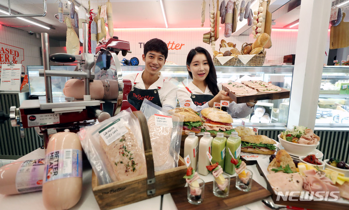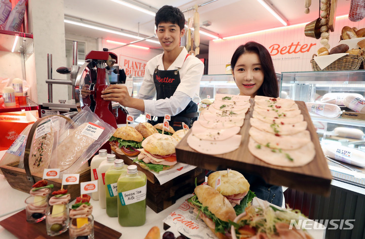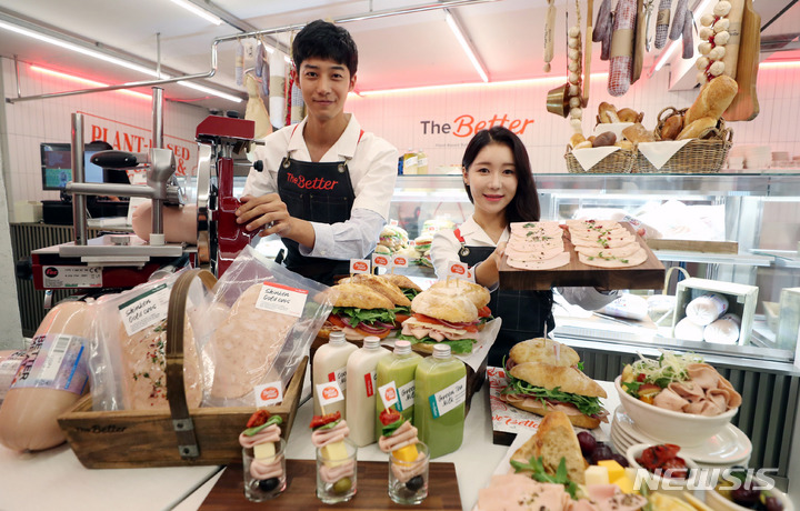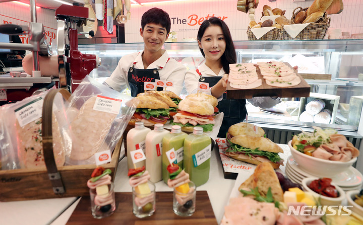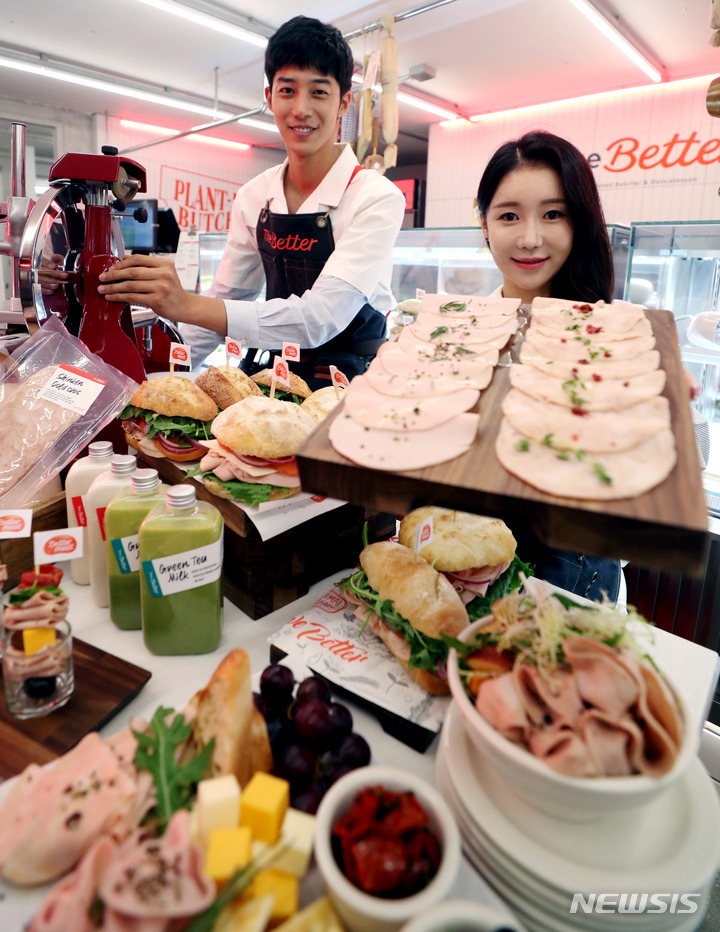 ソウル市江南区狎鴎亭洞のロデオ通りにオープンした新世界フードの植物性の代替肉デリ「The Better」で14日午前、コンパニオンらが代替肉「ベターミート」や代替肉を活用したメニューを紹介した。