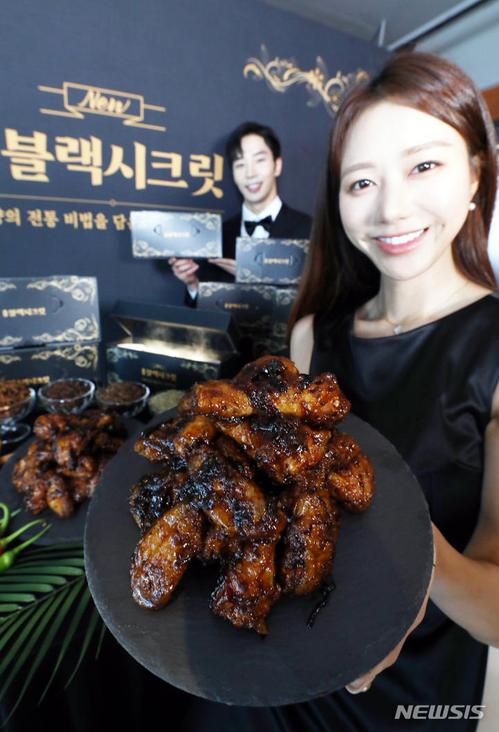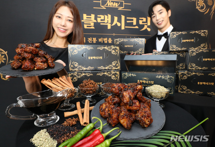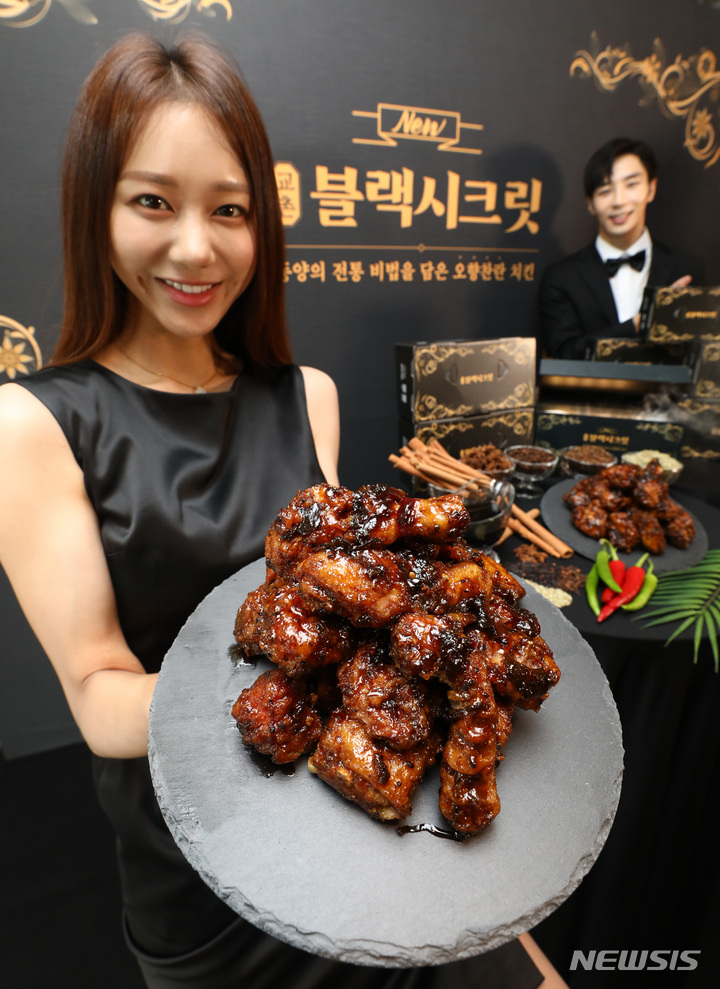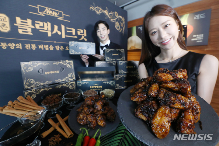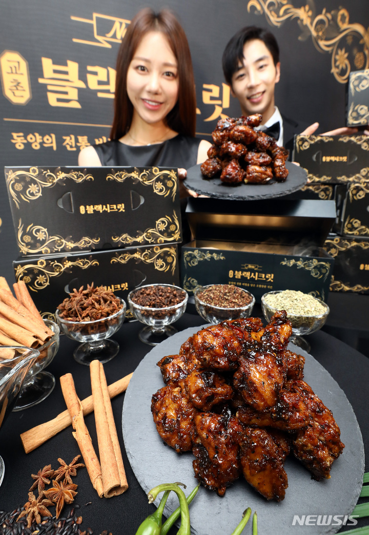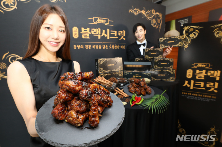 ソウル市鍾路区のKyochonチキン安国店で14日午前、コンパニオンらが新メニュー「Kyochonブラックシークレット」を紹介した。「Kyochonブラックシークレット」は、Kyochonチキンの秘法のしょう油だれに八角、シナモン、ウイキョウ、チョウジ、山椒など、東洋の香辛料5種を加え、味と香りを生かした商品だ。
