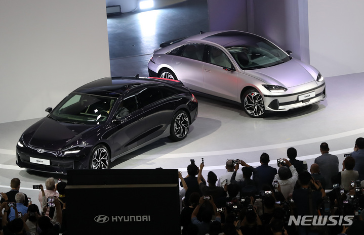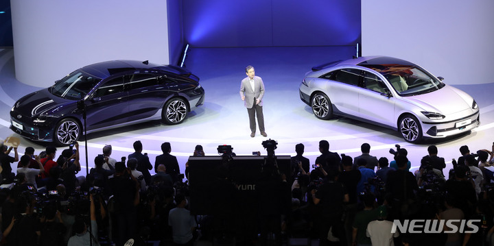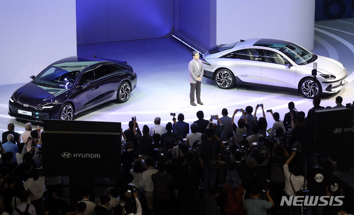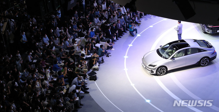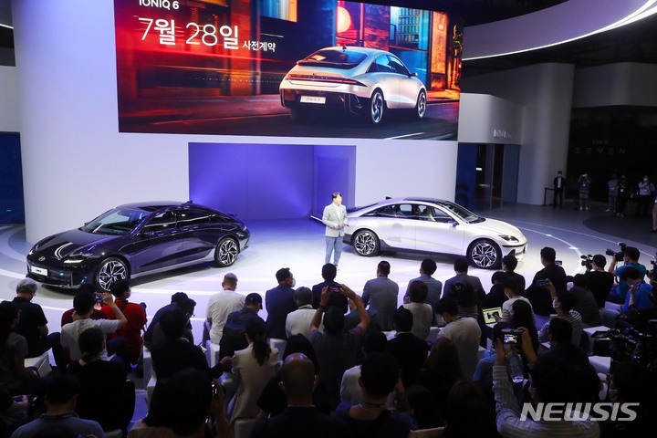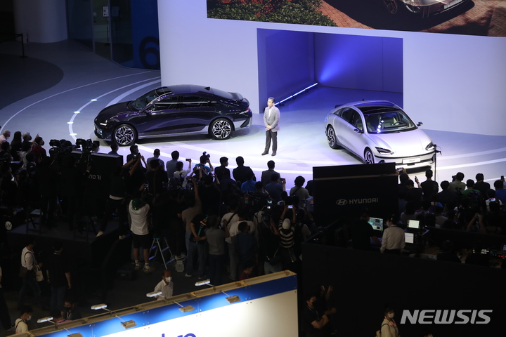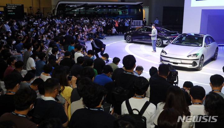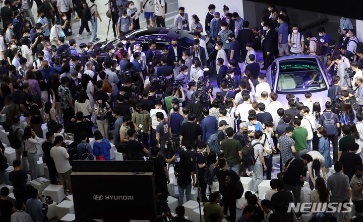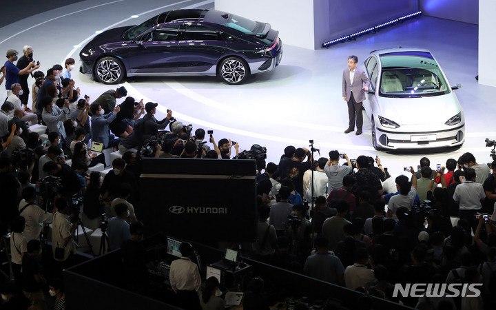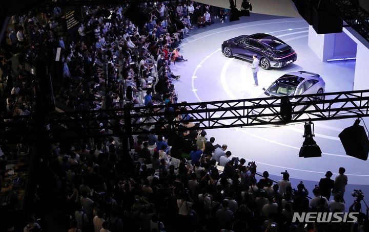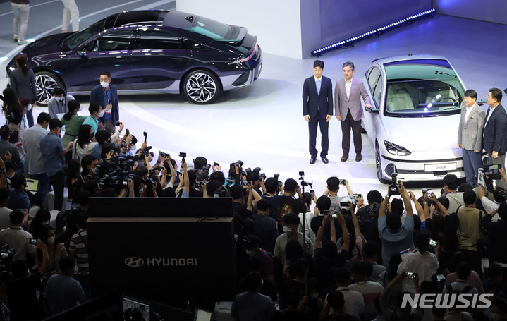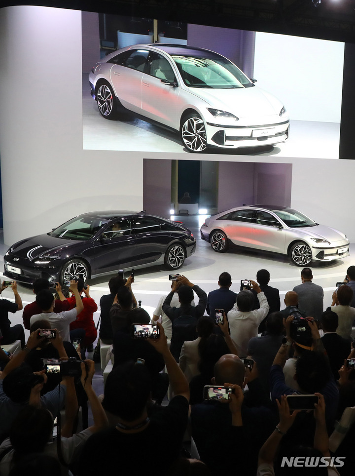 2022釜山国際モーターショーのメディア公開イベントが開かれた14日、釜山市海雲台区のBEXCO第1展示場で、現代自動車がセダン型電気自動車「IONIQ6」の世界初公開(ワールドプレミア)を行った。同日のプレスデーを皮切りに15日から24日まで開催される釜山モーターショーには、完成車メーカー6社(現代自、起亜自、ジェネシス、BMW、MINI、ロールスロイス)を含む8カ国120社が参加する。