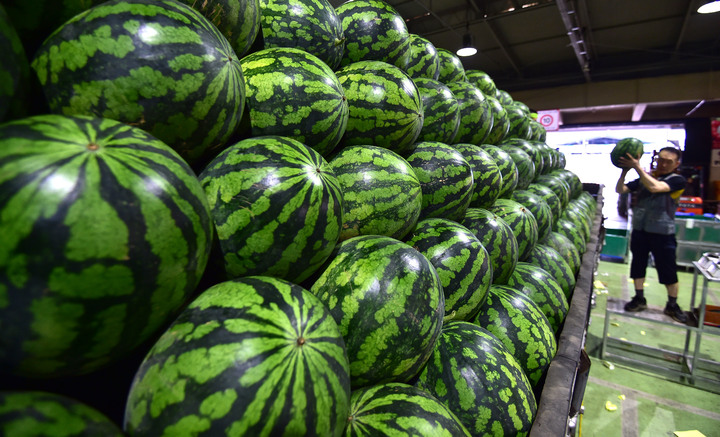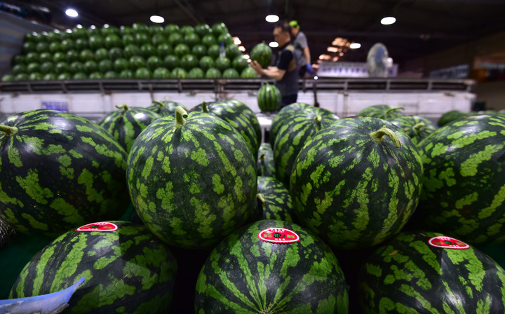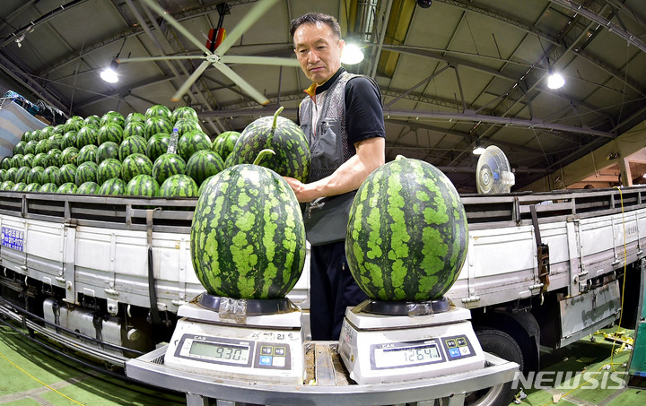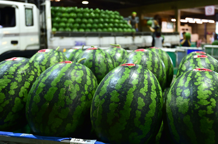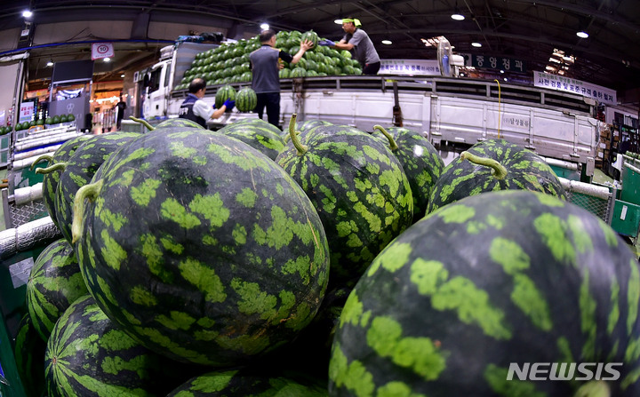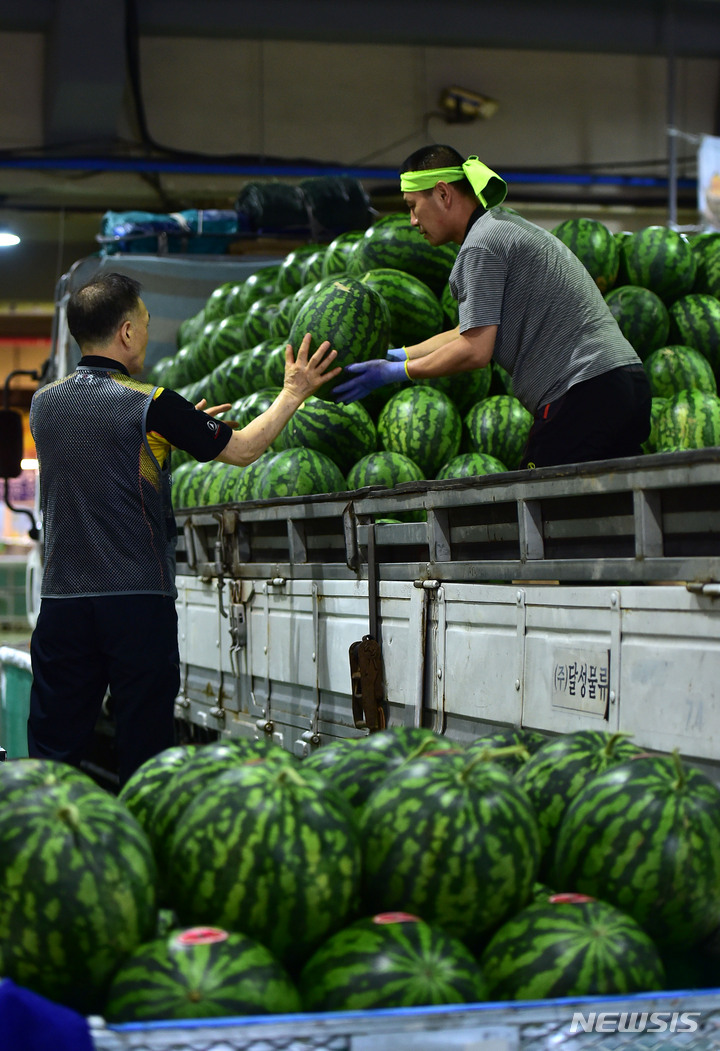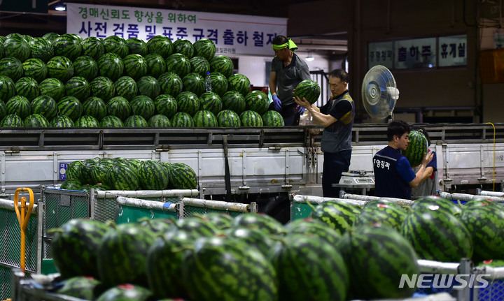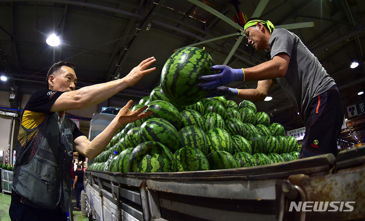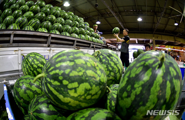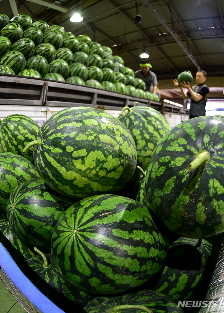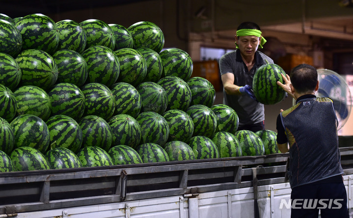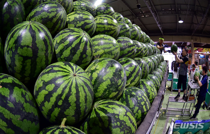 韓国の暦で酷暑の時期とされる三伏の始まりを告げる「初伏」まであと二日と迫った14日午前、大邱市北区梅川洞の農水産物卸売市場で、関係者らがスイカの荷役作業を行っているところ。