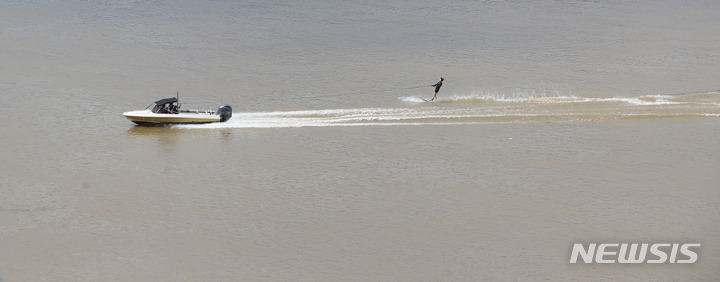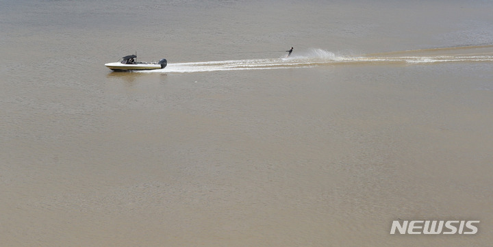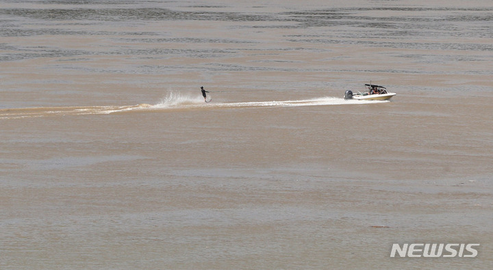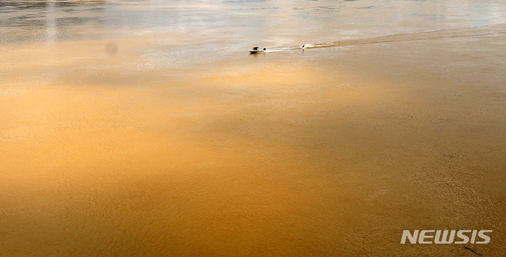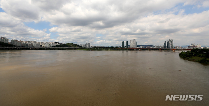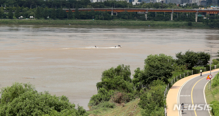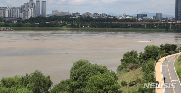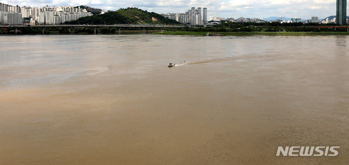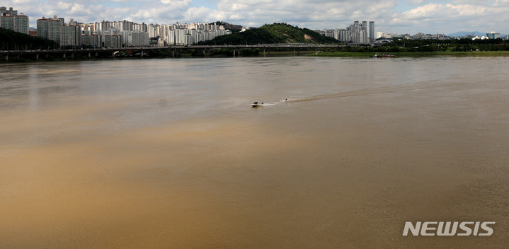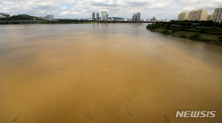 14日午後、ソウルの東湖大橋付近。前日の大雨によって泥水に変わった漢江の様子。
