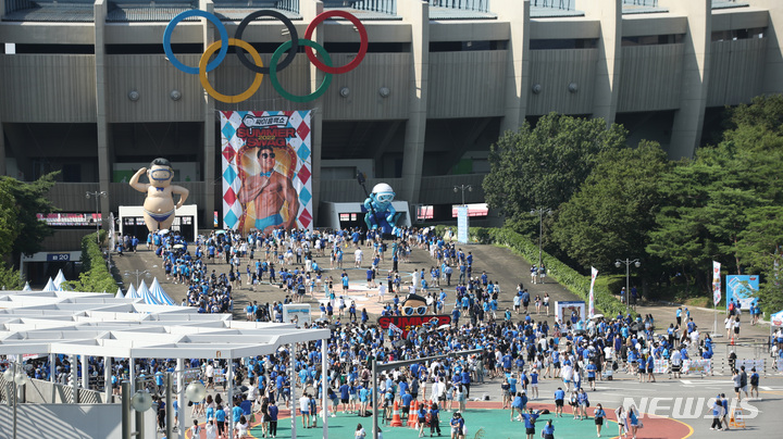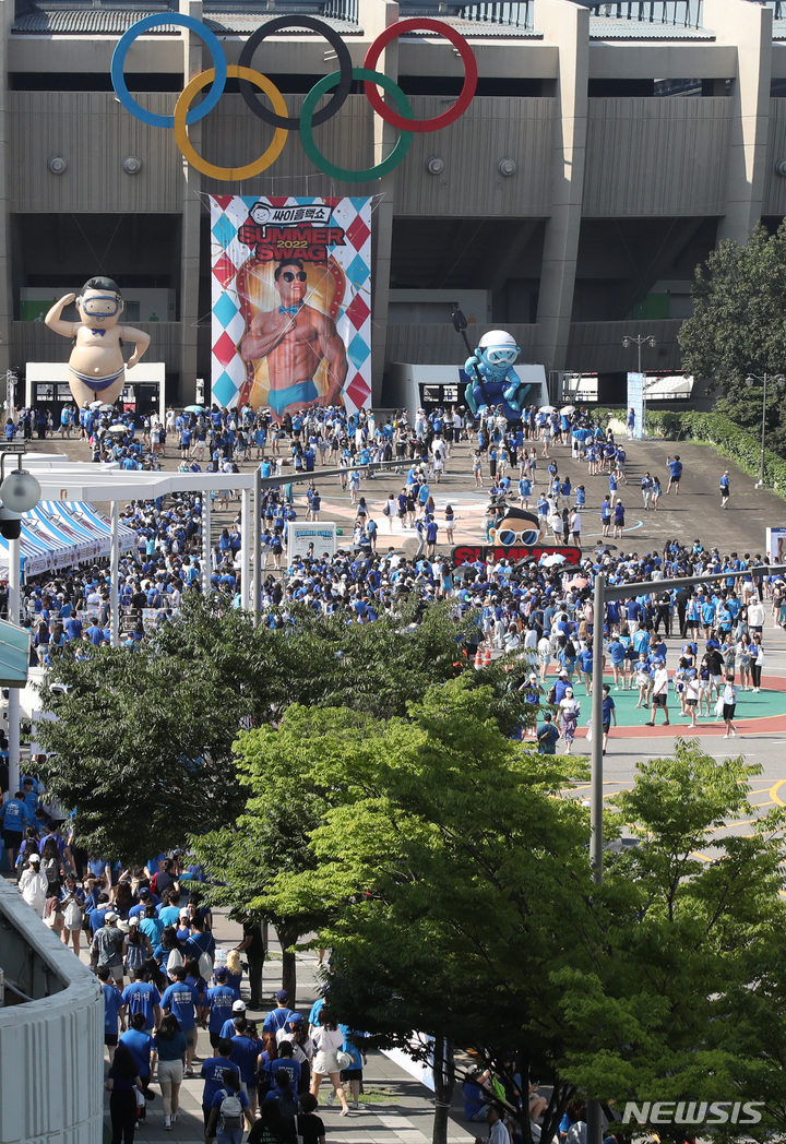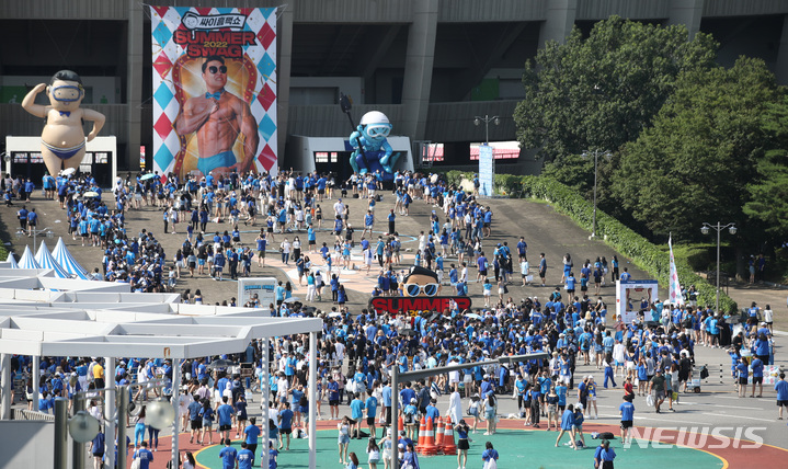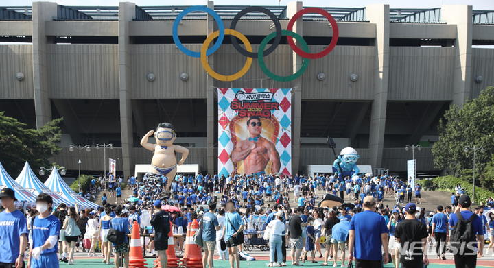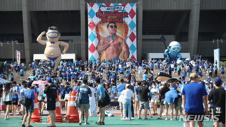 ソウル市松坡区の蚕室オリンピックメーンスタジアムで15日午後、「PSYびしょぬれショー」にやって来た観衆が入場を待っている様子。