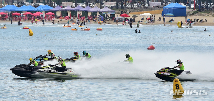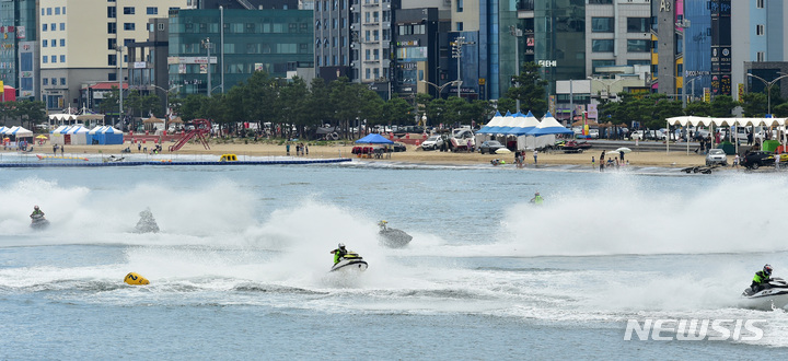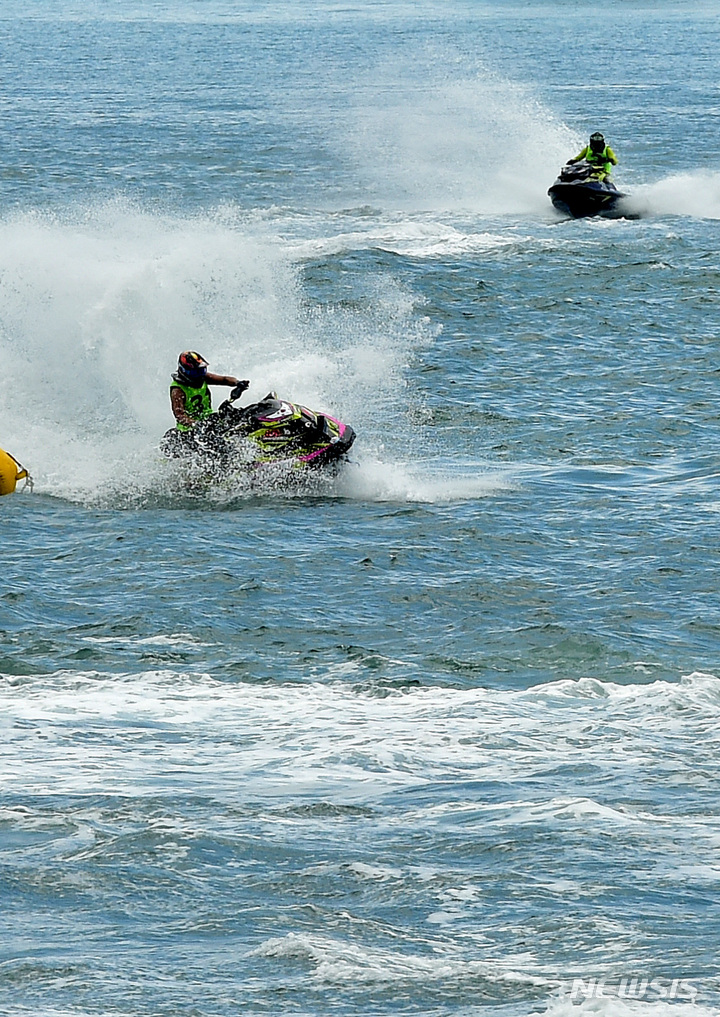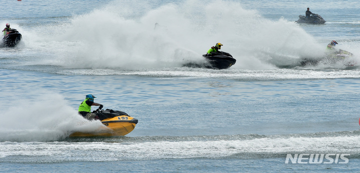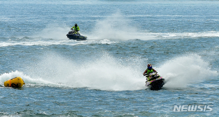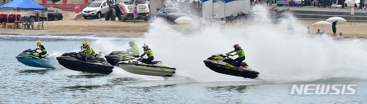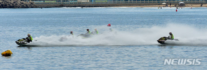 【NEWSIS】17日午後、慶尚北道浦項市内の迎日台海水浴場で行われた「2022浦項市長旗全国水上オートバイ・チャンピオンシップ大会」で、波をかき分け全力疾走する選手たち。