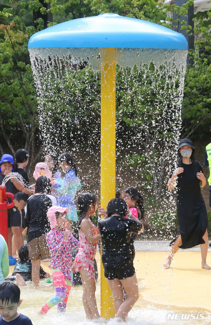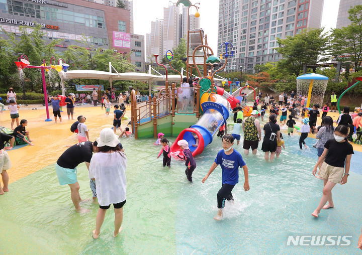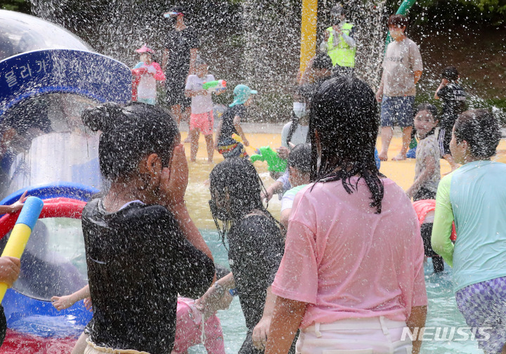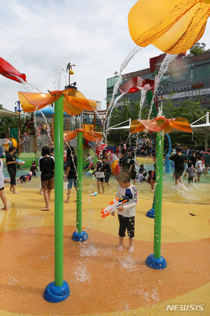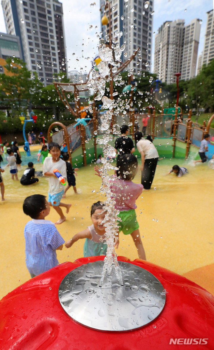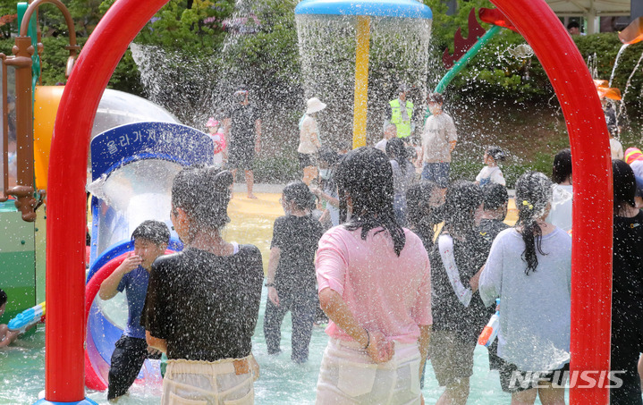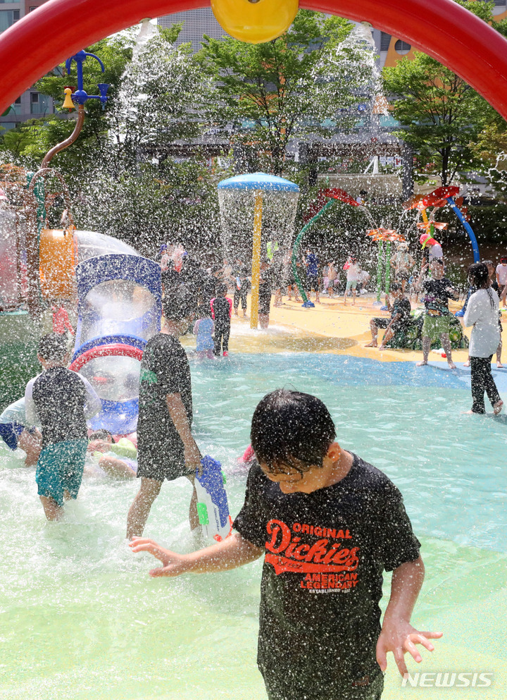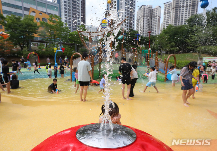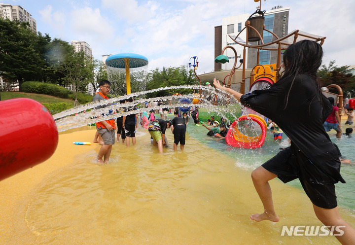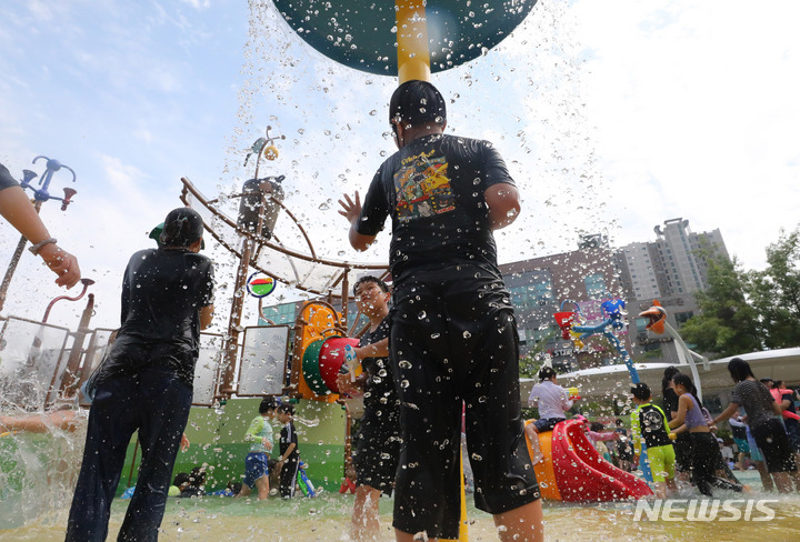 【NEWSIS】時折にわか雨が降るものの、暑さが続いた17日午後、京畿道高陽市内の食寺中央公園で、水遊びをする子どもたち。