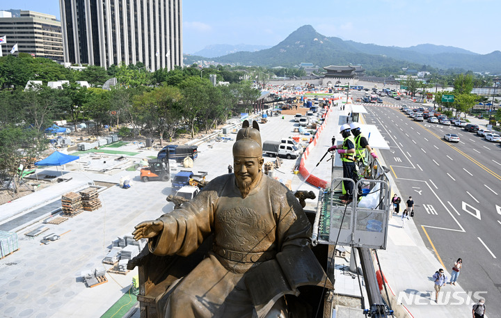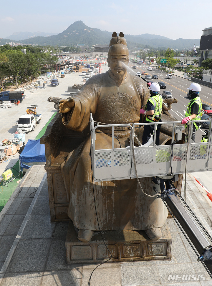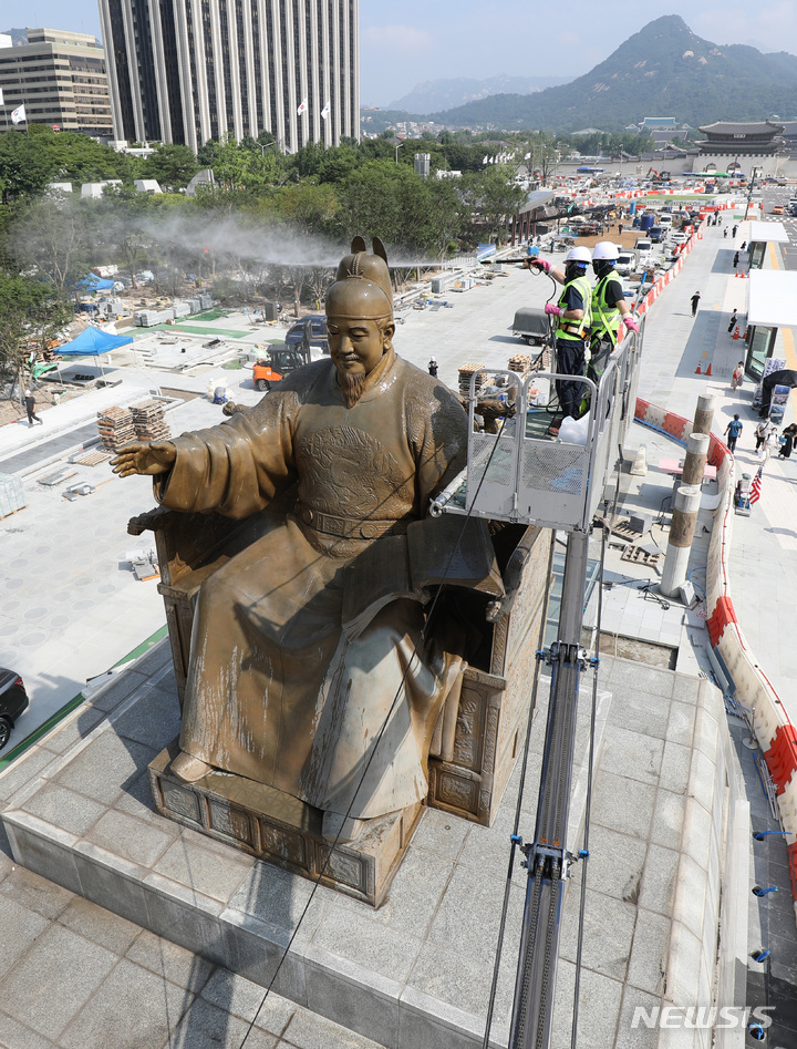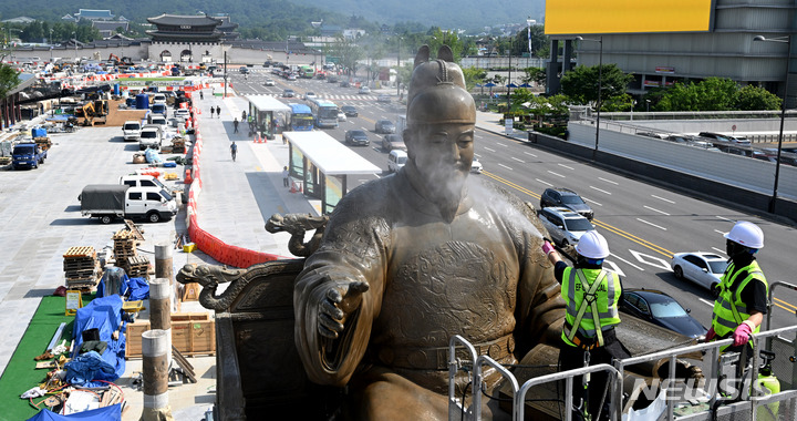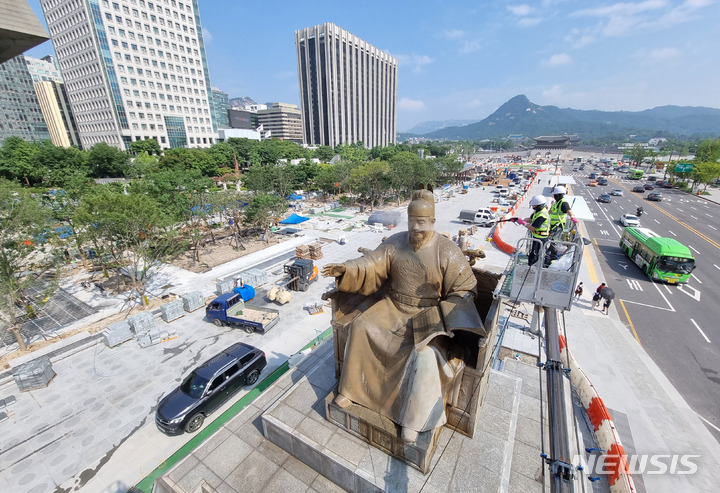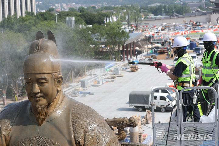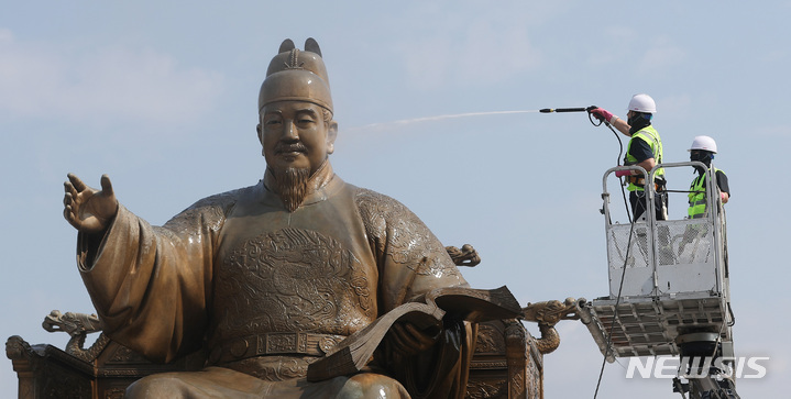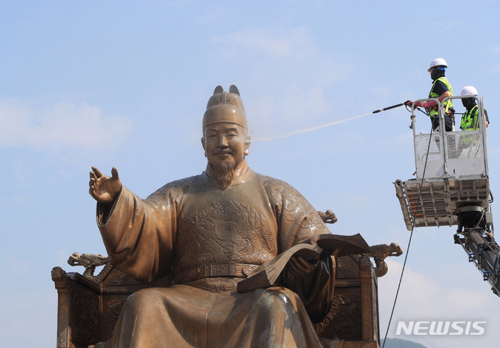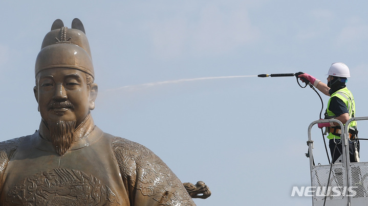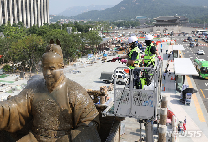 【NEWSIS】18日午前、ソウル市鍾路区の光化門広場で、世宗大王像を洗う作業員。光化門広場の同像洗浄は、2020年4月以来2年3カ月ぶりに行われた。
