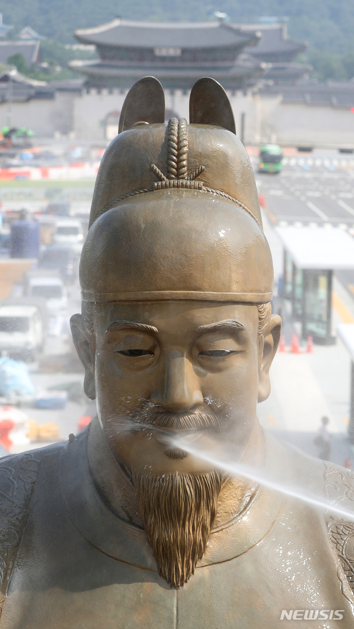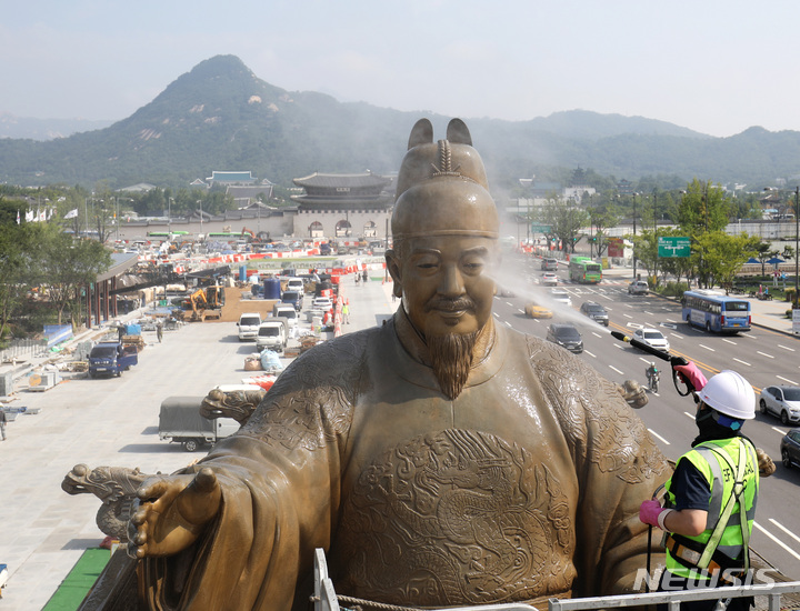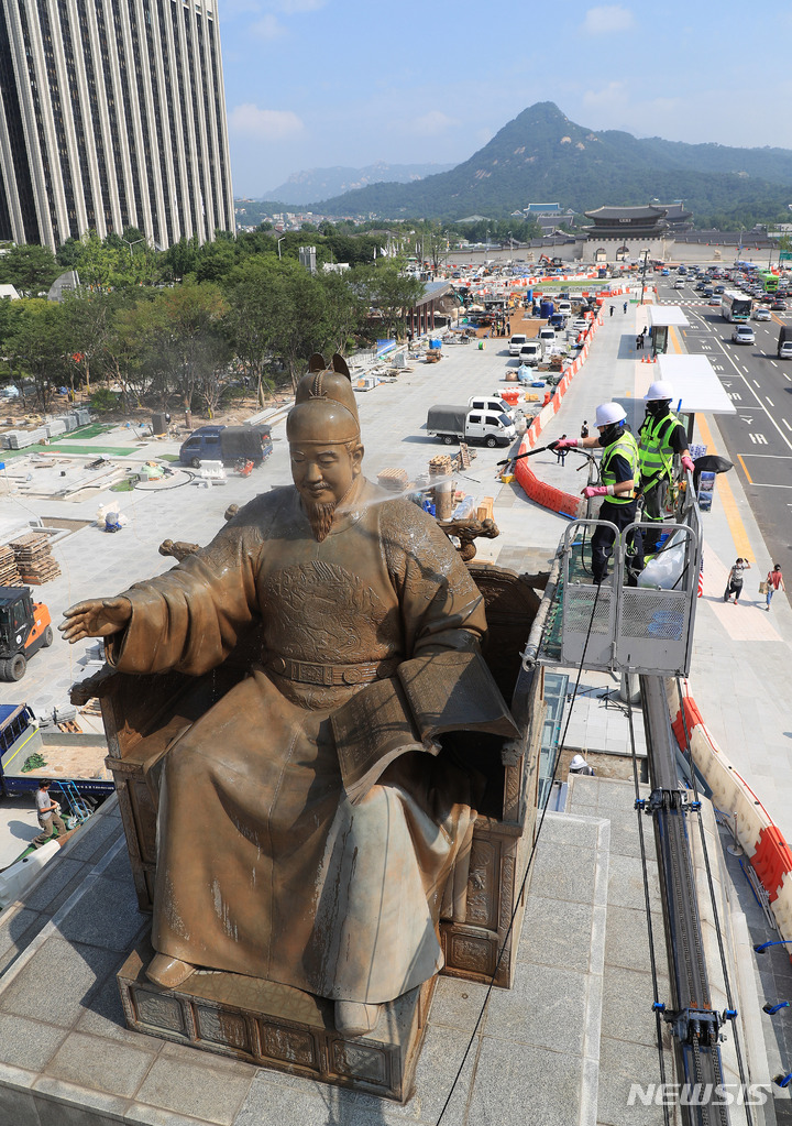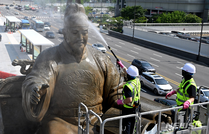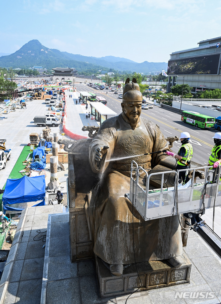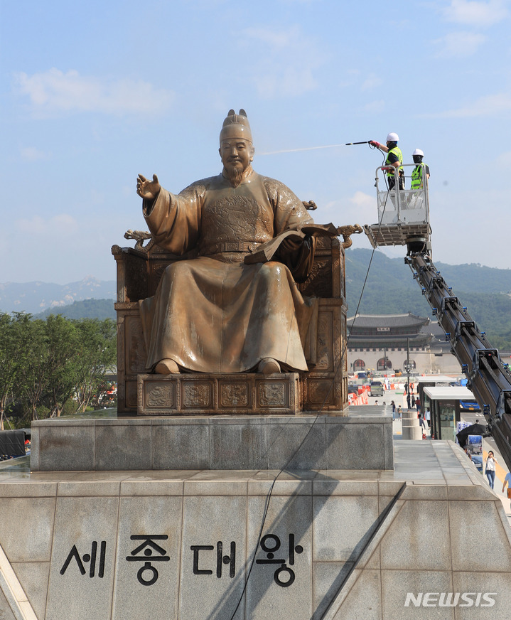 【NEWSIS】18日午前、ソウル市鍾路区の光化門広場で、世宗大王像を洗う作業員。光化門広場の同像洗浄は、2020年4月以来2年3カ月ぶりに行われた。