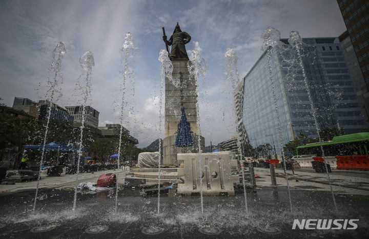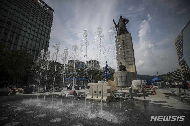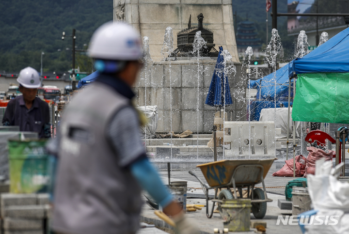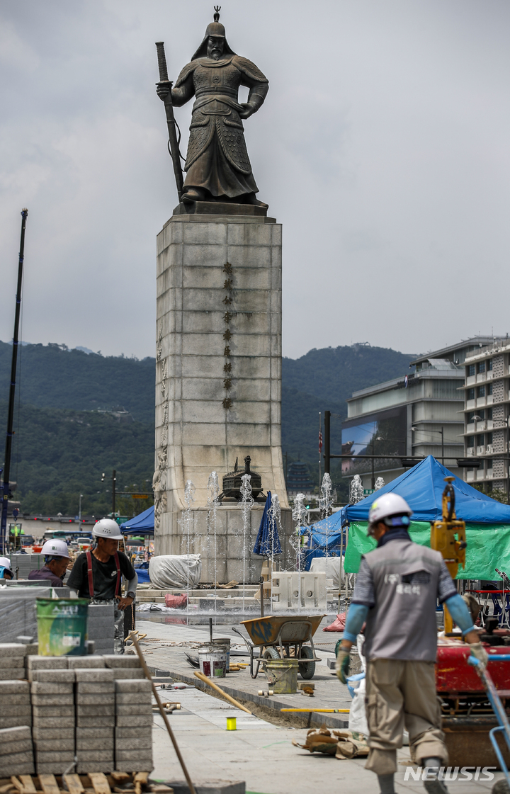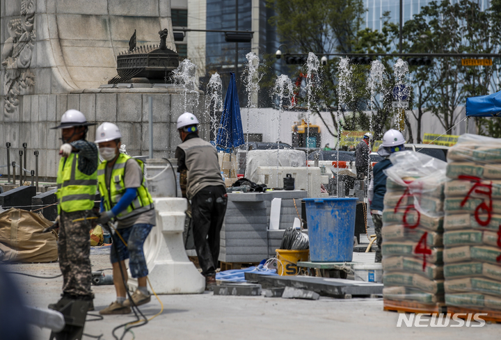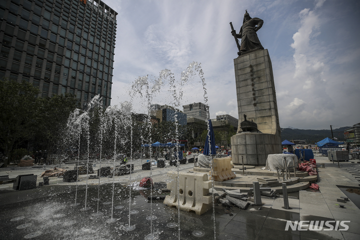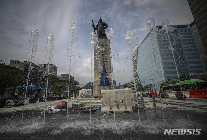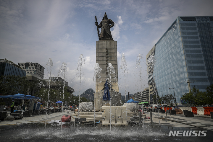 光化門広場(ソウル市鍾路区)の再造成工事が進んでいる20日午後、同広場の李舜臣将軍像前にある噴水の様子。ソウル市は来月6日に開場式典を行い、市民に広場を公開する予定だ。
