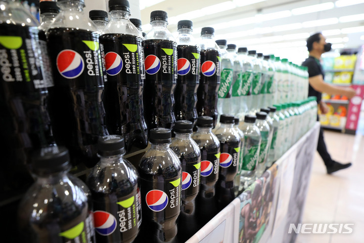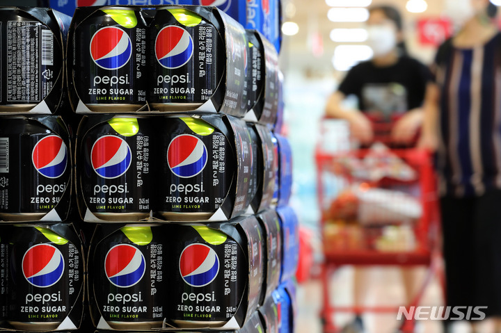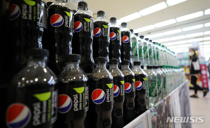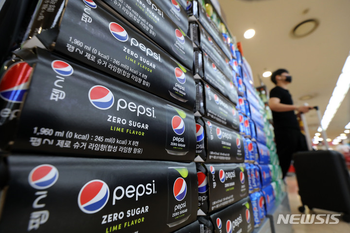 22日午前、ソウル市内の大手スーパーに並べられたペプシの「ゼロシュガー・ライム」の様子。業界が明らかにしたところによると、最近オンラインを中心として「ペプシの『ゼロシュガー・ライム』の一部製品のキャップ部分から、ひどい汗や腋臭のような臭いがする」という指摘が相次いでいる。
