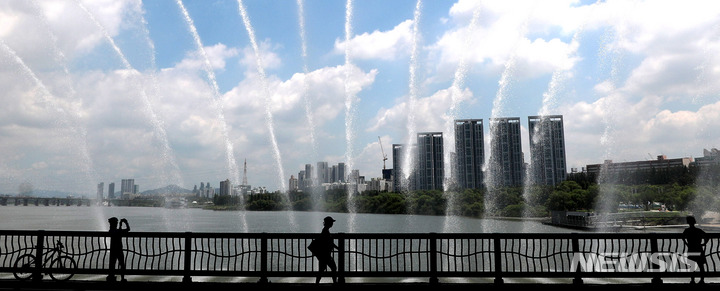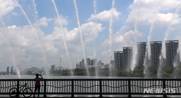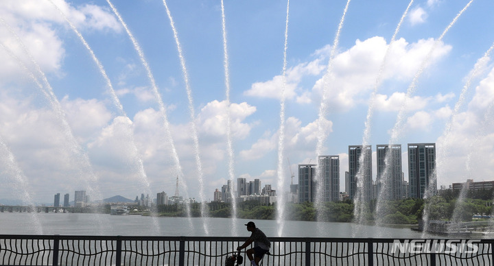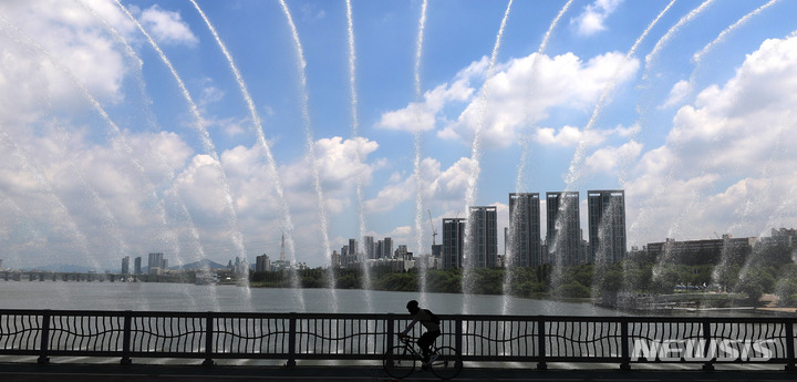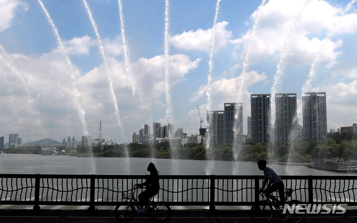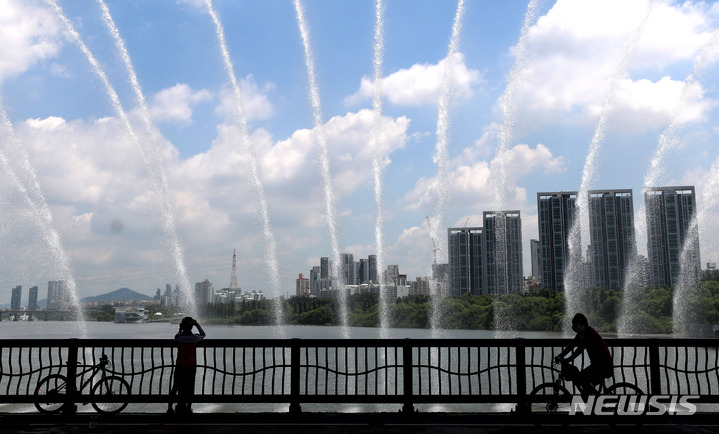 韓国各地で猛暑注意報が発令された25日午後、ソウル市瑞草区の潜水橋にて、月光レインボー噴水を眺めつつ自転車をこいでいる市民の様子。