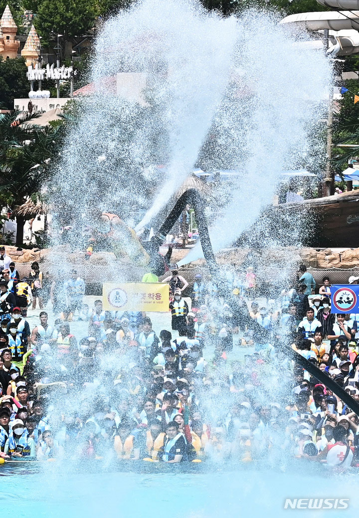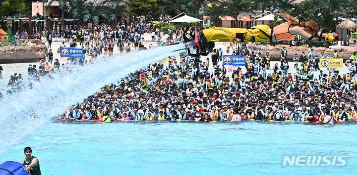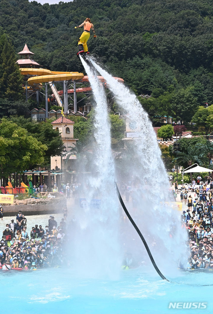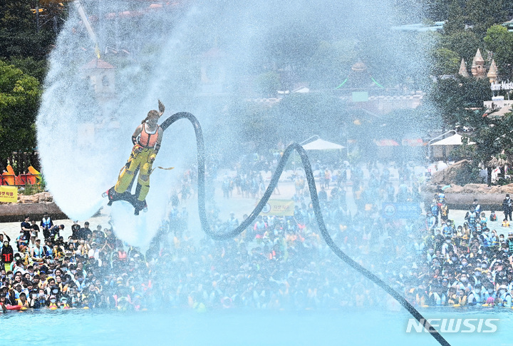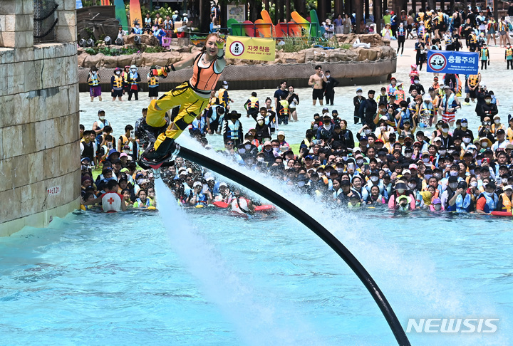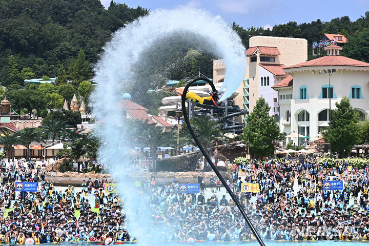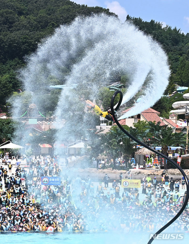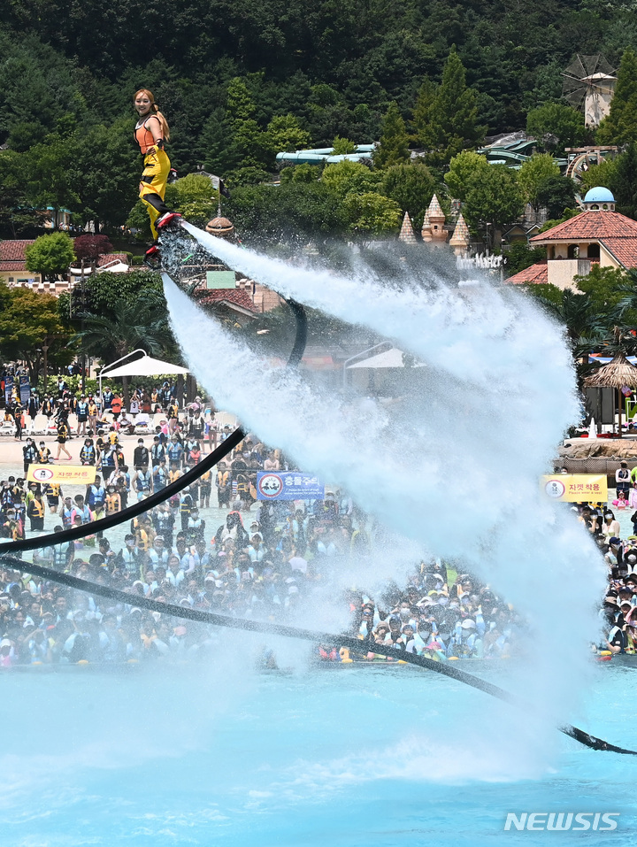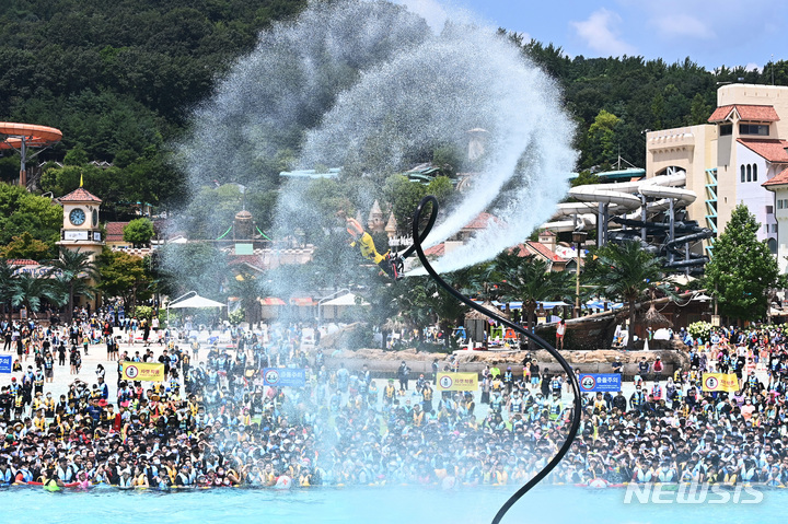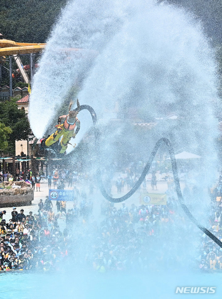 韓国各地に猛暑注意報が発令された25日午後、京畿道竜仁市の「カリビアンベイ」では、訪れた人々が爽快に水を吹き出して空を飛ぶ「フライボード」のショーを見ながら涼を取っていた。