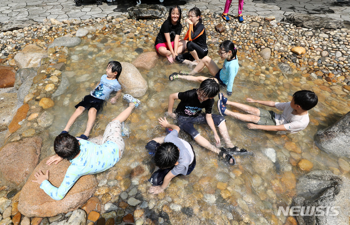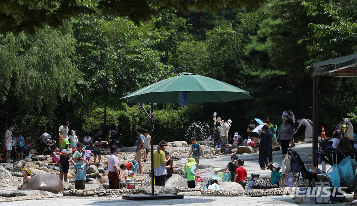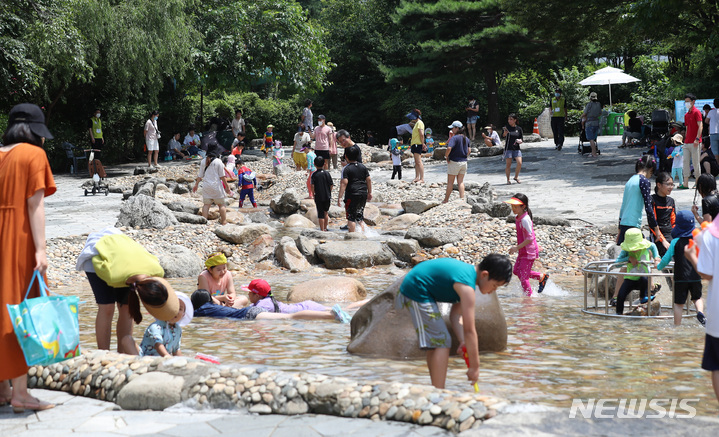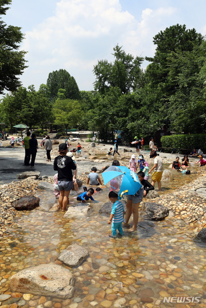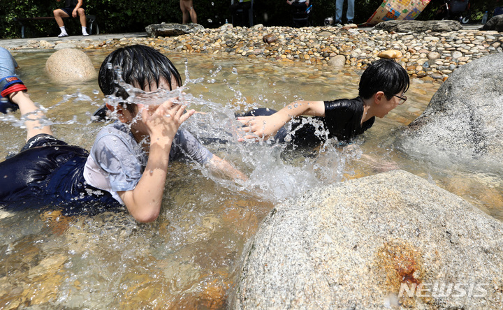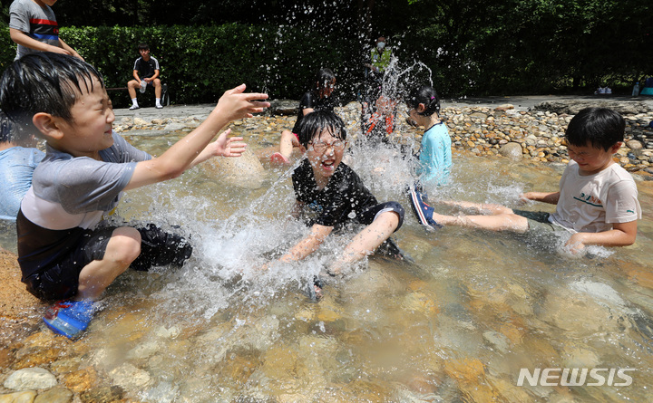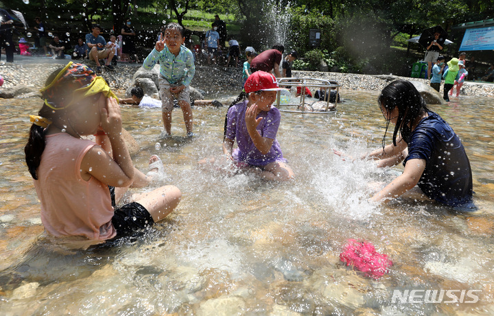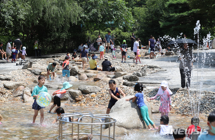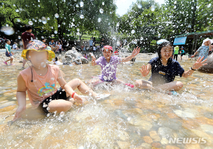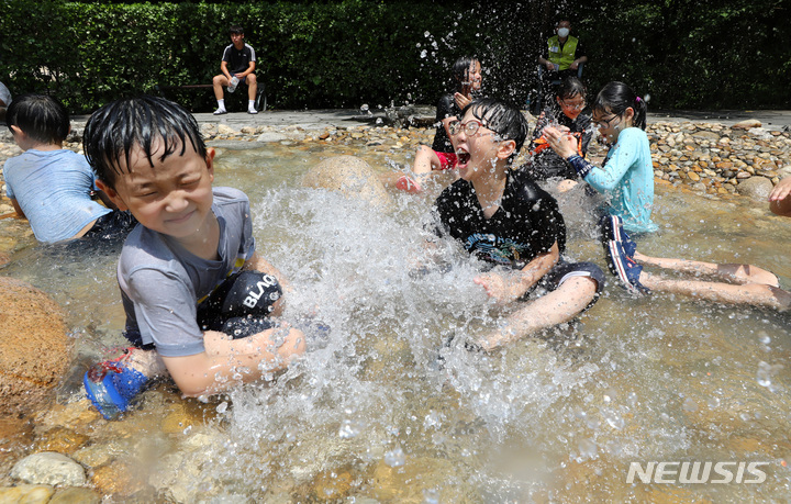 韓国の暦で酷暑の時期とされる三伏の一つ「中伏」を迎えた26日午後、ソウル子ども大公園(ソウル市広津区)水遊び場で、子どもたちが水遊びを楽しんでいる様子。新型コロナのため営業が中断していたソウル子ども大公園水遊び場は、きょうから来月15日まで運営される。