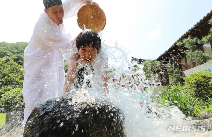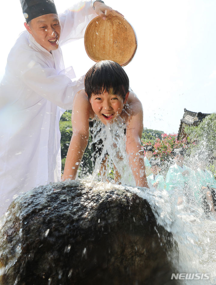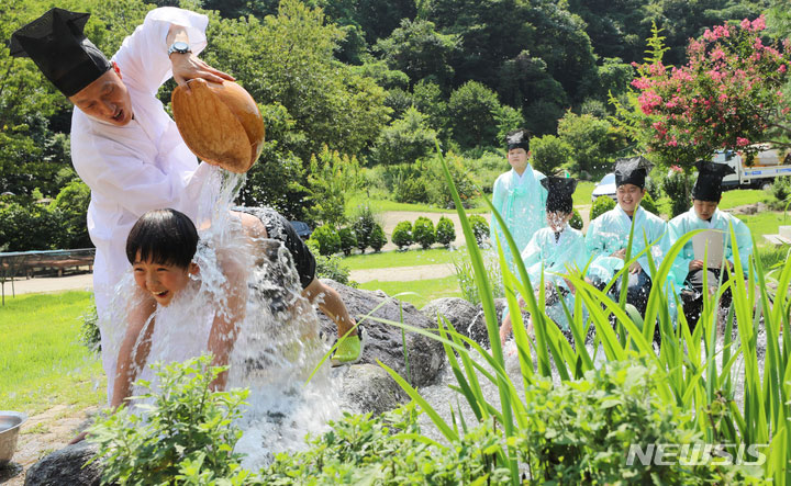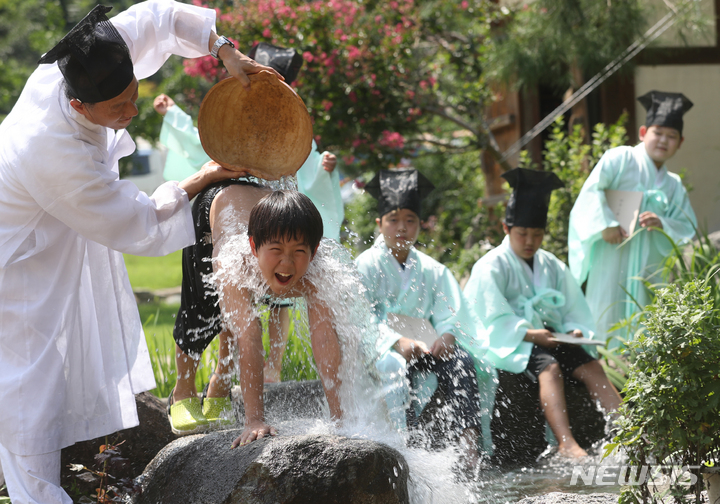 昼間の気温が30度をはるかに超えた26日午後、忠清南道論山市の養志書堂で、訓長先生がサマーキャンプに参加した子どもたちに「トゥンムル」をしてあげているところ。