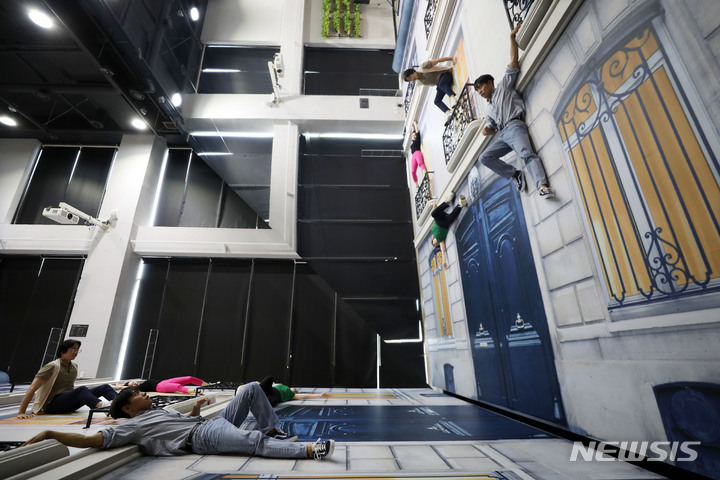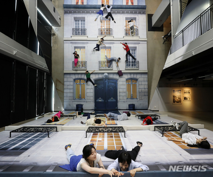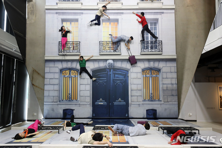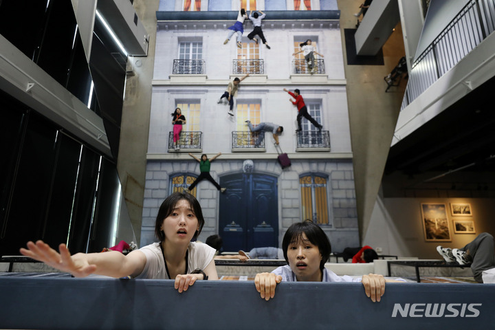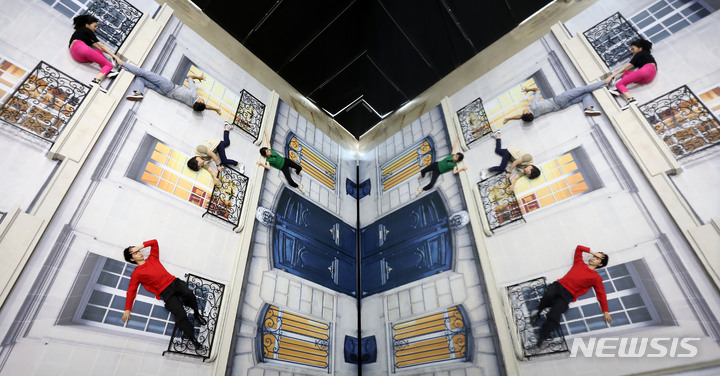 ソウル市竜山区の人工島ノドゥルソムの複合文化空間で27日午前、レアンドロ・エルリッヒの代表作「住宅」(Batiment)を体験してみる観客の様子。フランス語で建物を意味する「Batiment」は、実際の建物の形で作られたファサードと超大型の鑑で構成された、観客体験型の作品だ。