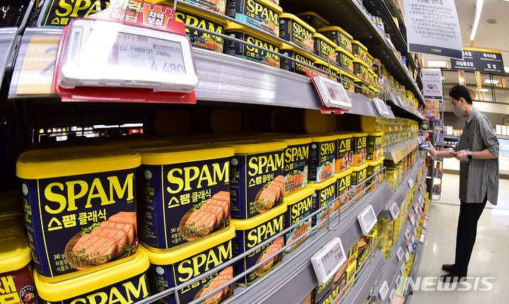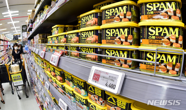 缶詰のハム製品の価格引き上げが予告された27日午後、大邱市内の大手スーパーに陳列されている缶詰ハム製品の様子。