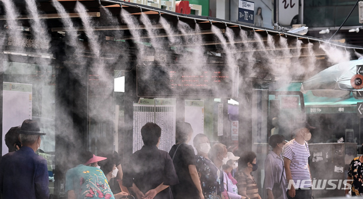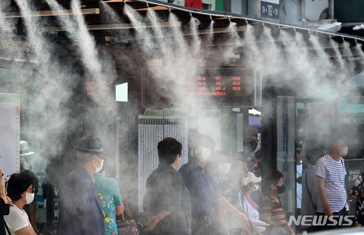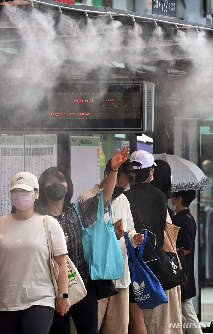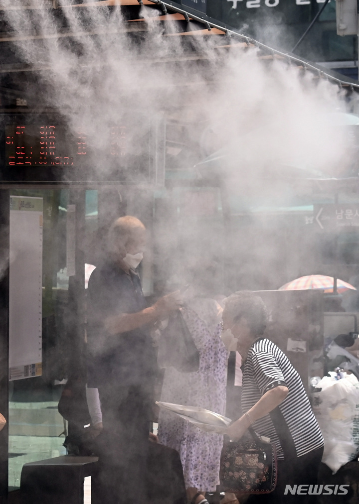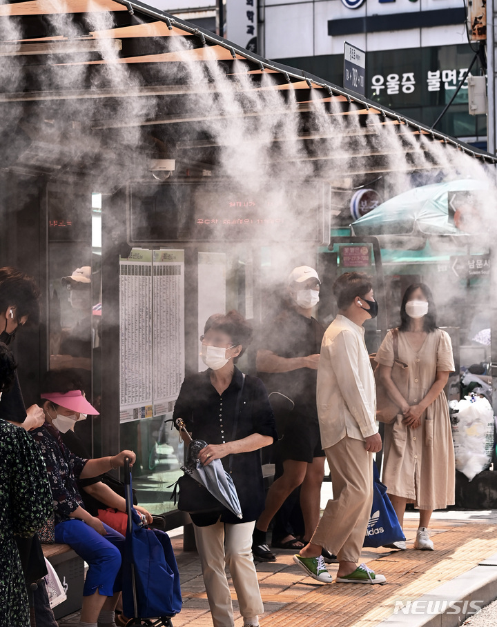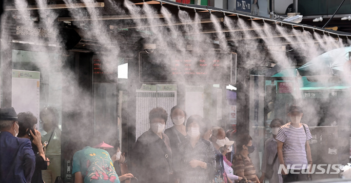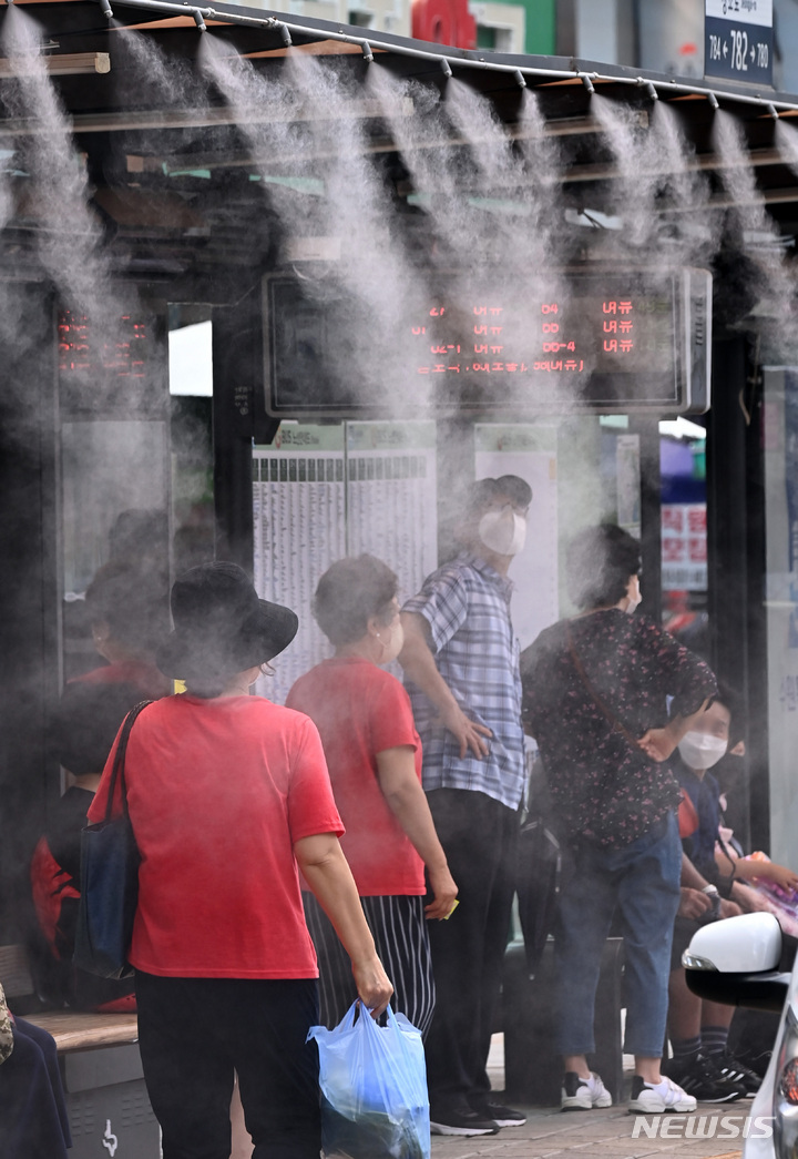 韓国各地に猛暑警報が発令された29日午後、京畿道水原市八達区のバス停で、「クーリングフォグ」を浴びて涼む市民の様子。