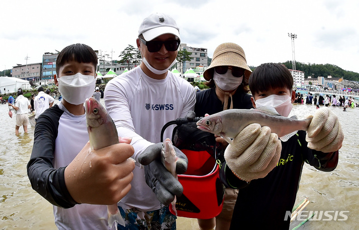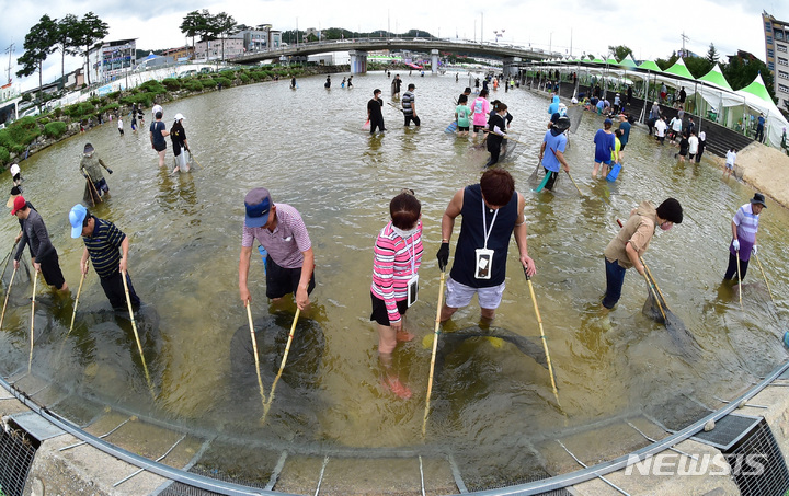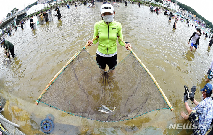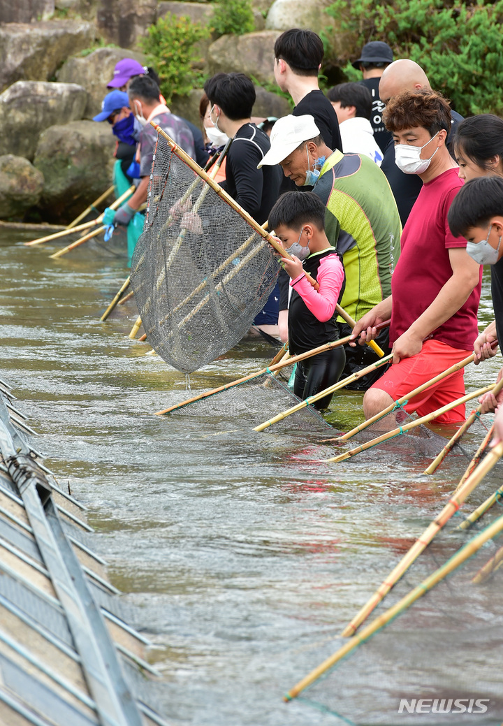 本格的な夏休みシーズンを迎えた30日午後、慶尚北道奉化邑の乃城川一帯で開かれた「第24回 2022 奉化アユ祭り」を訪れた避暑客が、すくい網を利用してアユ獲りをしているところ。今回のアユ祭りは、新型コロナの影響で3年ぶりの開催となった。