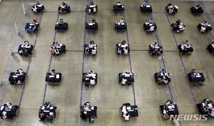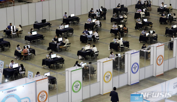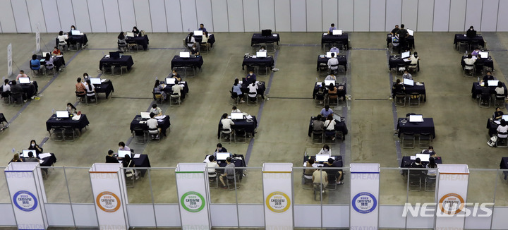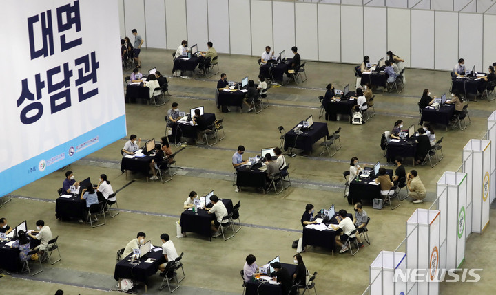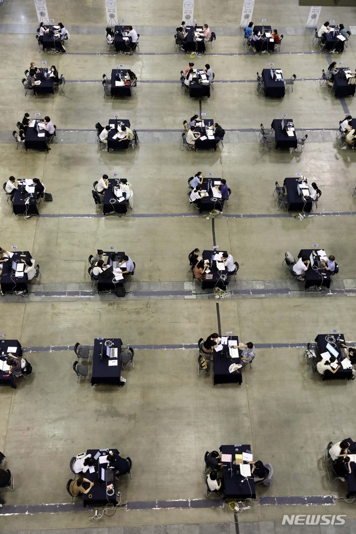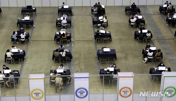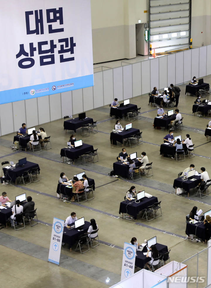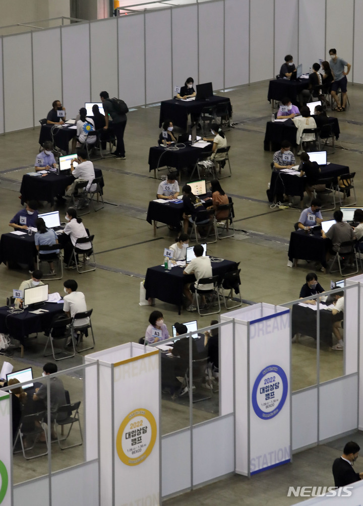 釜山市教育庁の「2022大学入試相談キャンプ」が開かれた29日、釜山市海雲台区のBEXCO第1展示場を訪れた生徒や保護者らが、釜山進学支援団の相談委員と2023年度大学入試の随時募集(推薦入試に相当)に備えた1対1の対面相談をしている様子。韓国各地の大学入試情報や、個々人に合わせた1対1の入学相談の機会を提供する今回の行事は、29日・30日の二日間開催される。