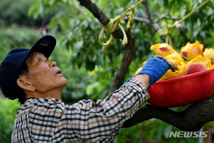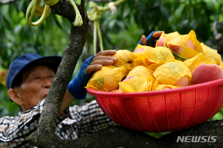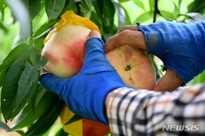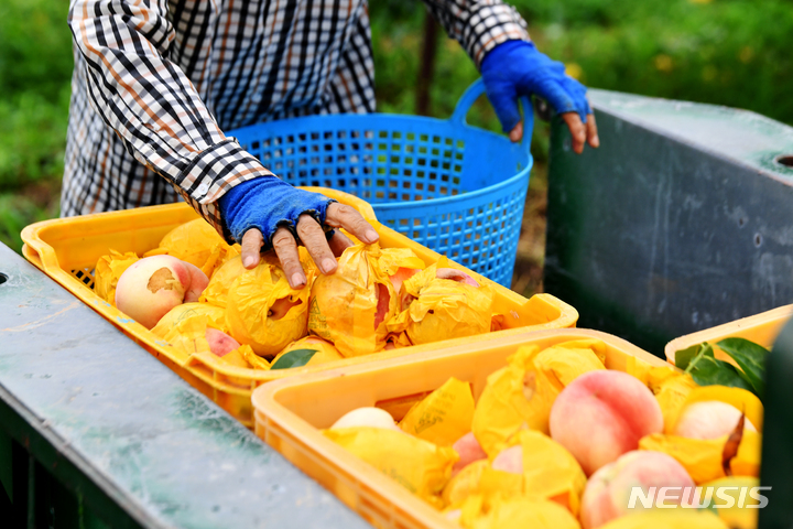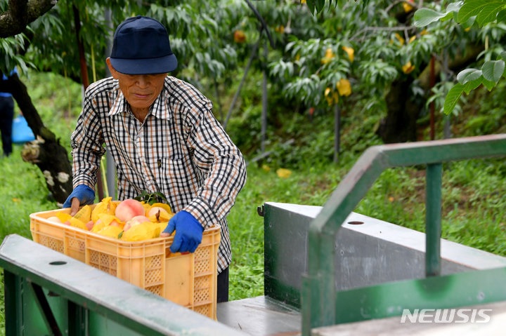 夏を代表する果物、モモの出荷が最盛期を迎えている3日午前、光州市光山区本良洞の果樹園で、採れたてのモモが貯蔵庫へ向かう耕運機に載せられている様子。