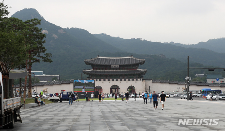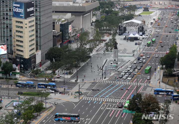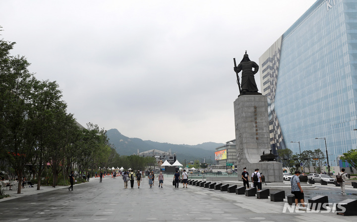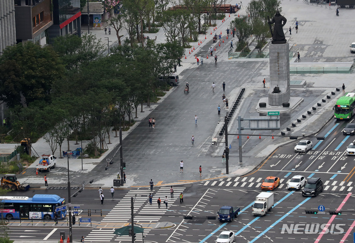 【NEWSIS】6日午前、ソウル市鍾路区の光化門広場を歩く人々。光化門広場は着工から1年9カ月かけて工事を終え、同日、再び開放された。