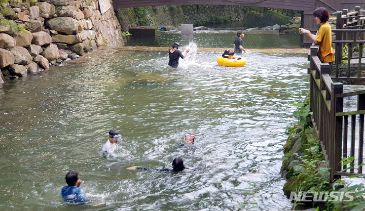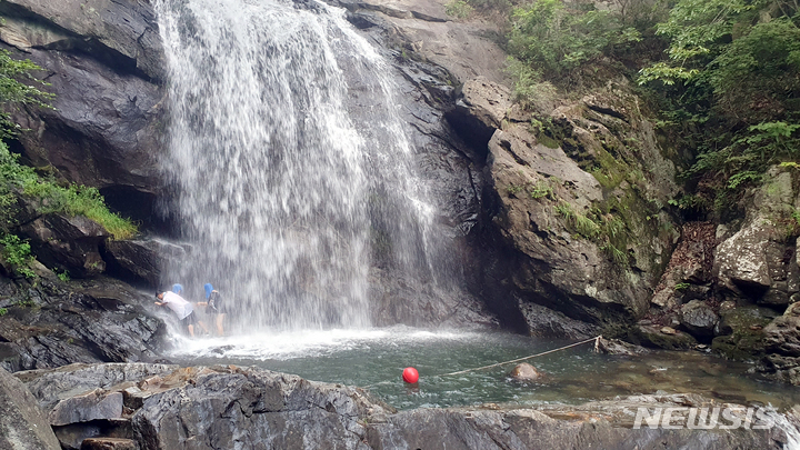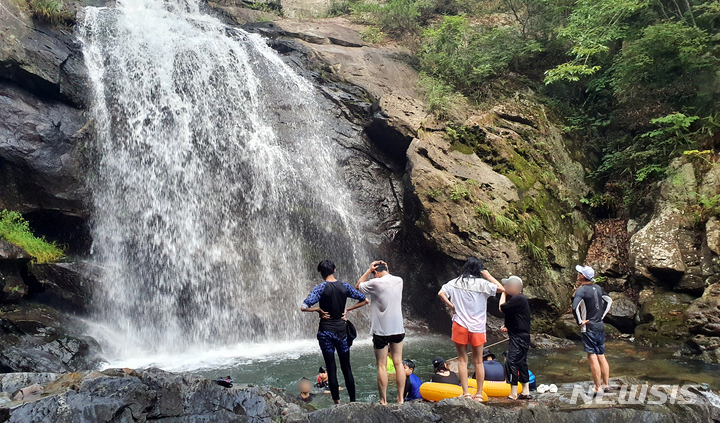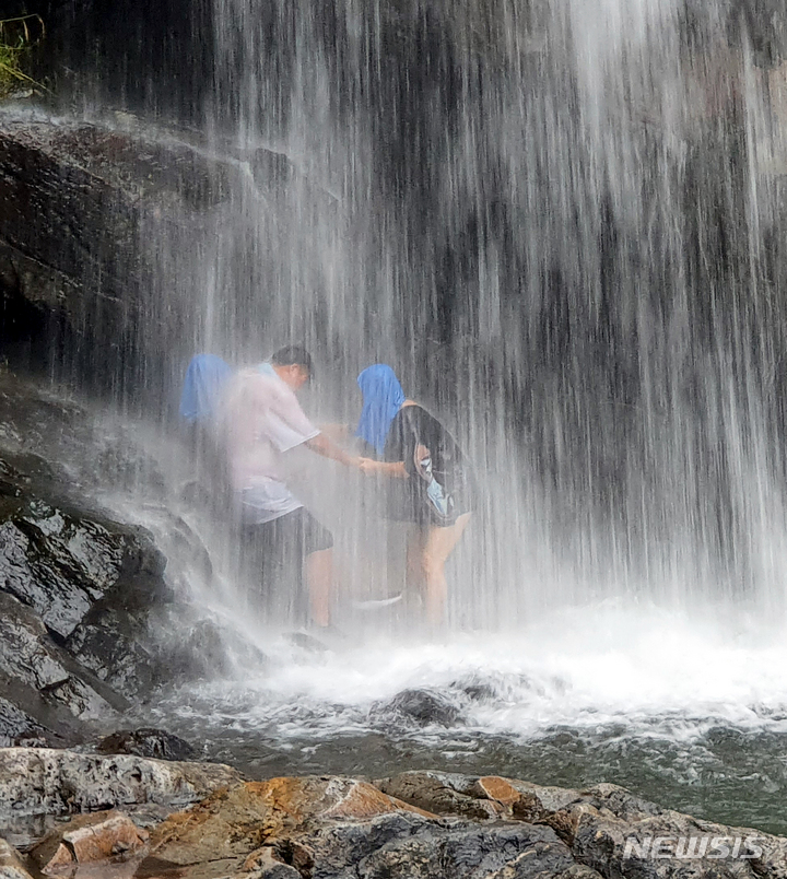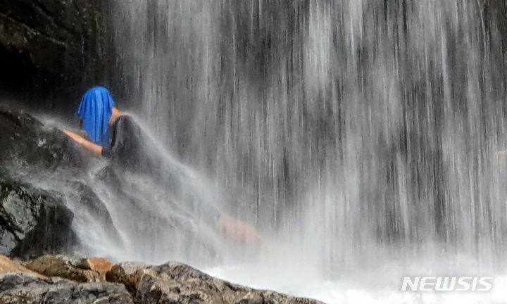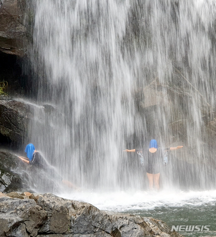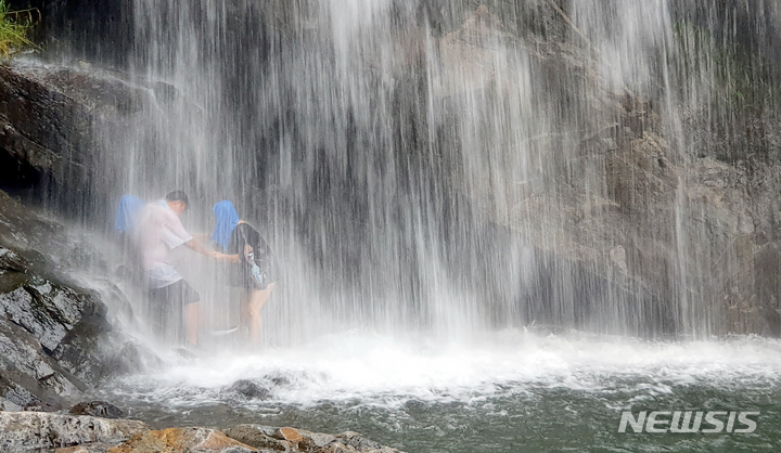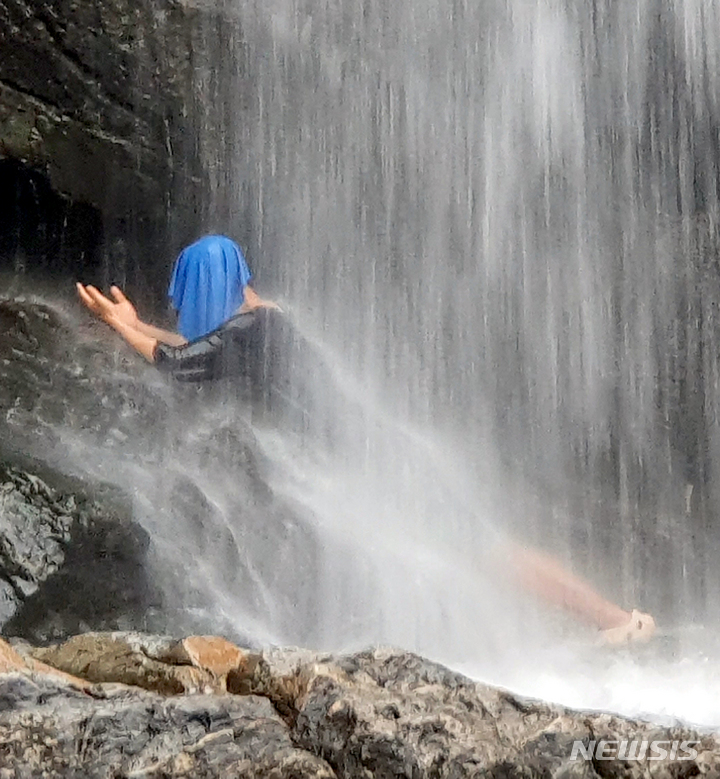 猛暑警報が発令された6日午後、全羅南道求礼郡山洞面水基里の「水落瀑布」で、滝に打たれて暑さを紛らわせる避暑客の様子。