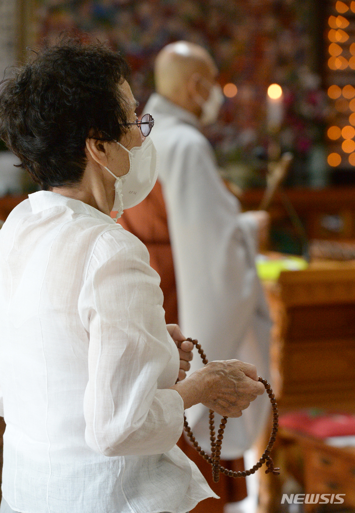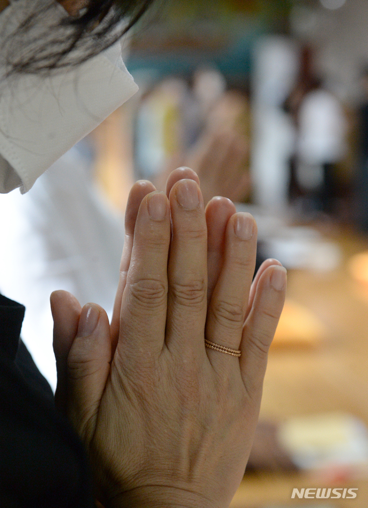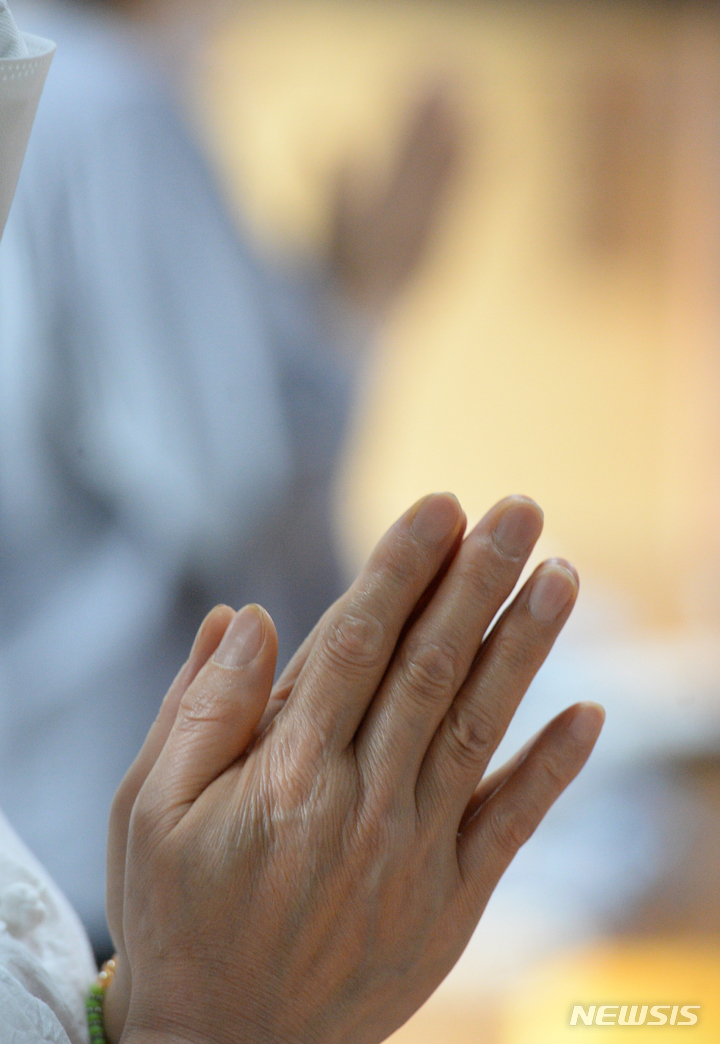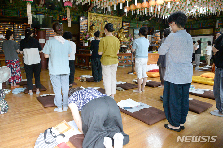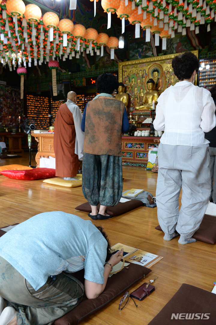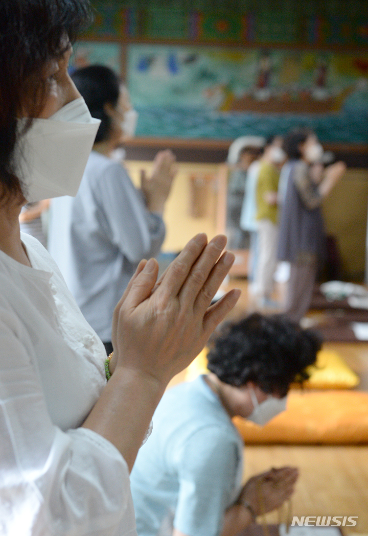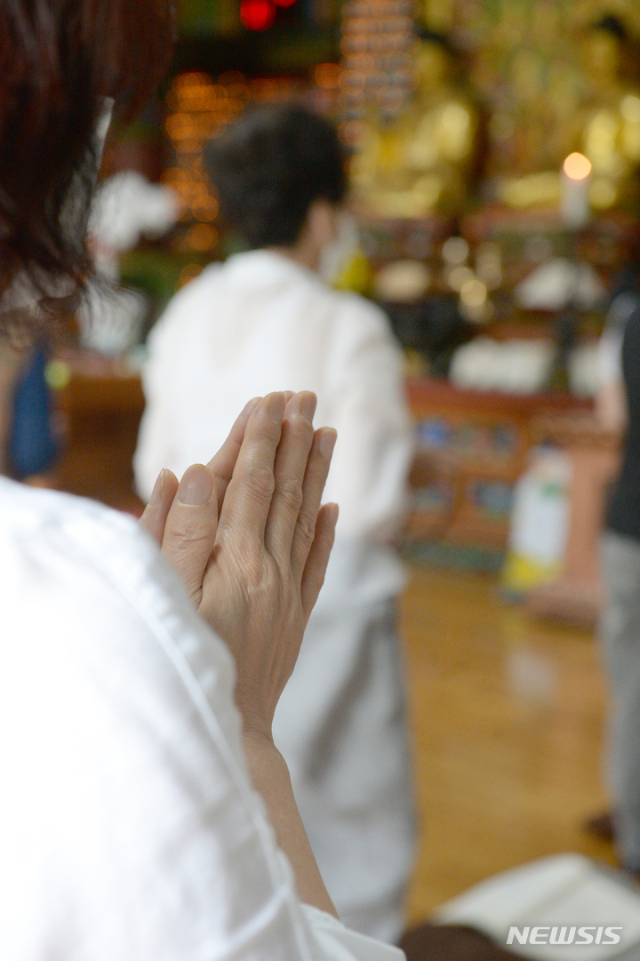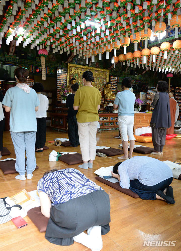 2023年度大学修学能力試験(修能。大学入学共通テストに相当)まであと100日となった9日午前、蔚山市南区の浄土寺で、受験生の子を持つ親たちが大学合格と高得点を願う祈祷を行っている様子。