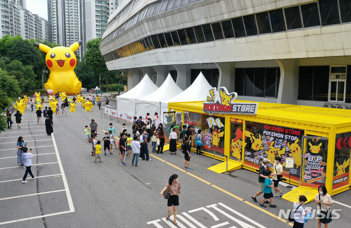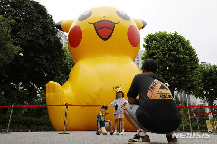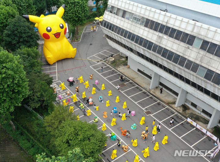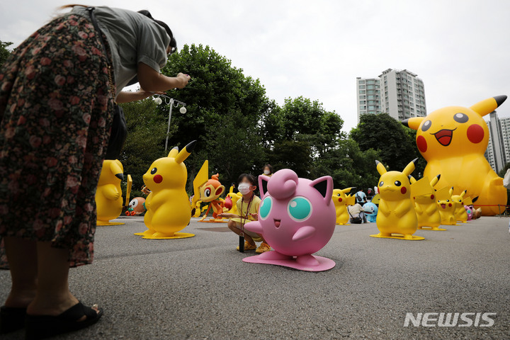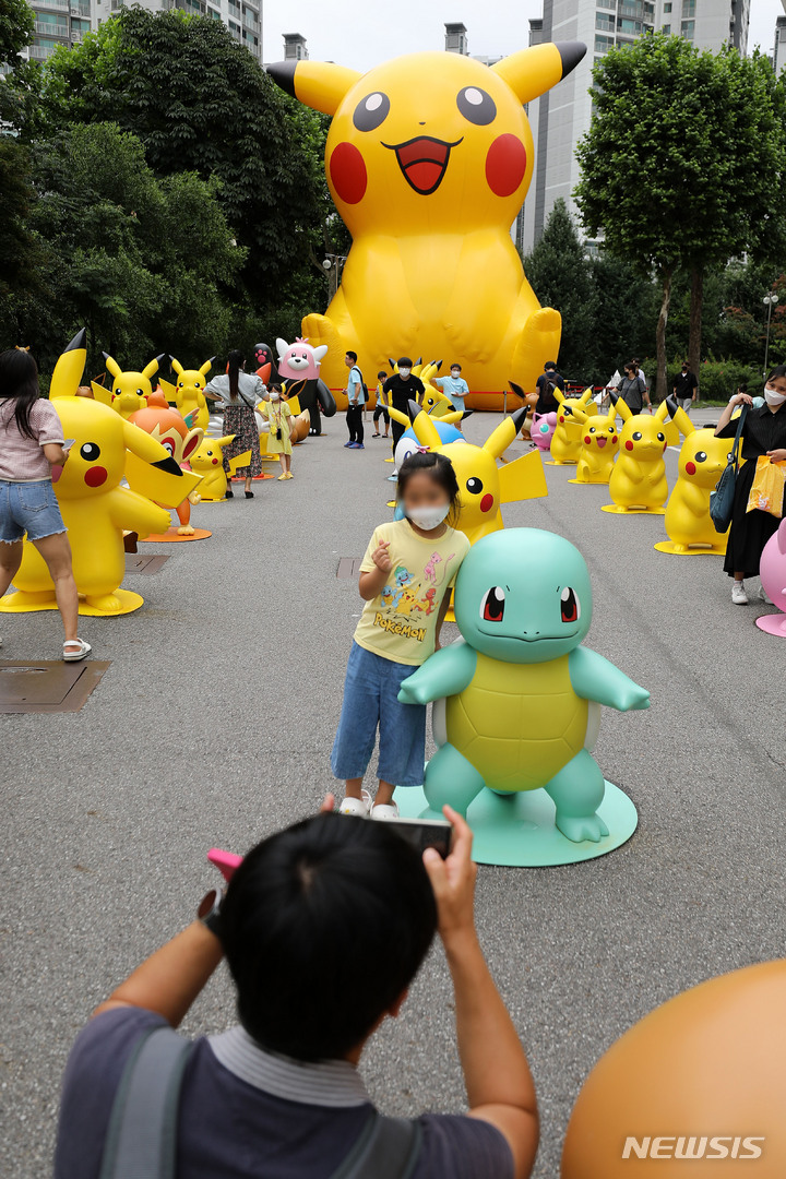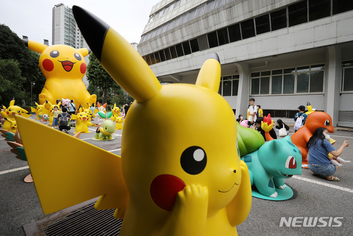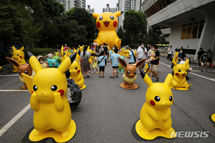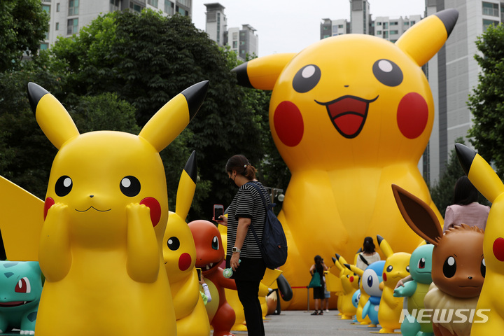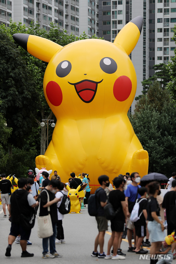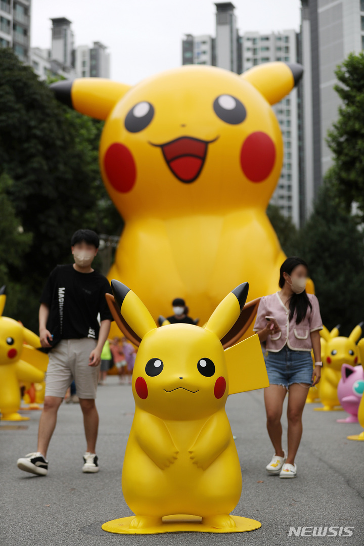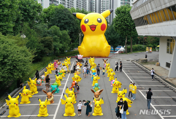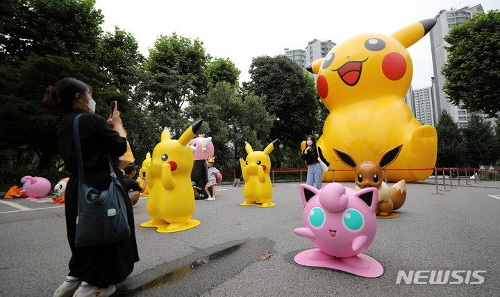 ポケモンフェスティバル2022開催初日の10日午後、ソウル市松坡区の蚕室第1水泳場前に、超大型のピカチュウをはじめ様々なポケモンの模型が展示されている様子。