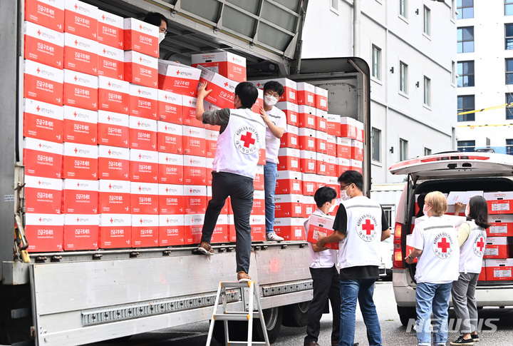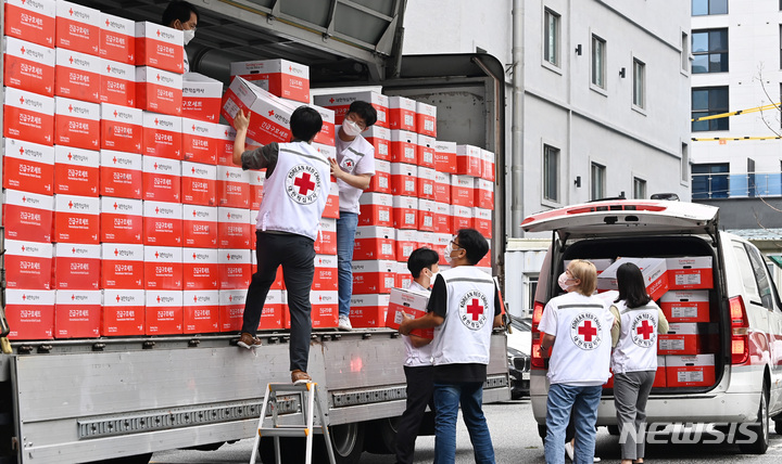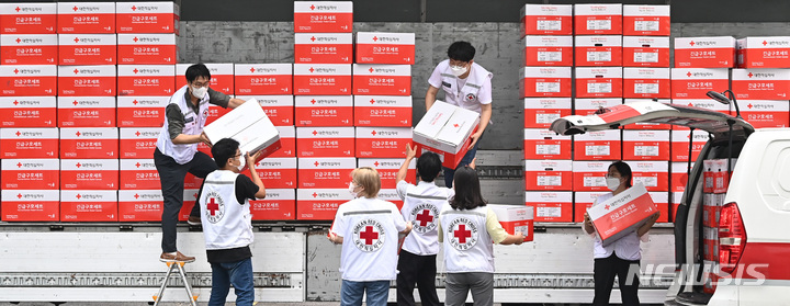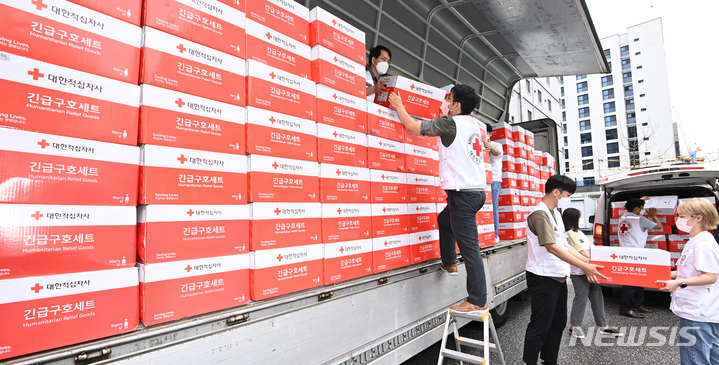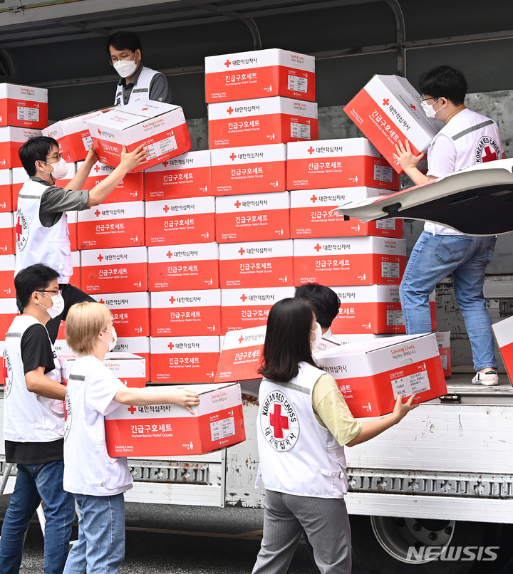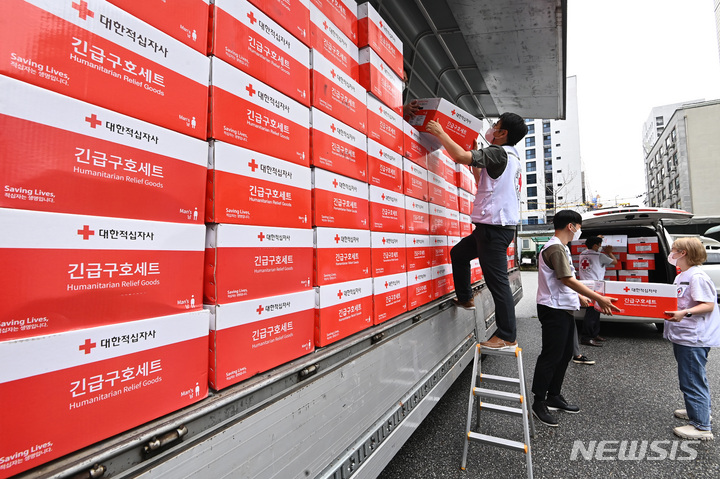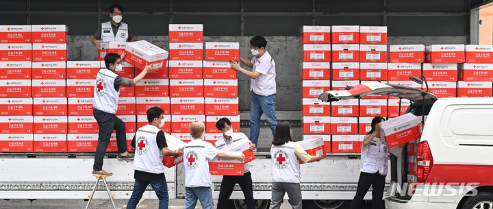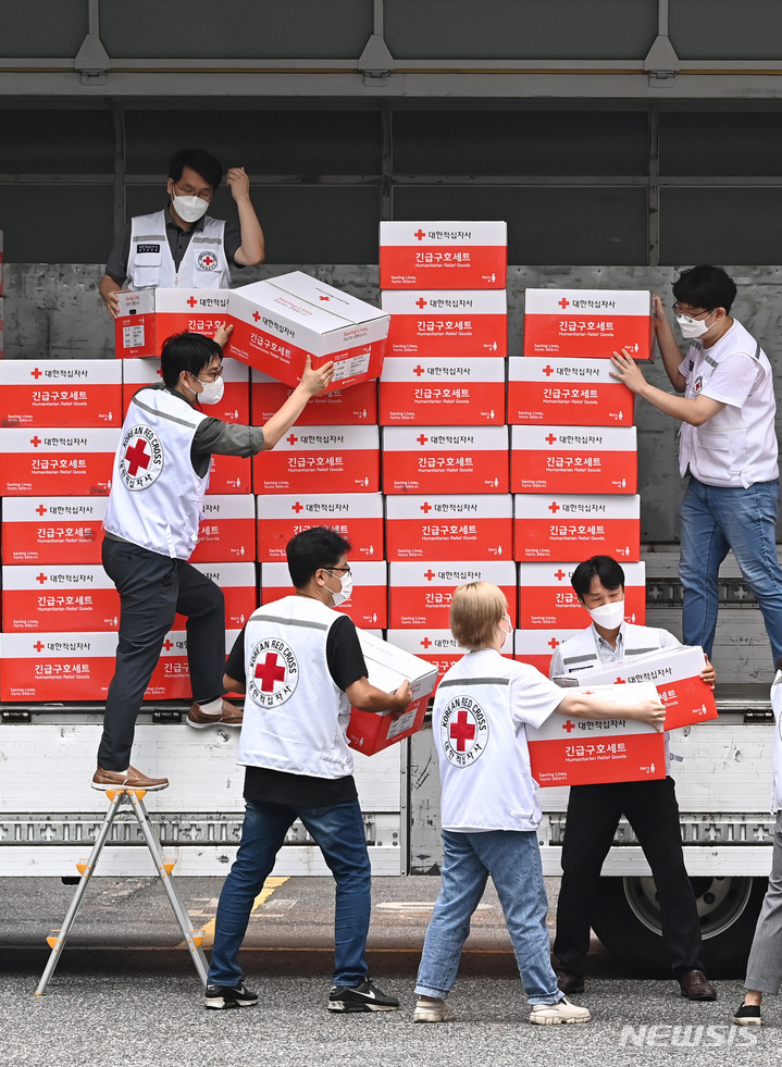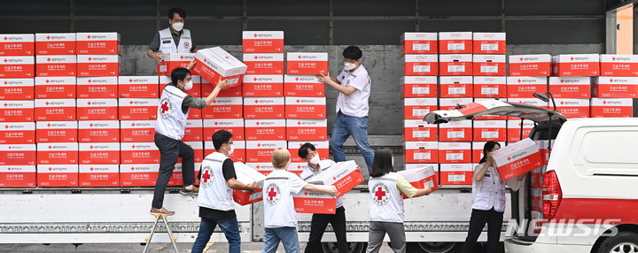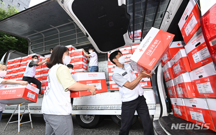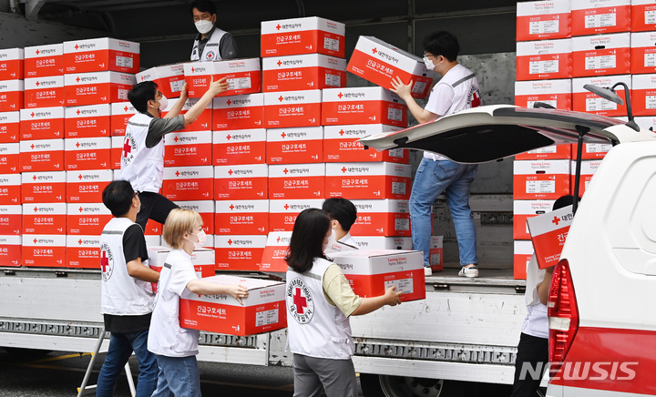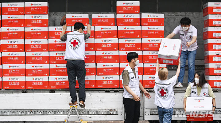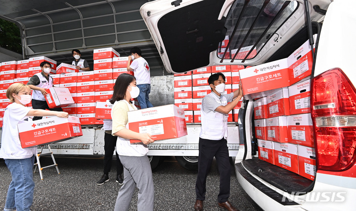 首都圏など韓国中部地方に降った集中豪雨で被害が続出している11日午前、京畿道水原市勧善区の大韓赤十字社京畿道支社で、被災者に届ける緊急救護セットを車に積み込んでいる職員らの様子。