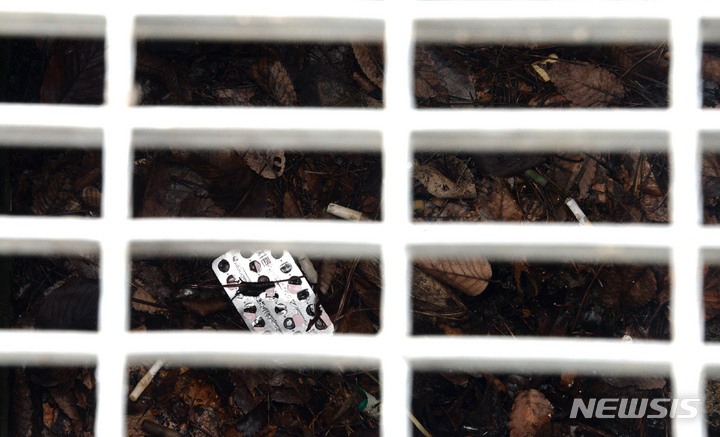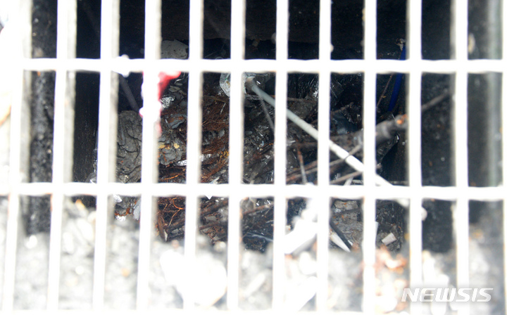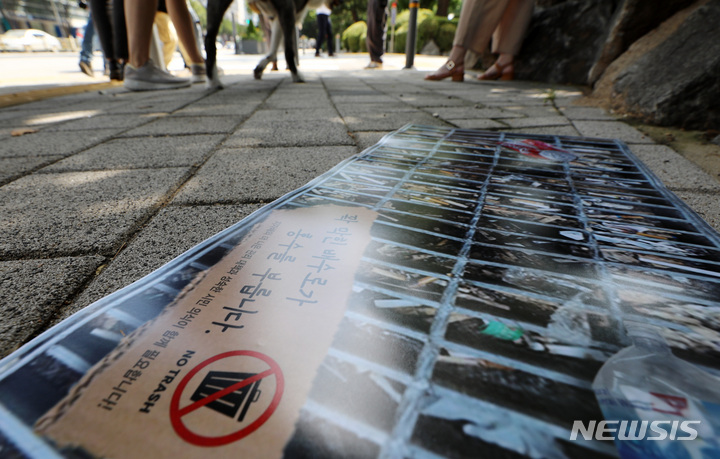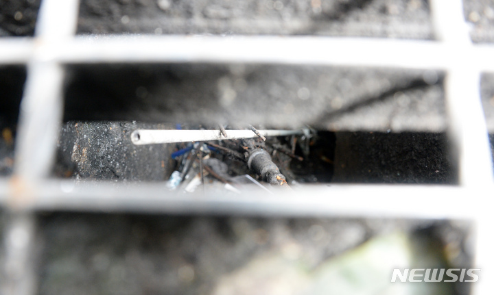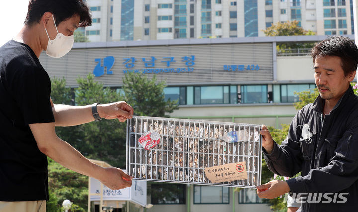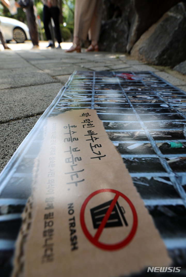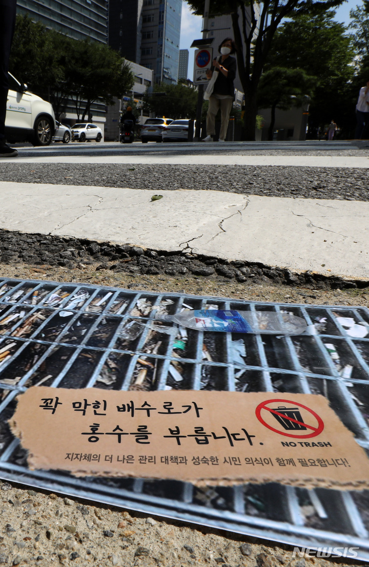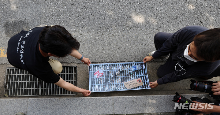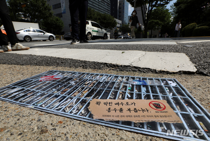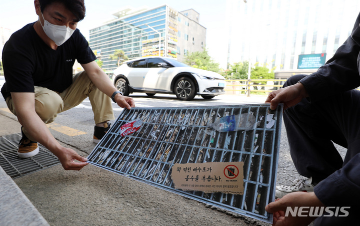 イ・ジェソク広告研究所のイ・ジェソク代表と青年活動家たちが12日午前、ソウルの江南区庁前で「びっしりと埋まった排水溝が洪水を呼びます」キャンペーンを行っているところ。
