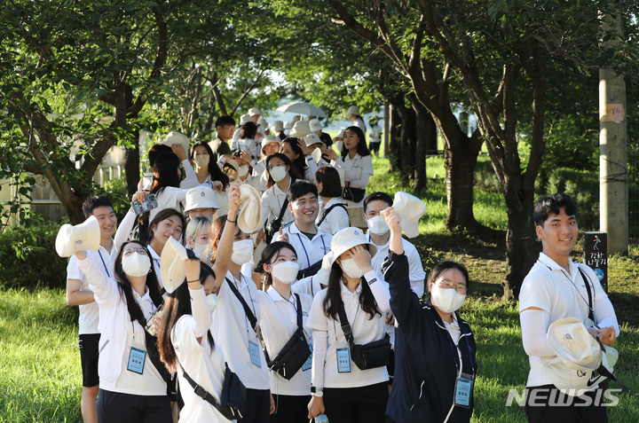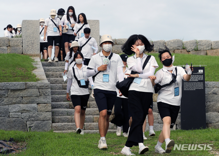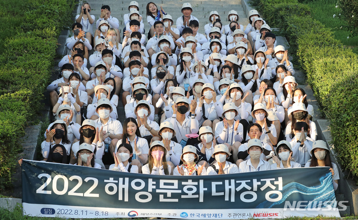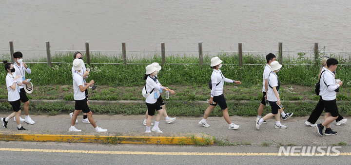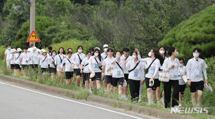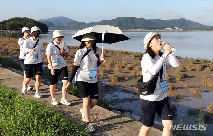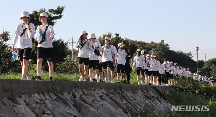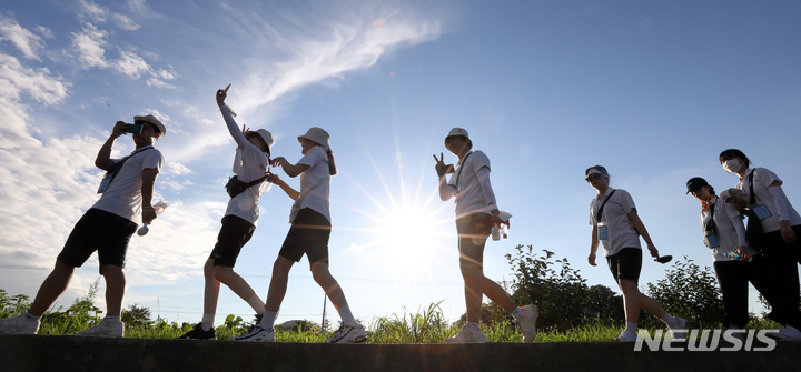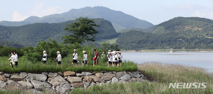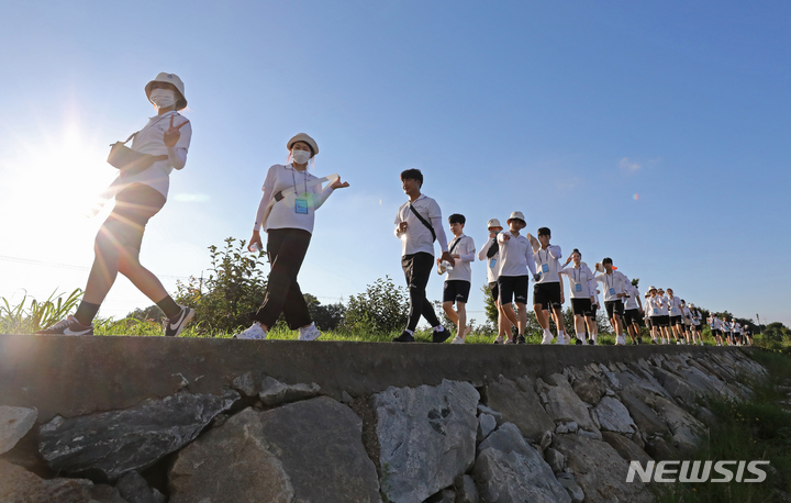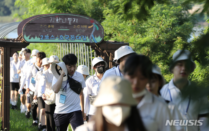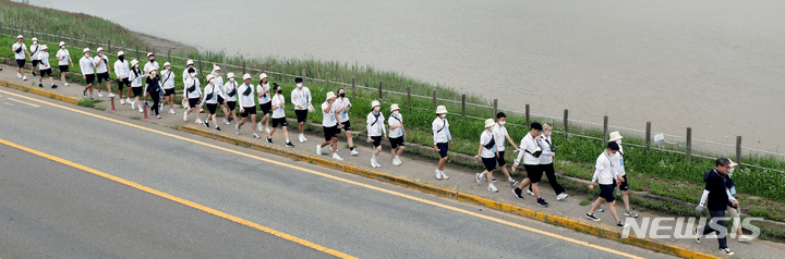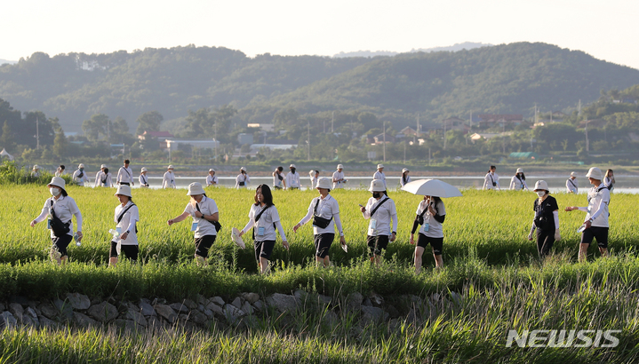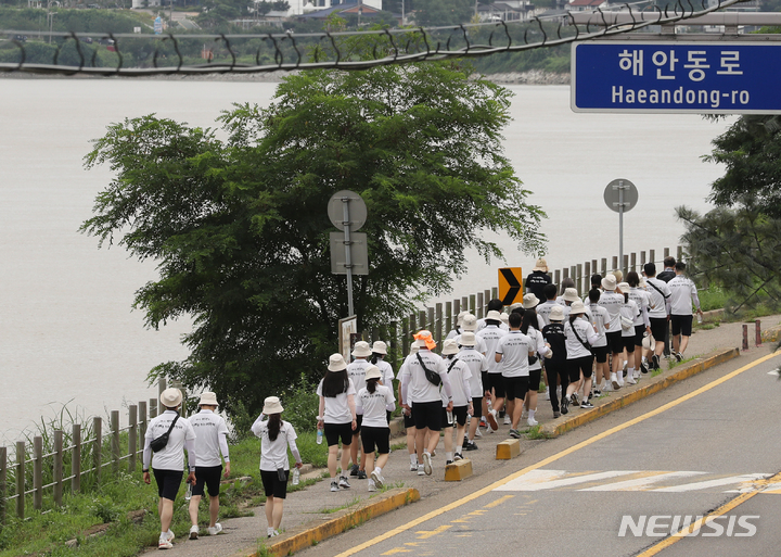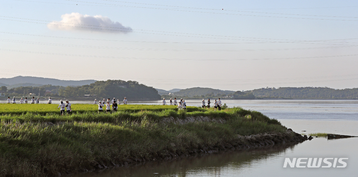 「2022年大韓民国海洋文化大長征」の参加隊員たちが11日午後、江華島と本土の金浦市を隔てる狭い海峡「塩河」に沿って、甲串トンデを出発して広城堡に至る徒歩大長征を行っているところ。