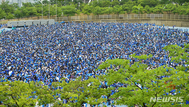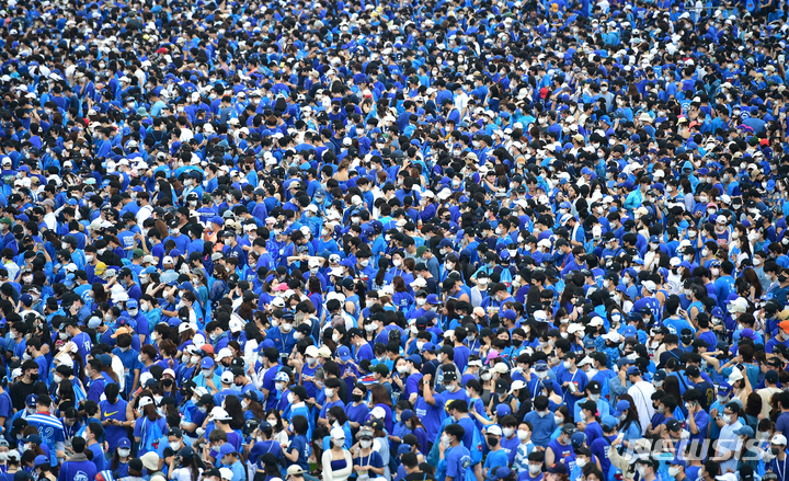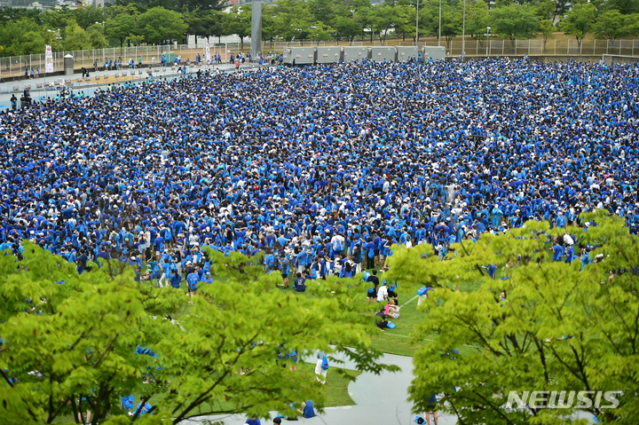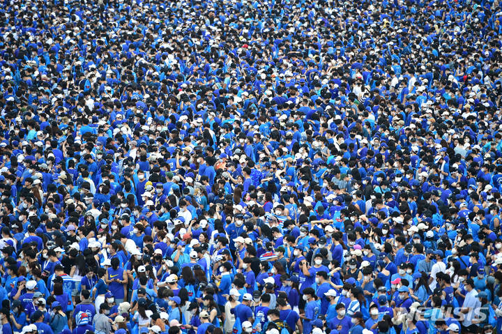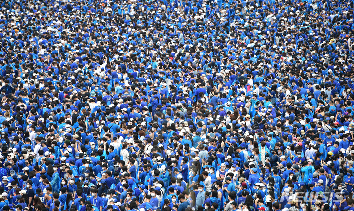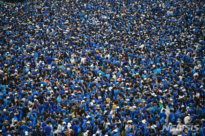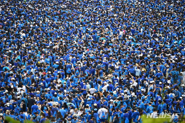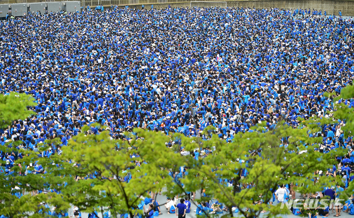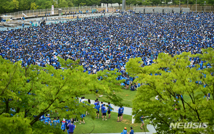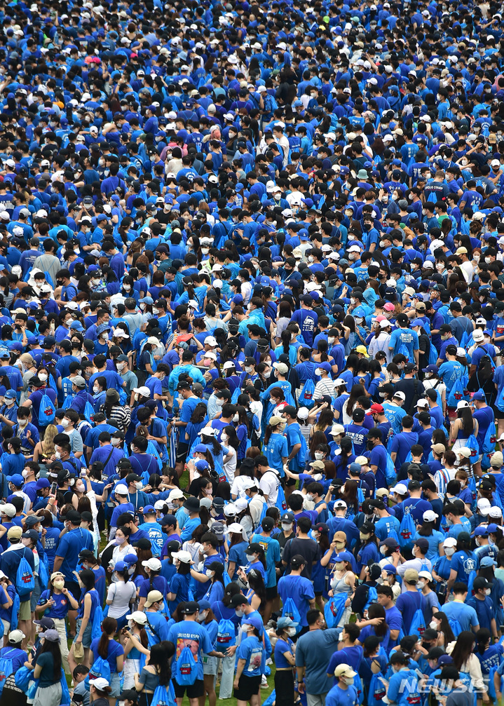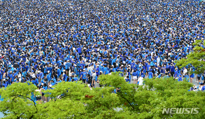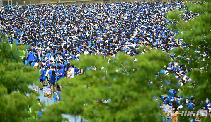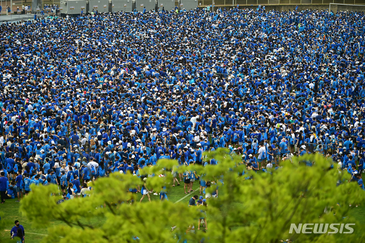 13日午後、大邱市寿城区の大邱スタジアムで開かれる「PSYびしょぬれショー」にやって来た観客が入場を待っているところ。