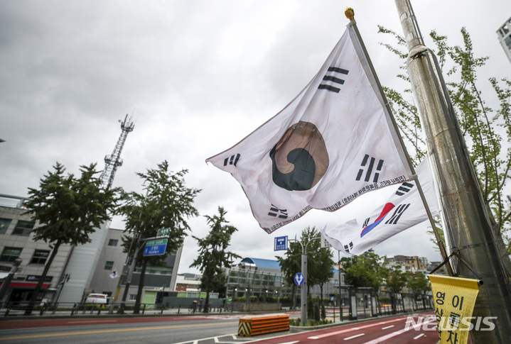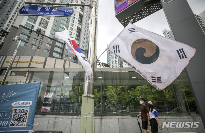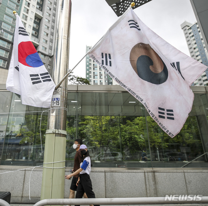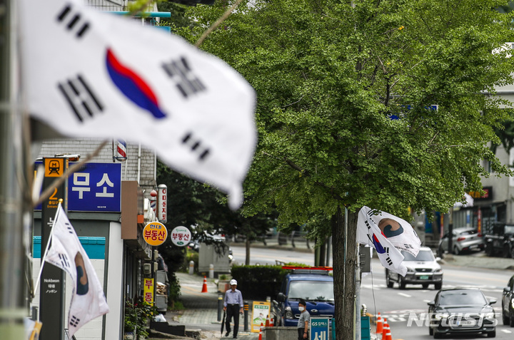 【NEWSIS】77回目の光復節(日本による植民地支配からの開放を記念する日)の15日午前、ソウル市恩平区の道路に「津寬寺太極旗」が掲げられた。津寬寺太極旗は僧侶ペク・チョウォル師が独立運動時に使用した太極旗で、2009年5月26日に津寬寺七星閣の解体補修工事で発見され、宝物第2142号に指定された。